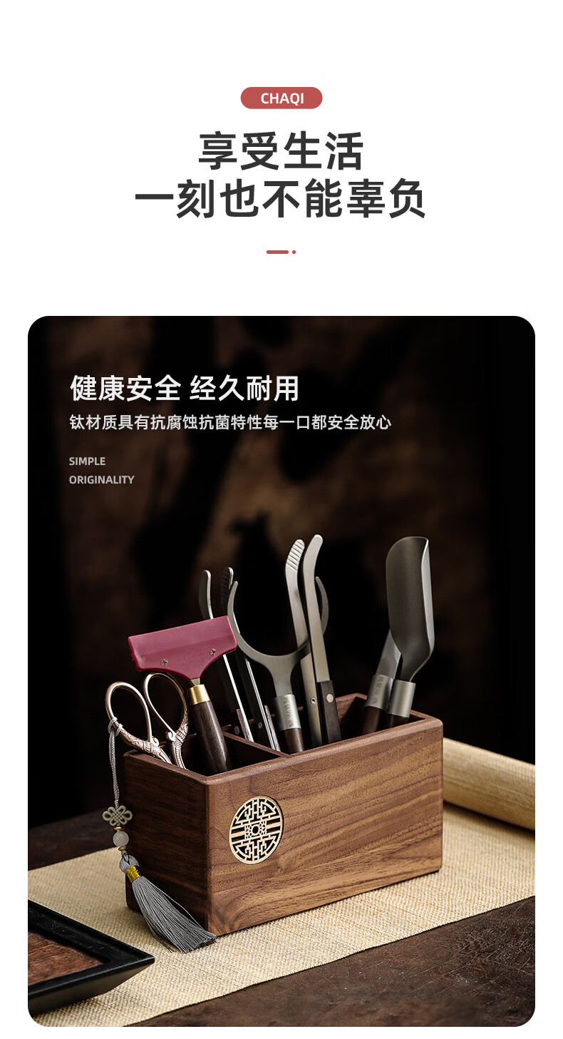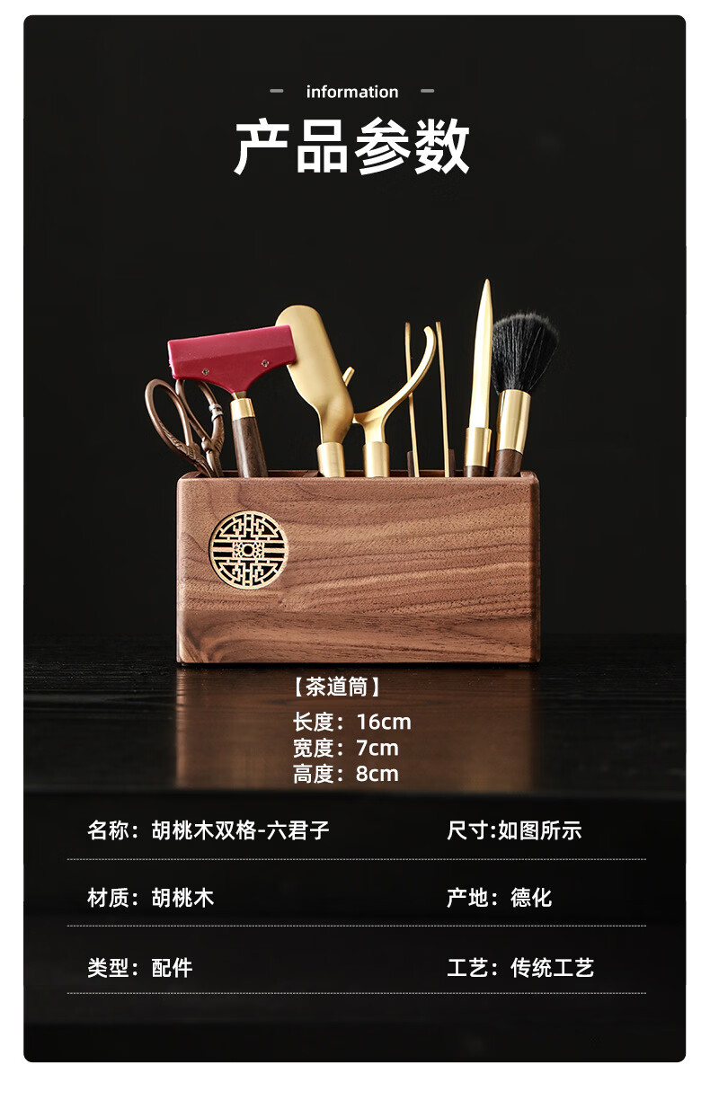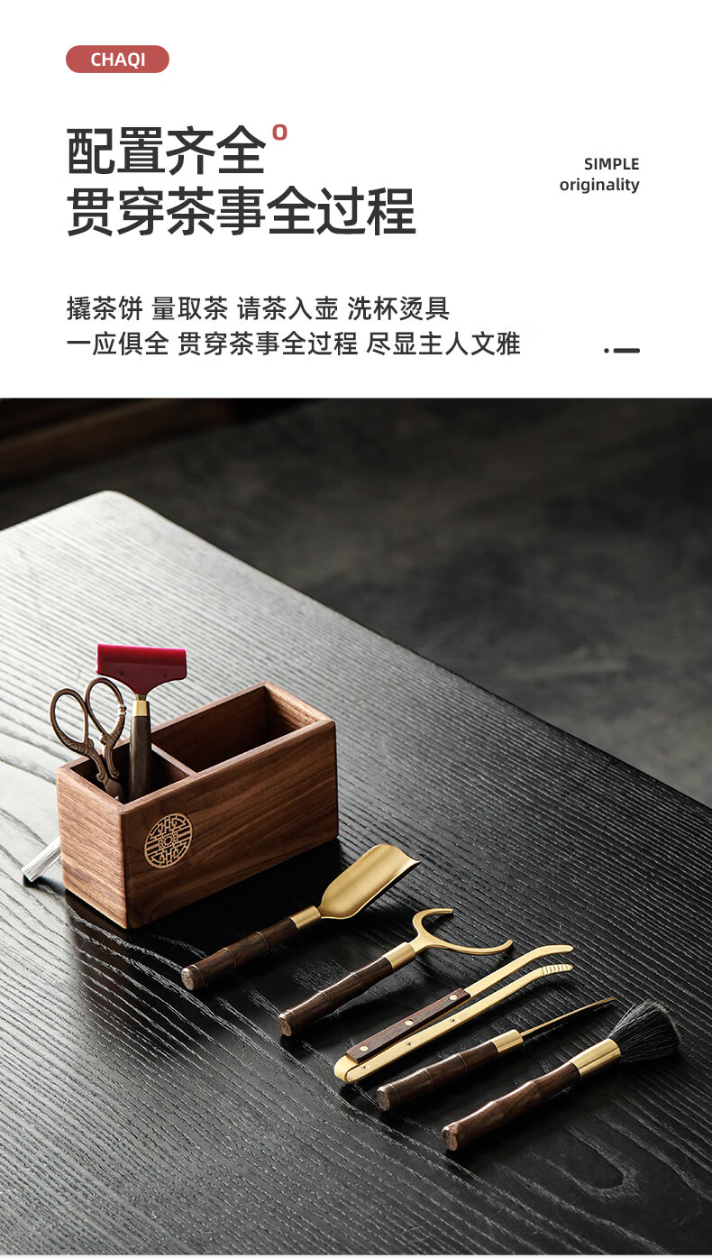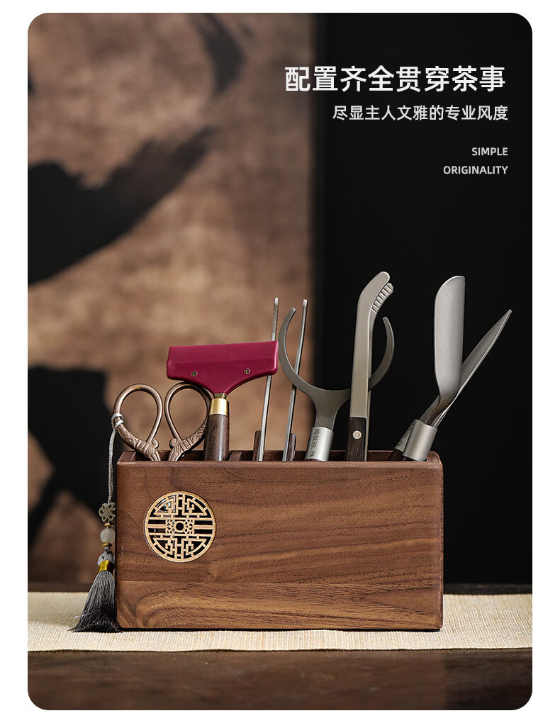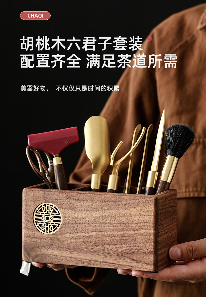 语森忆胡桃木六君子收纳桶套装茶道用品大全茶剪茶刀养壶笔家用茶具配件 双格茶道桶+黄铜竹节配件