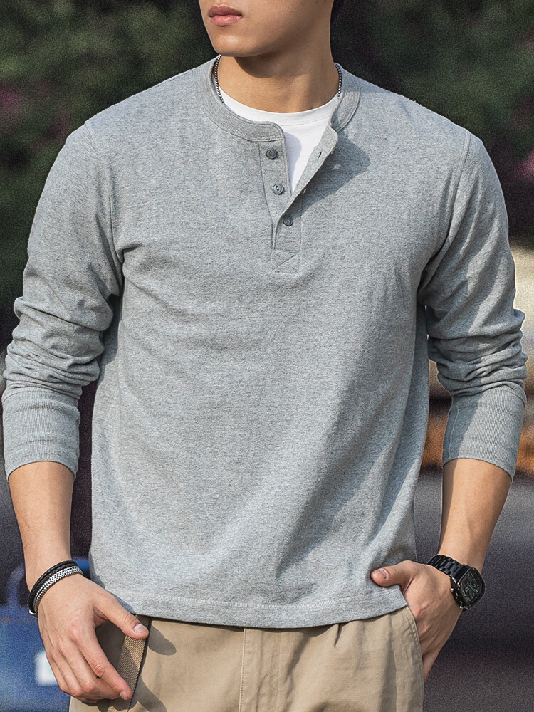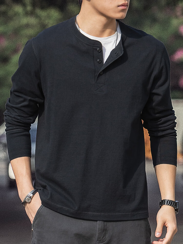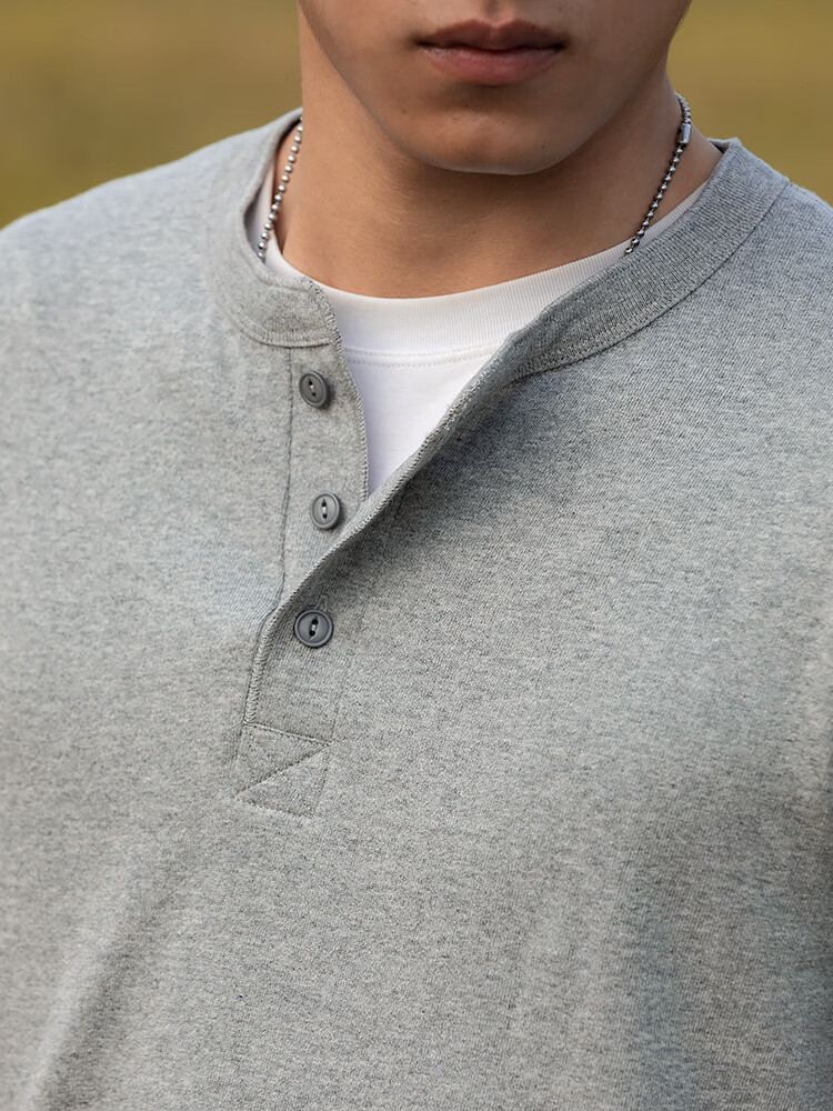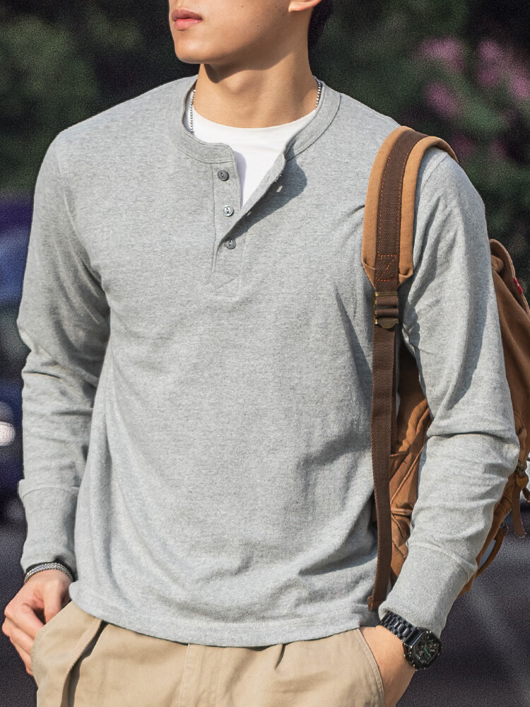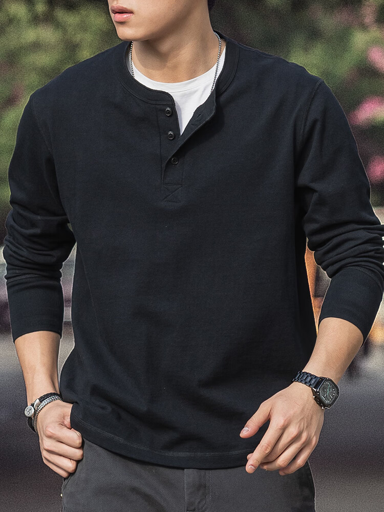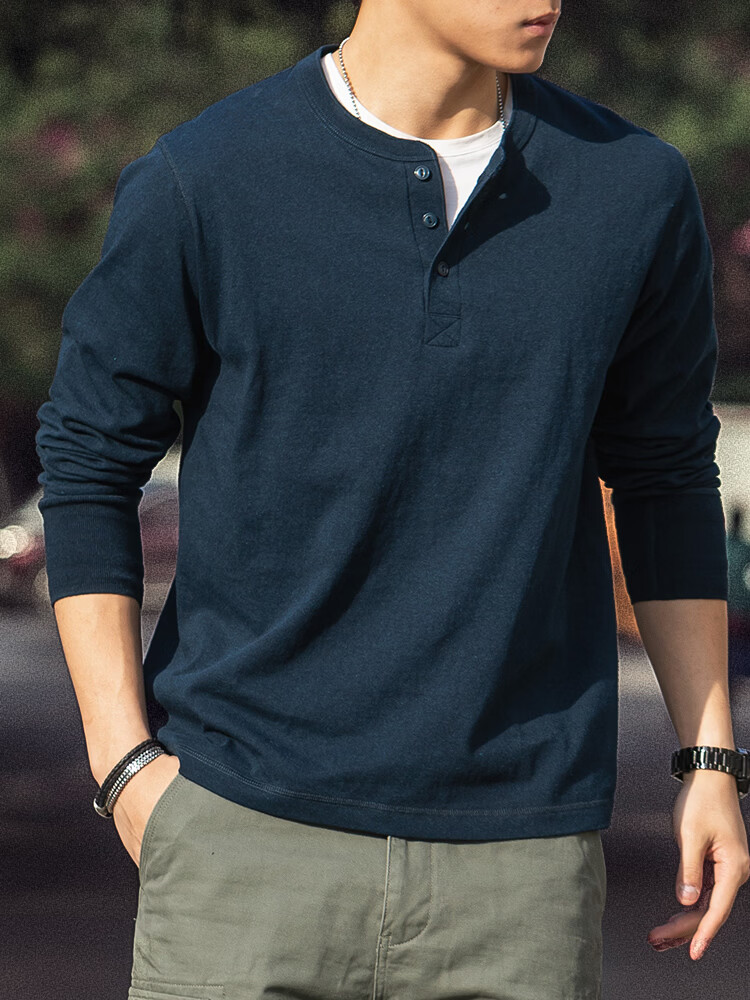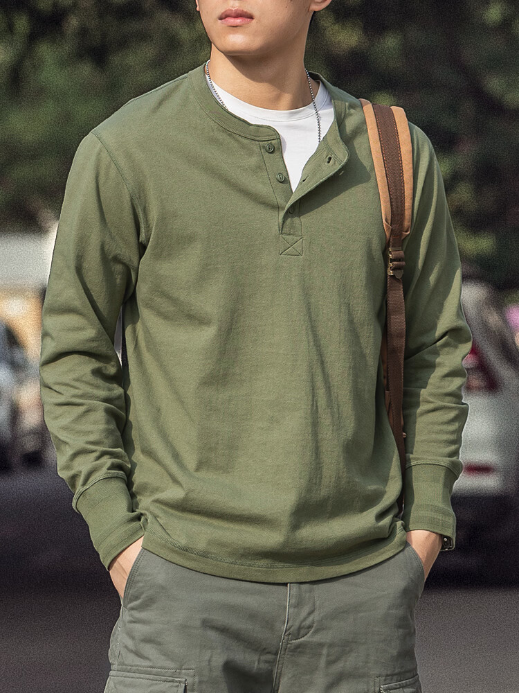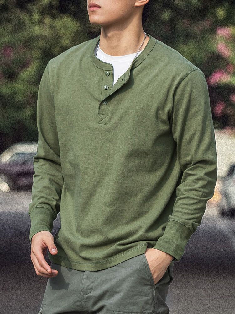 海行户外美式复古亨利衫长袖t恤男2025春季纯棉侧身无缝亨利领打底衫 军绿色 L (参考140-155斤)