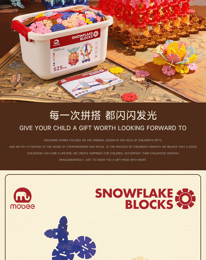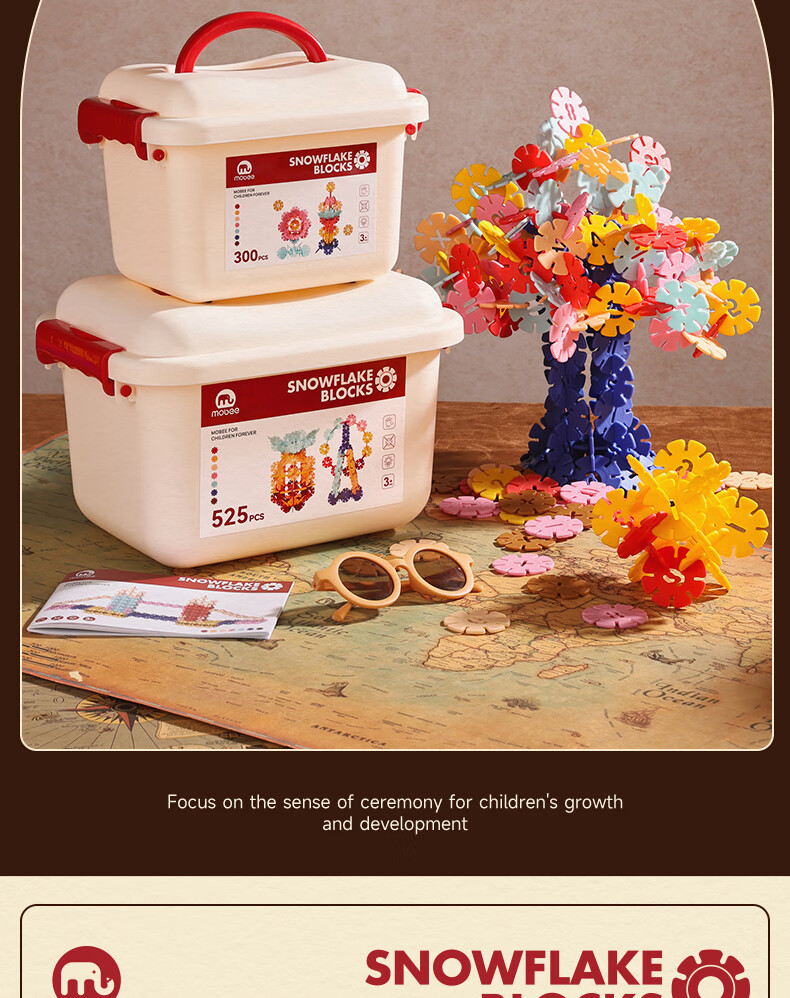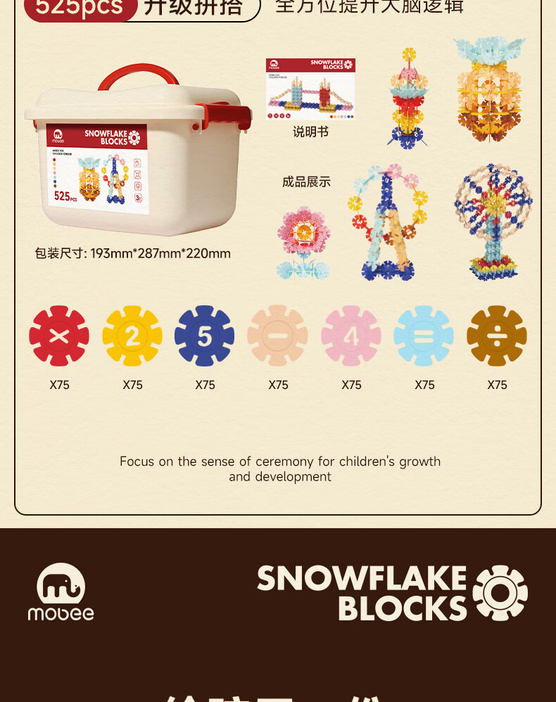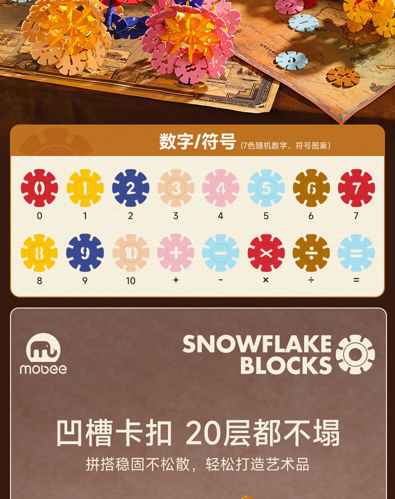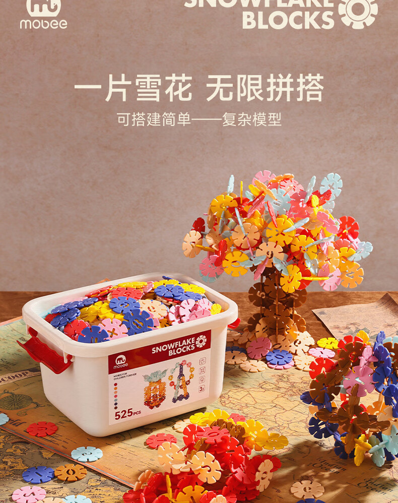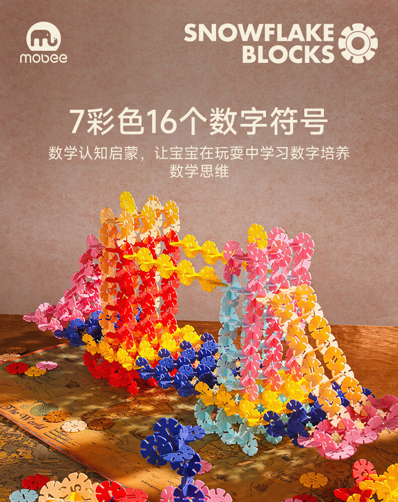 mobee雪花片儿童积木玩具立体拼图大号3-6diy益智手工装拼插新年节礼物 数字雪花片【525片】收纳箱装 色彩缤纷绚丽-光滑无刺-数字拼插