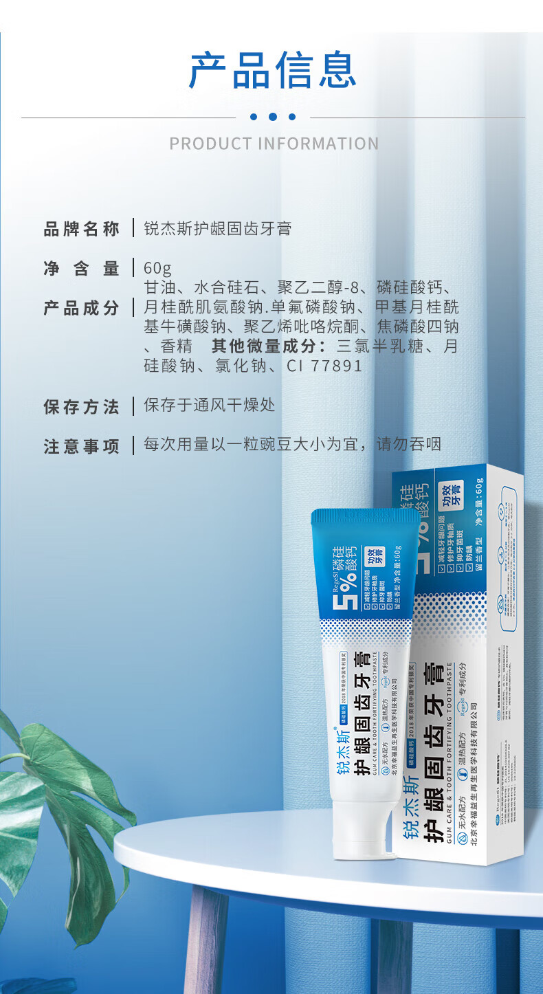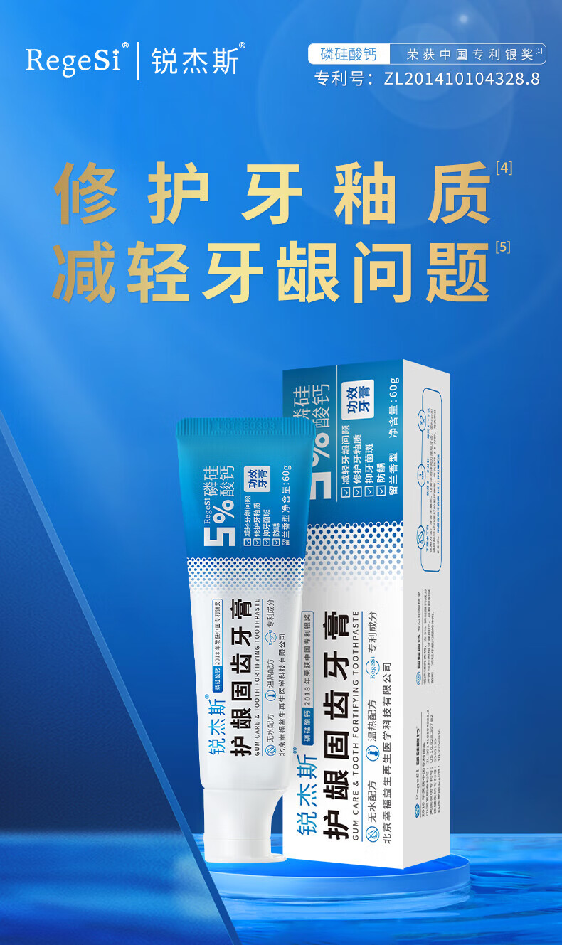 锐杰斯护龈固齿健齿牙膏RegeSi磷硅酸钙呵护牙釉牙龈问题保护牙釉质 60g*3支 护龈固齿