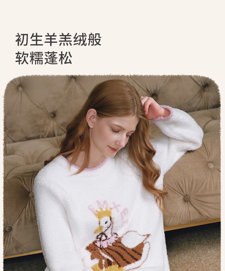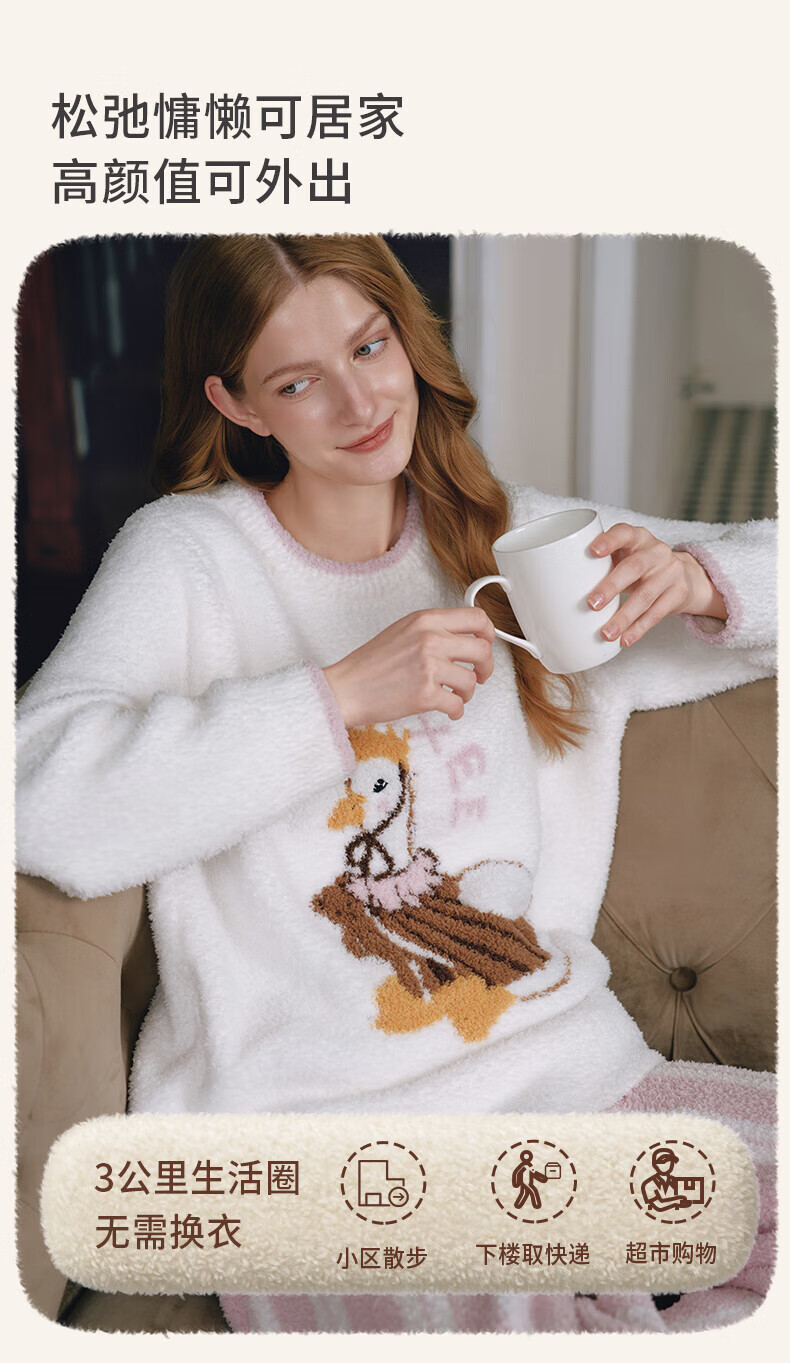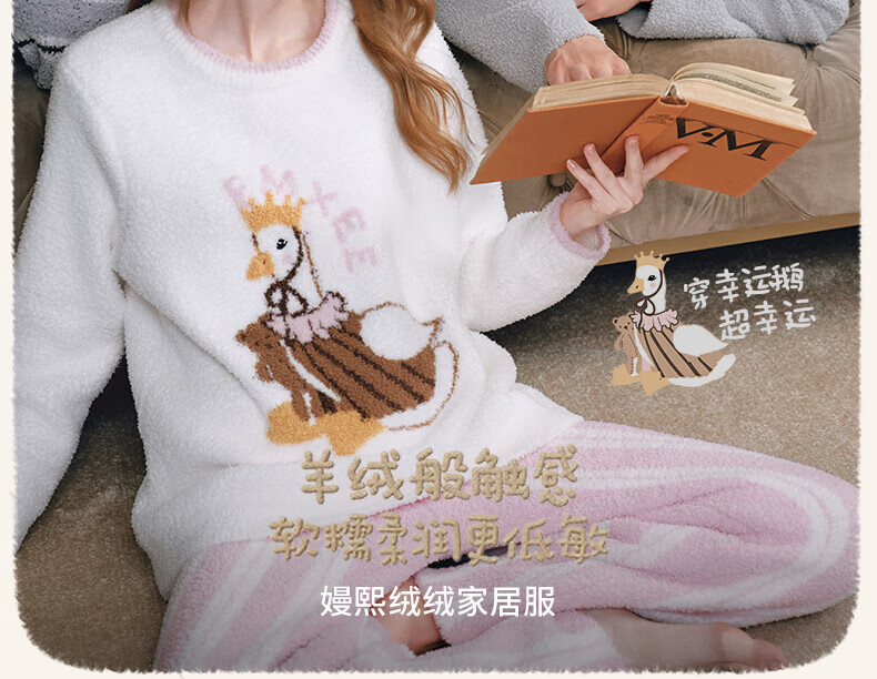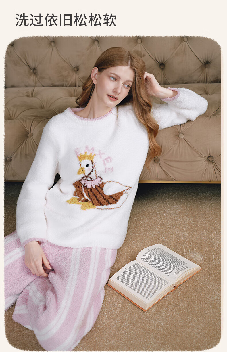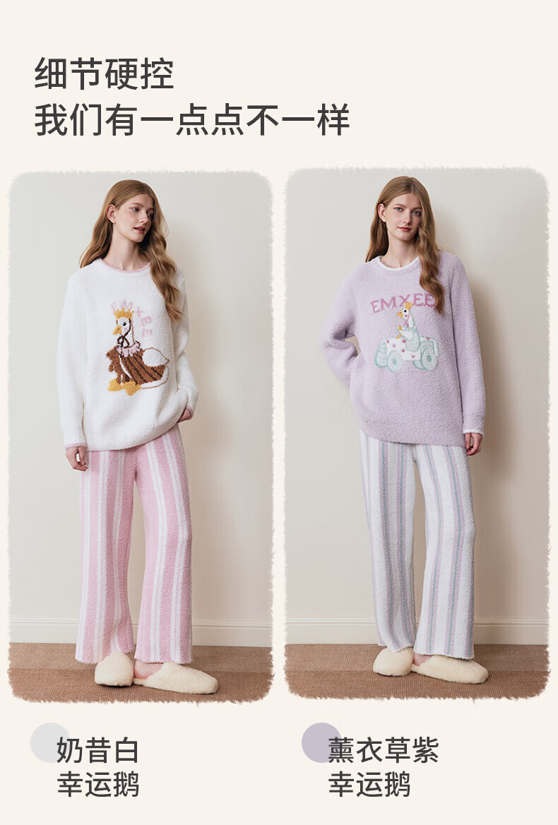 嫚熙(EMXEE)幸运鹅秋冬牛油果半边绒女士睡衣情侣加绒家居服套装2025新款 圆领-幸运鹅(奶昔白) S