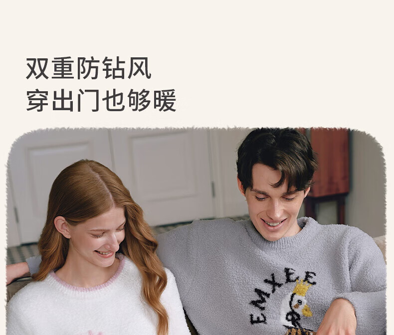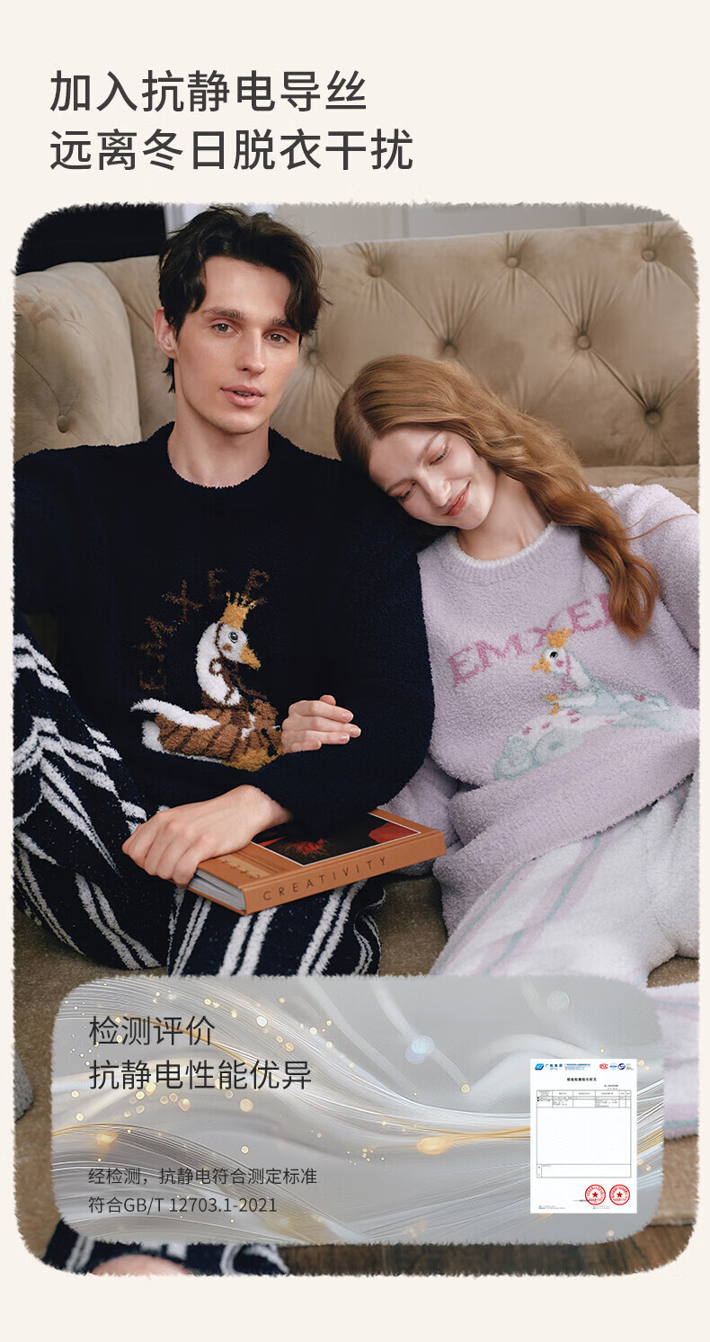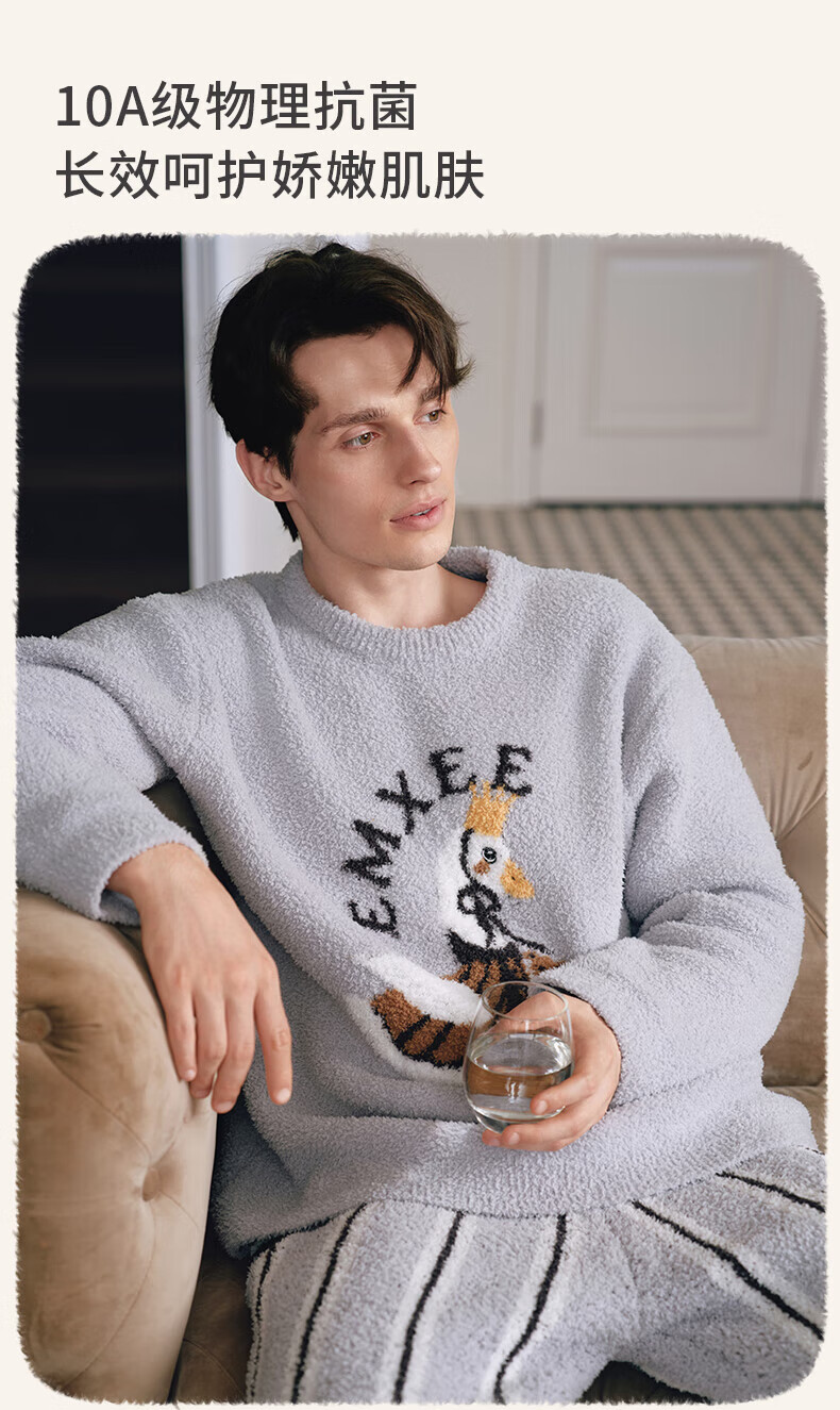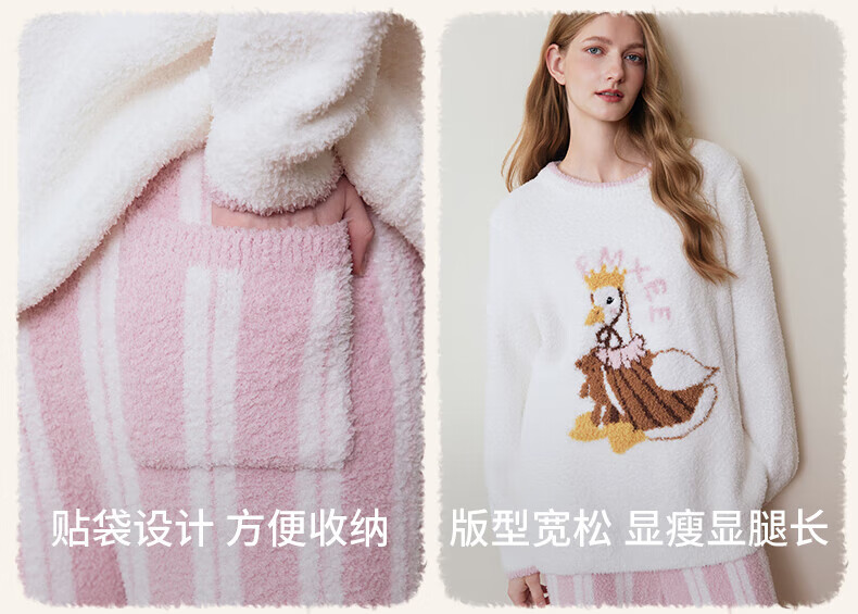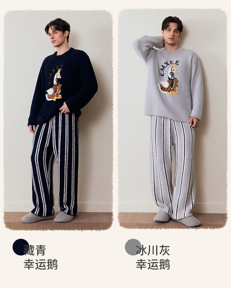嫚熙(EMXEE)幸运鹅秋冬牛油果半边绒女士睡衣情侣加绒家居服套装2025新款 圆领-幸运鹅(奶昔白) S