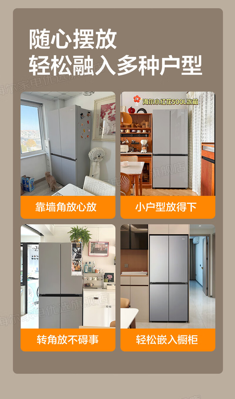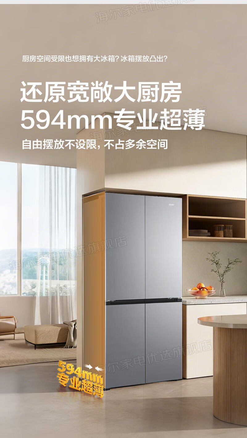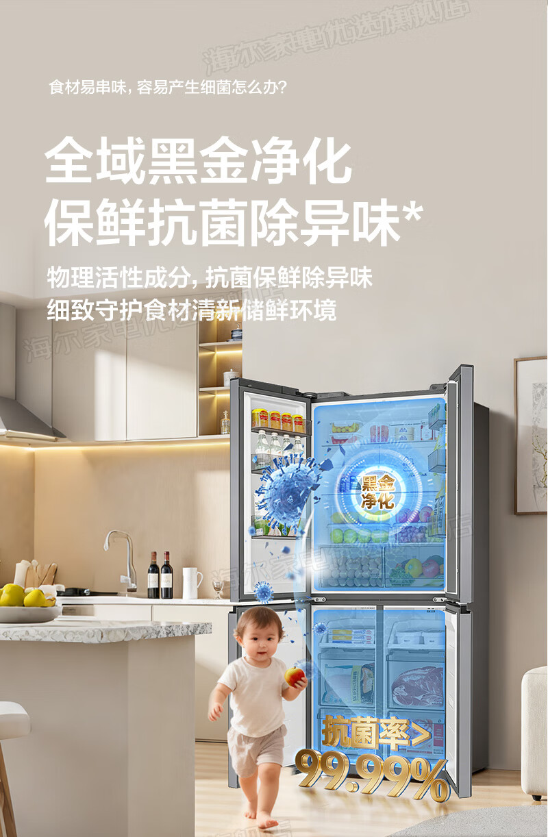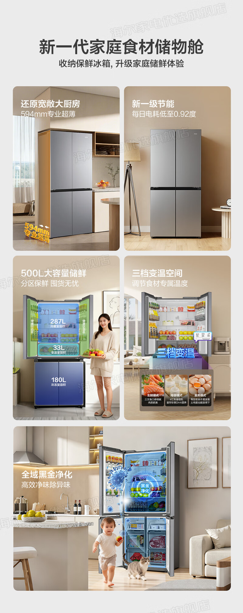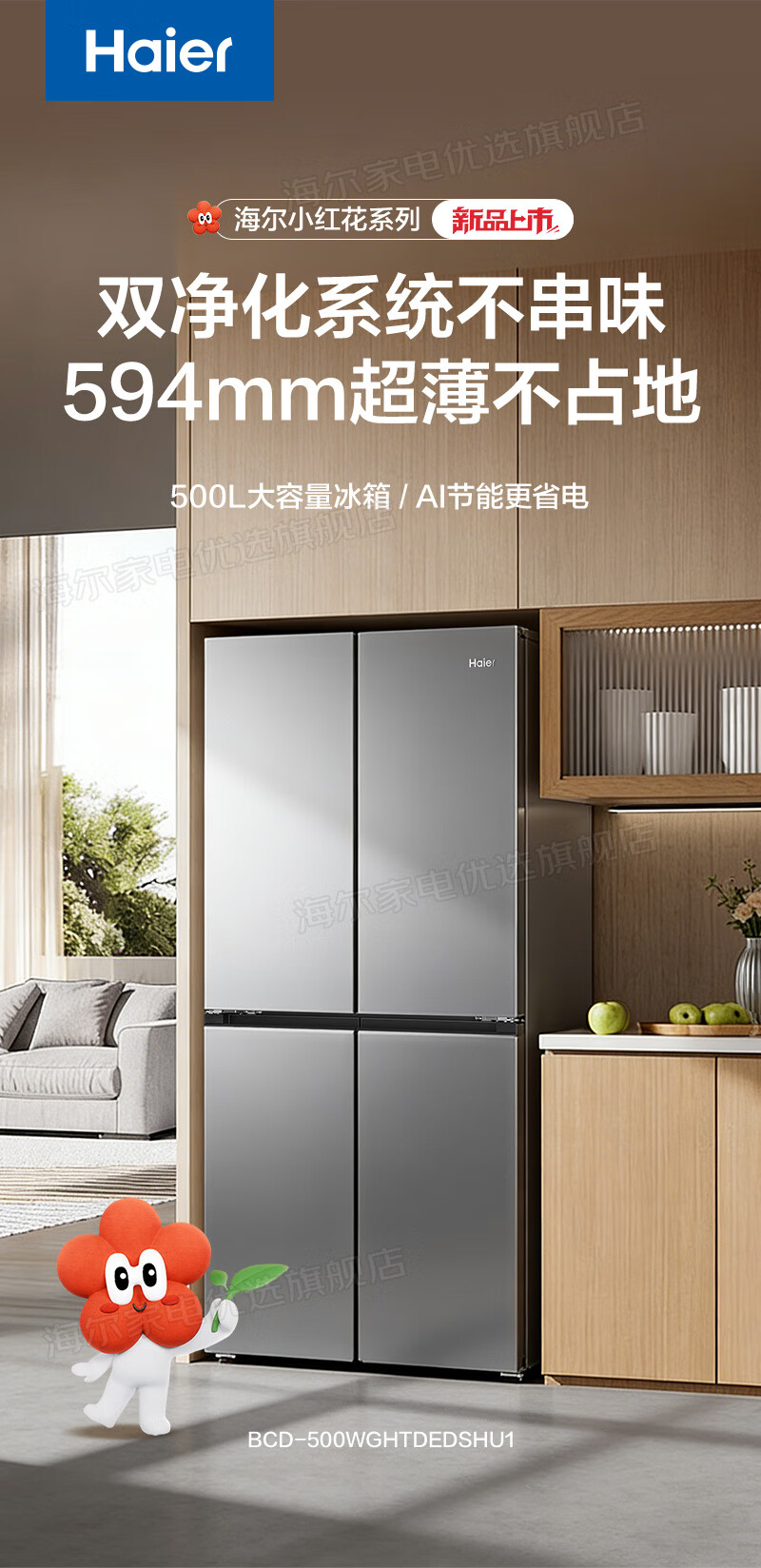 海尔冰箱十字四开门500升小红花系列 双开门深度60cm以下超薄一级能效大容量无霜电冰箱家用 以旧换新 全域黑金净化丨594mm超薄丨AI变频科技 【小红花系列】2026年新款丨500升