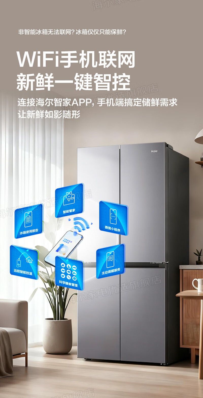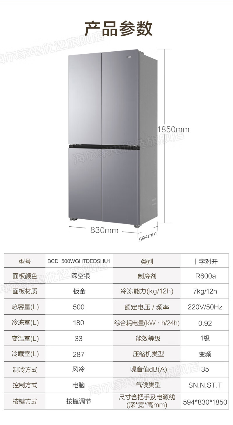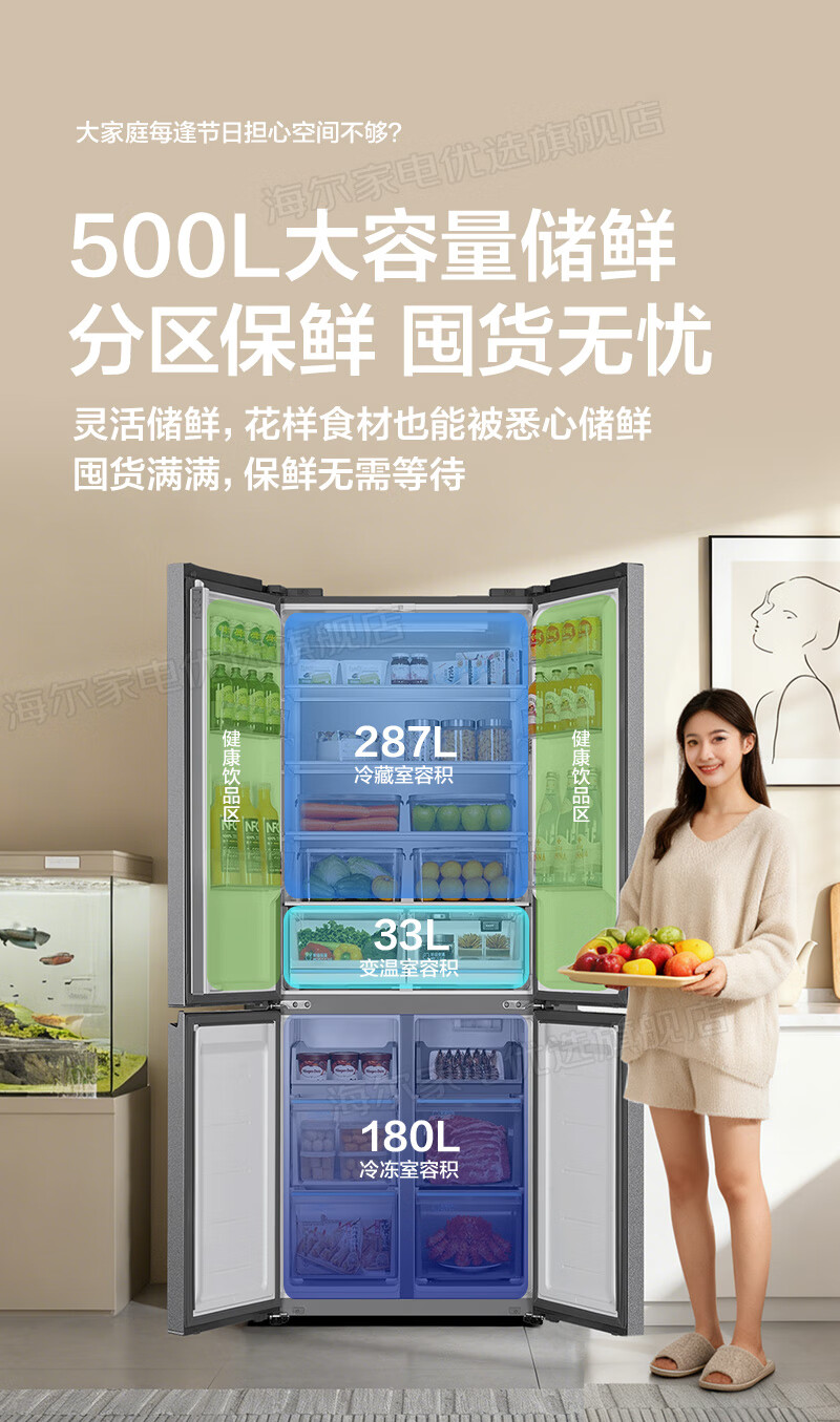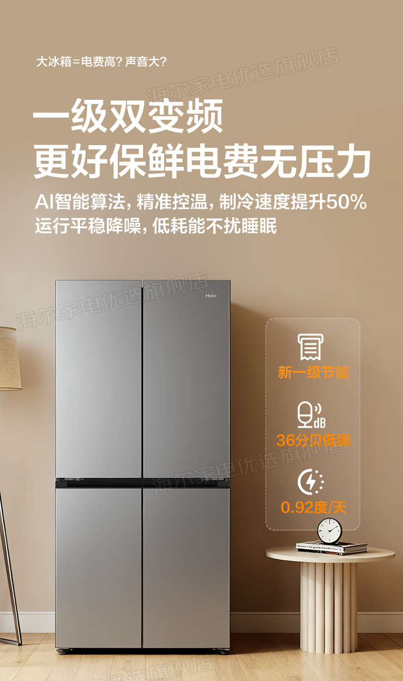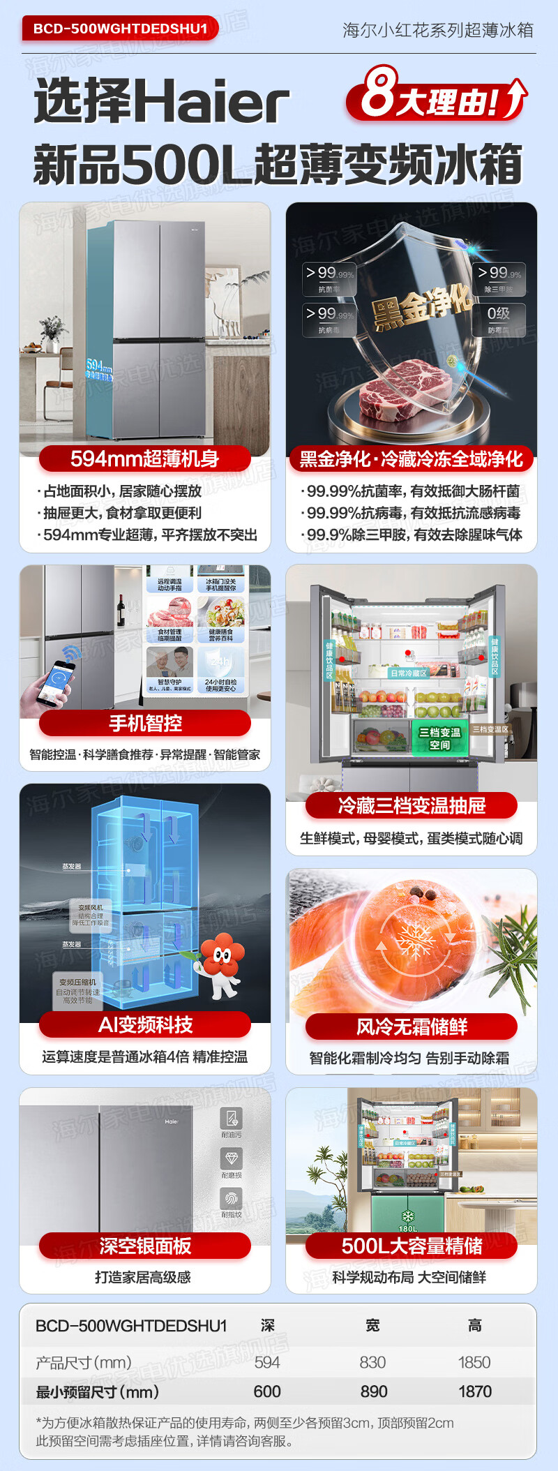 海尔冰箱十字四开门500升小红花系列 双开门深度60cm以下超薄一级能效大容量无霜电冰箱家用 以旧换新 全域黑金净化丨594mm超薄丨AI变频科技 【小红花系列】2026年新款丨500升