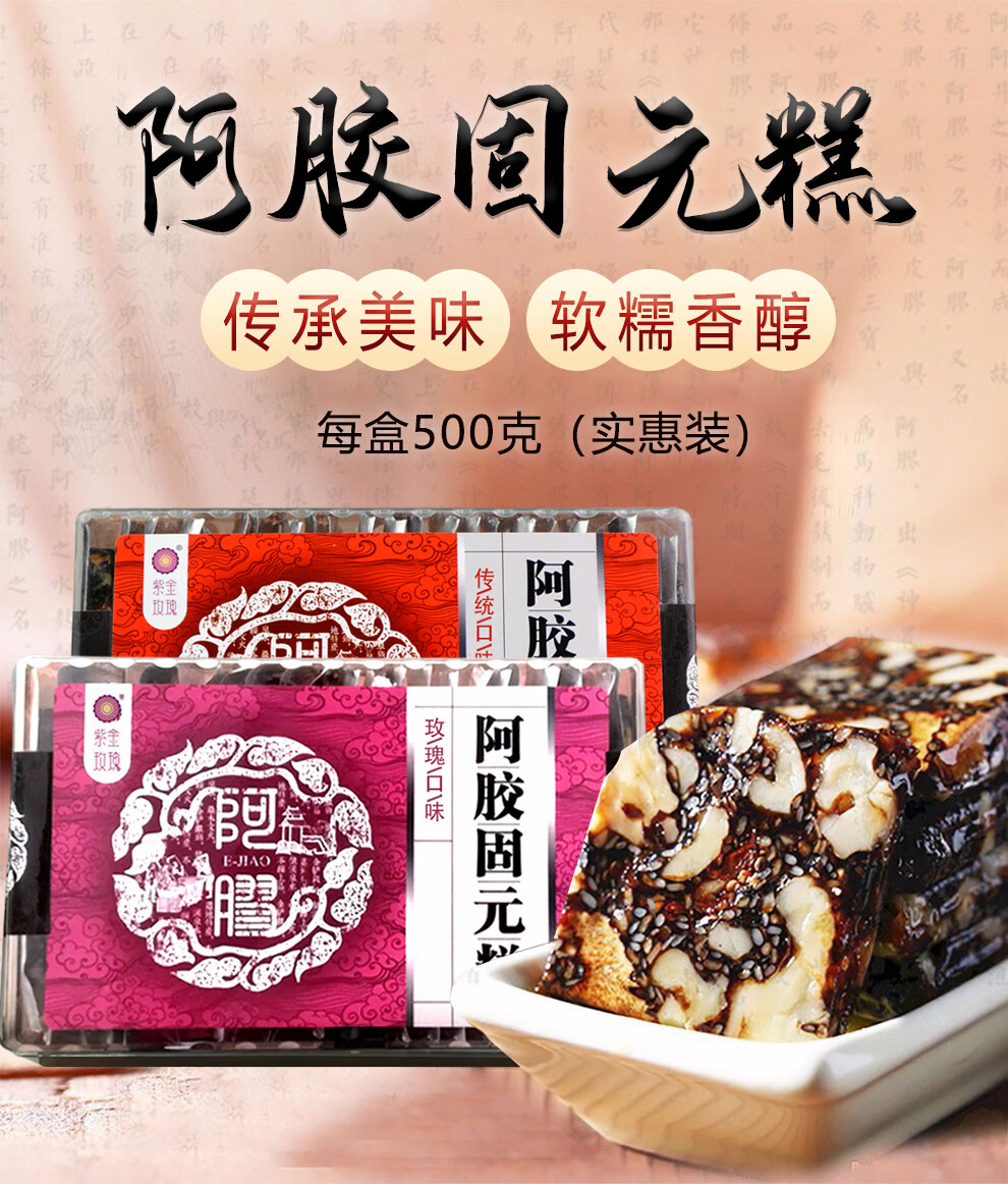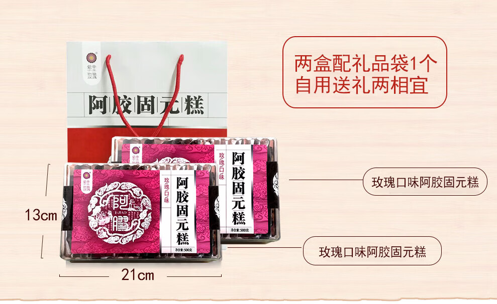 紫金玫瑰阿胶固元糕即食阿胶片块阿胶糕礼盒 送长辈送女生礼物年货礼品 500g*2盒 礼袋装(传统、玫瑰口味各500g)