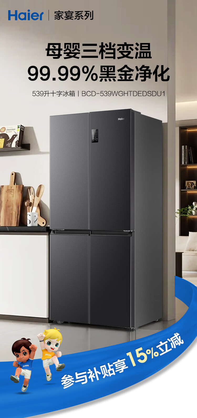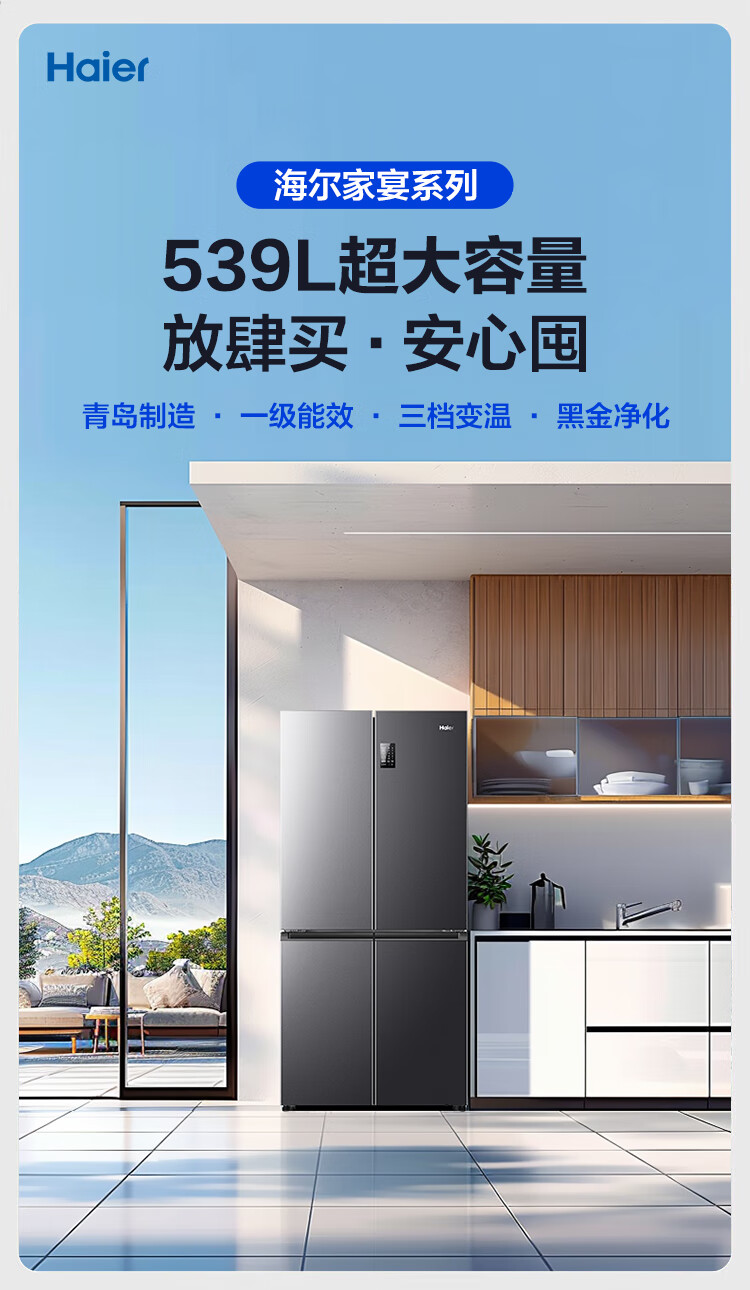 海尔(Haier)冰箱539升家宴系列四开门十字对开门多门一级双变频双循环风冷无霜大容量智能家用电冰箱国家补贴 539升玉墨银+一级双变频+黑金净化+三档变温区