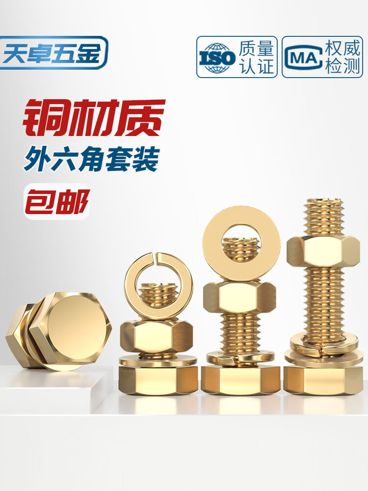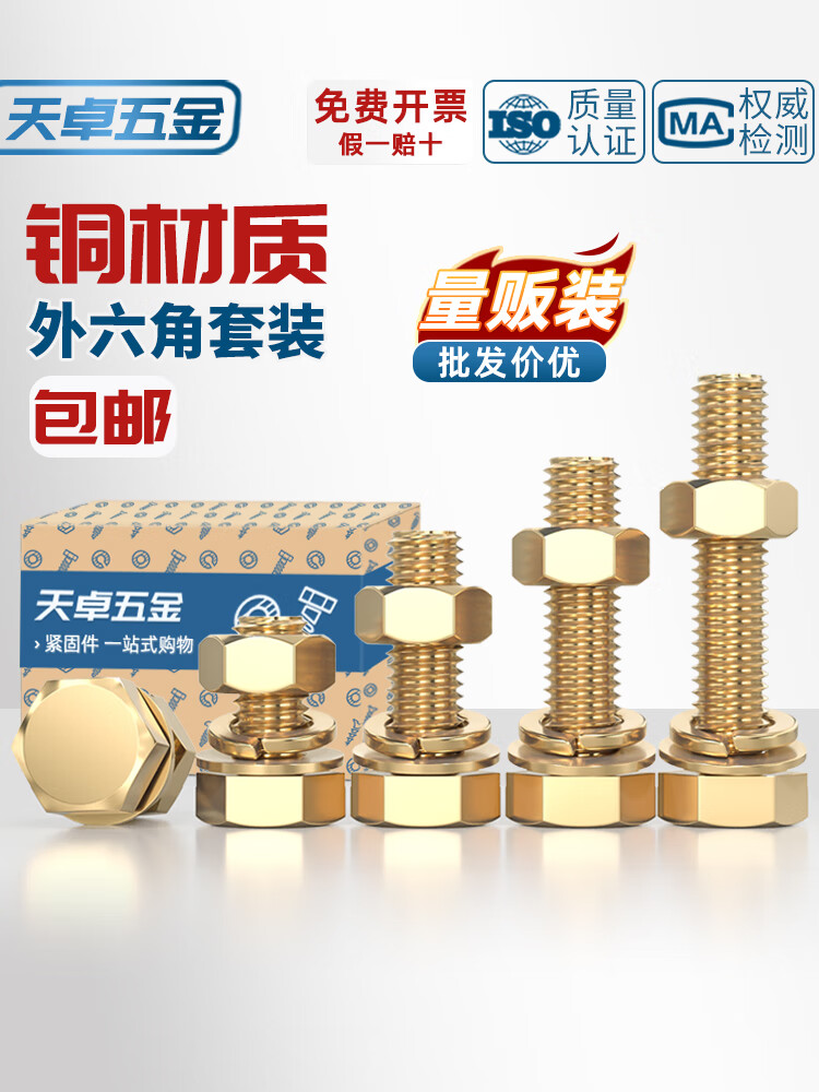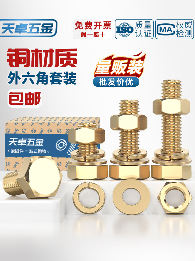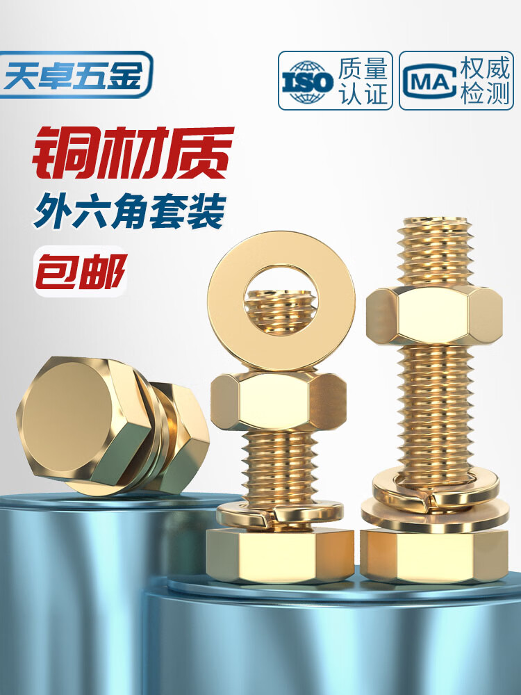 天卓五金国标纯铜全黄铜螺丝平垫螺母套装外六角螺栓组合4M5M6M8M10M12M16 M5*12-15套