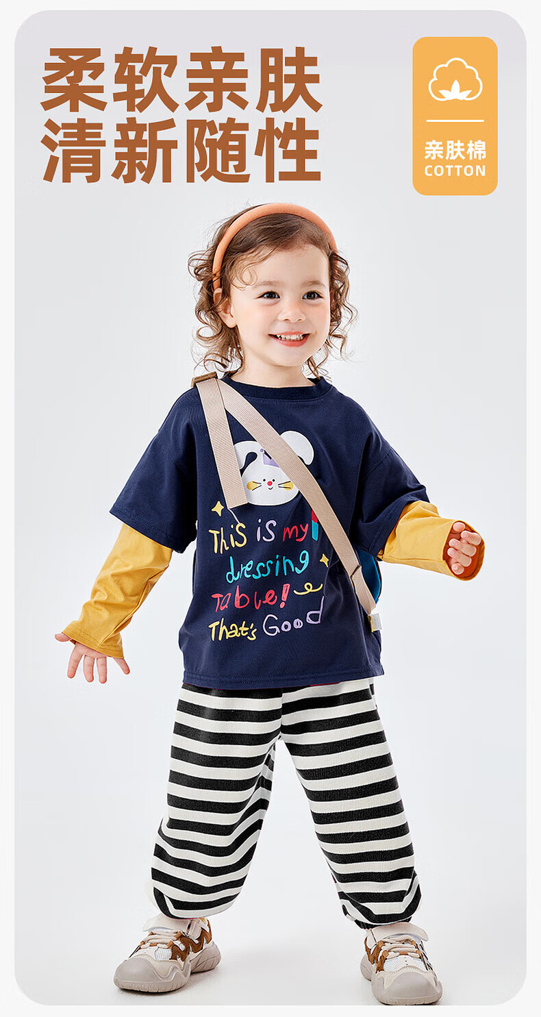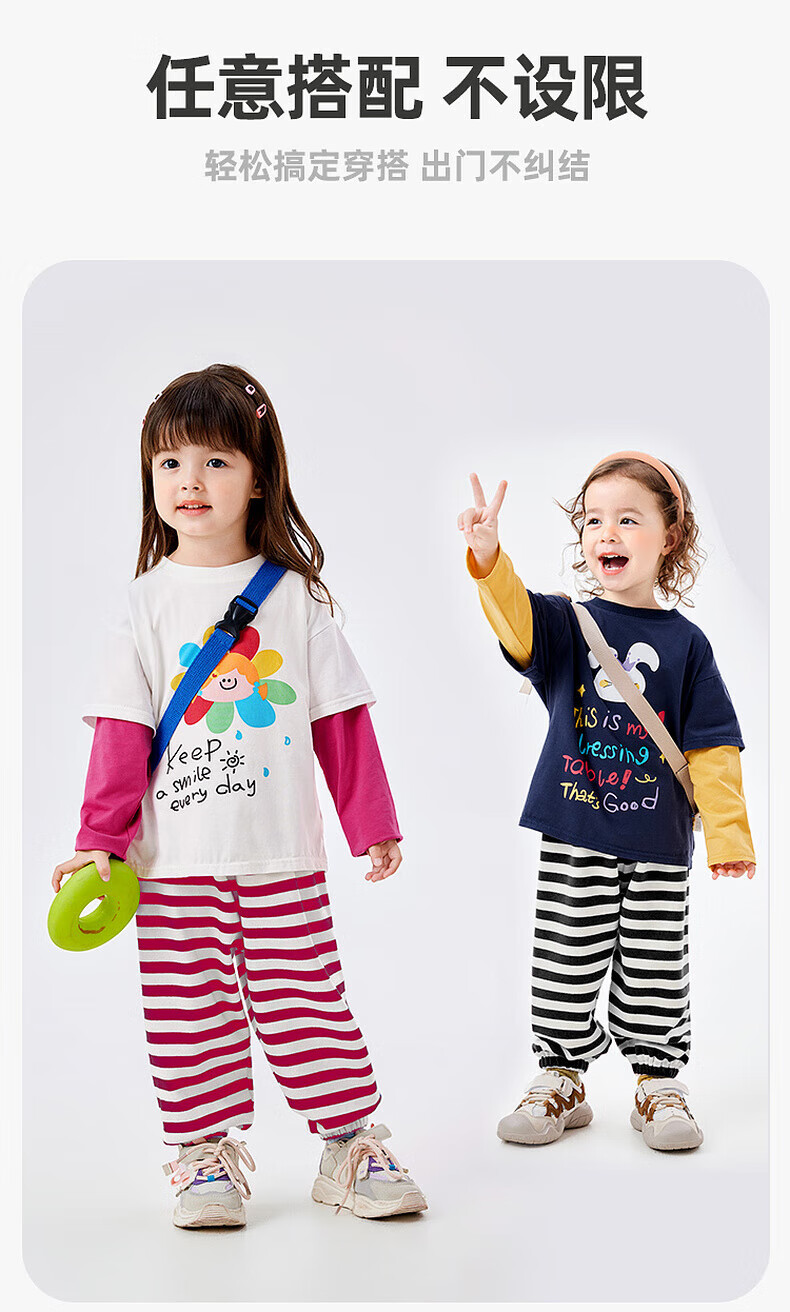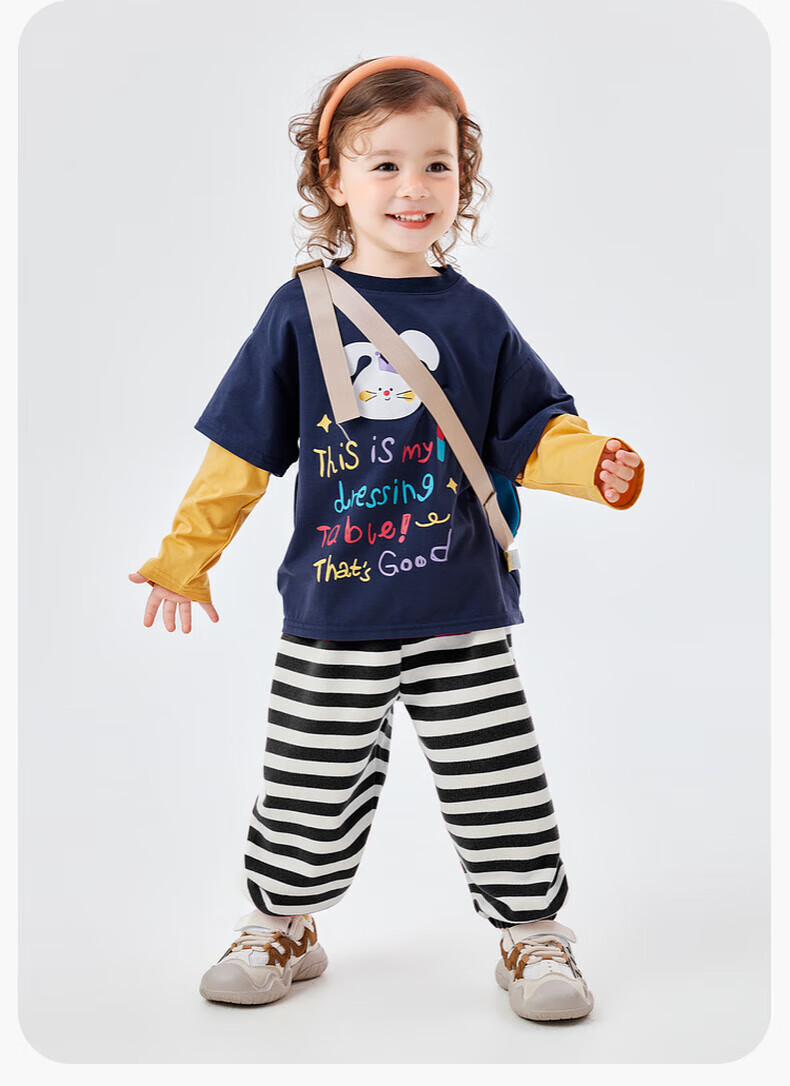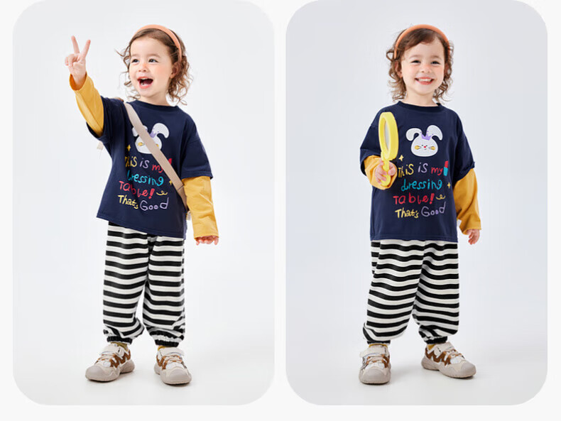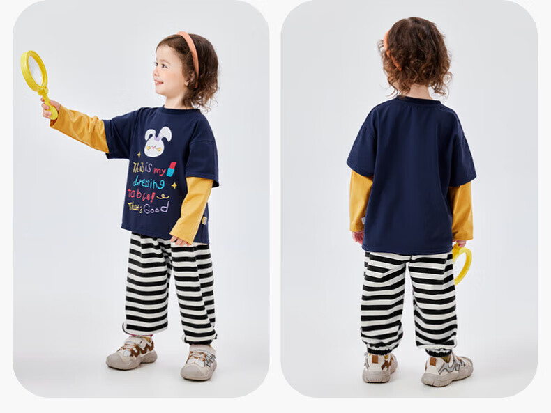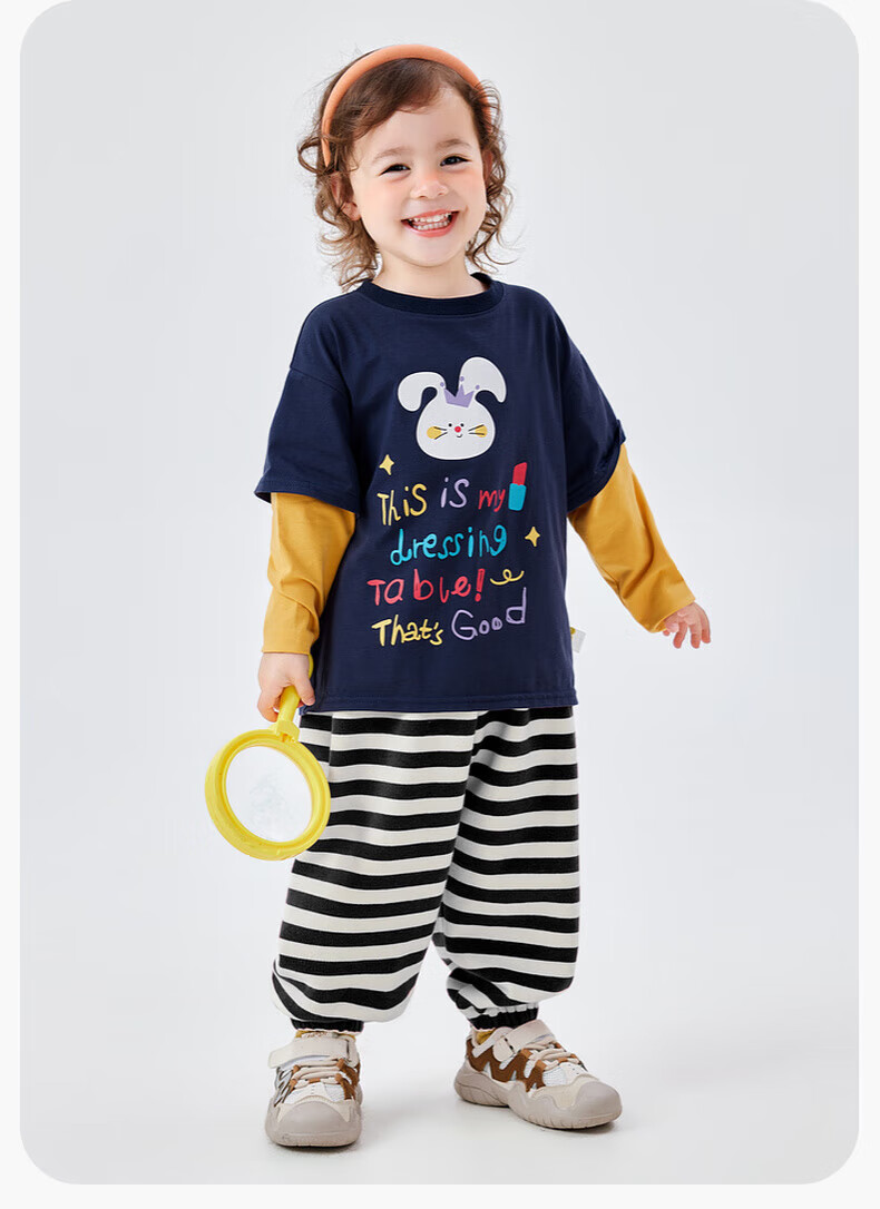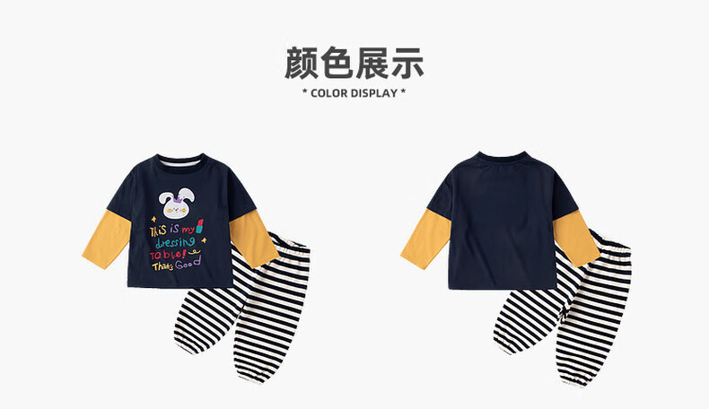 嘟嘟家女童长袖套装春装女小童秋款可爱假两件T恤女宝宝休闲条纹裤子潮 藏青色 90