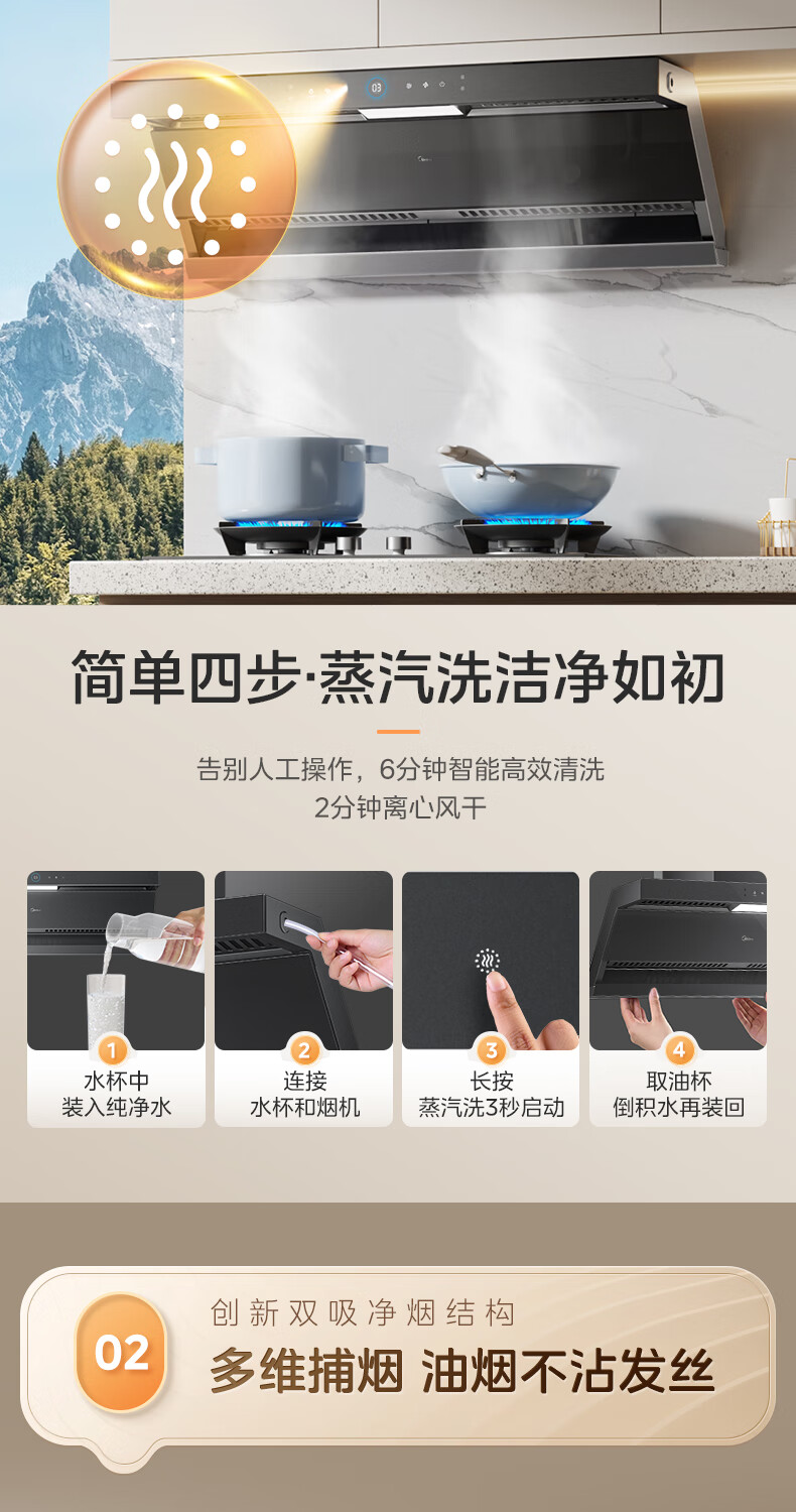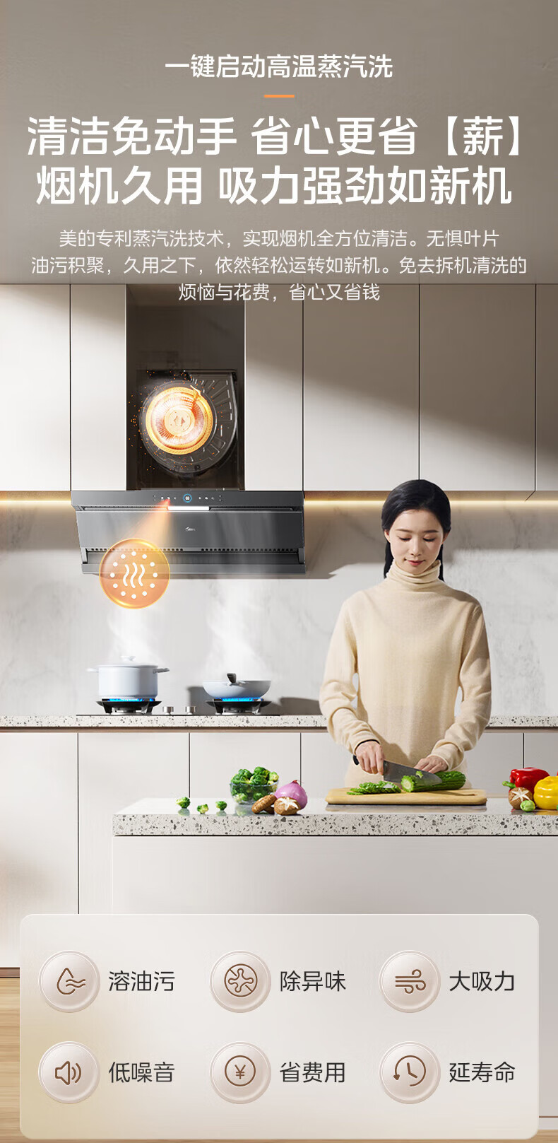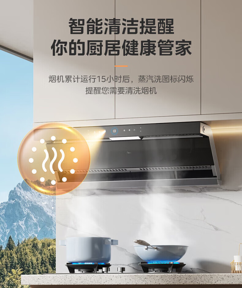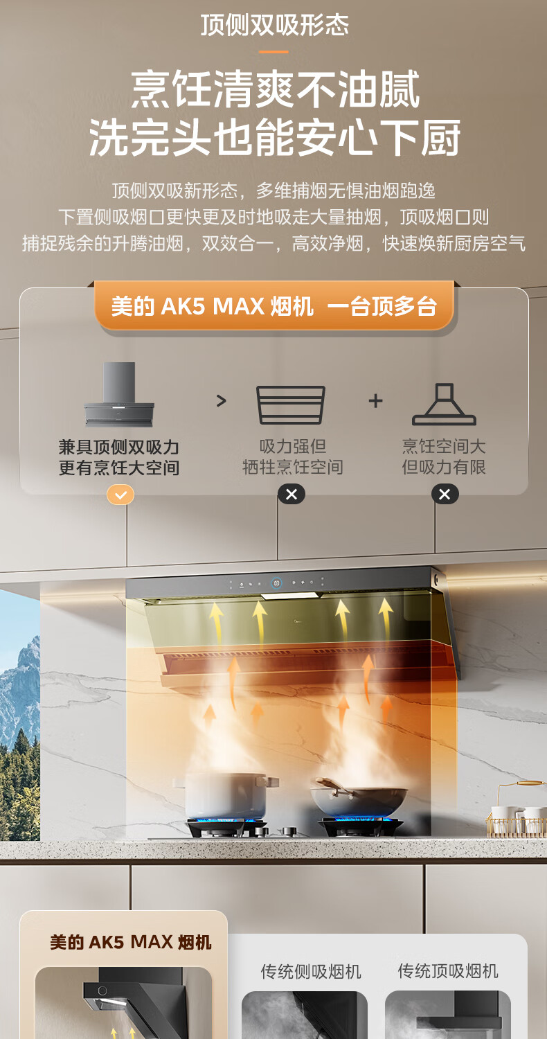 美的(Midea)【蒸汽洗AK7MAX/AK5MAX】顶侧双吸抽油烟机家用28风量1100Pa变频巡航高温蒸汽洗自清洁排吸油烟机 【天然气套装】AK7MAX+QD529双定时燃气灶 【烟灶联动】国家补贴立减20%