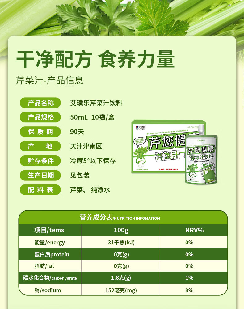 艾璞乐芹菜汁无蔗糖饮品健康蔬菜汁天然饮料新鲜萃取西芹原液果蔬汁礼盒 芹菜汁50ml*3袋