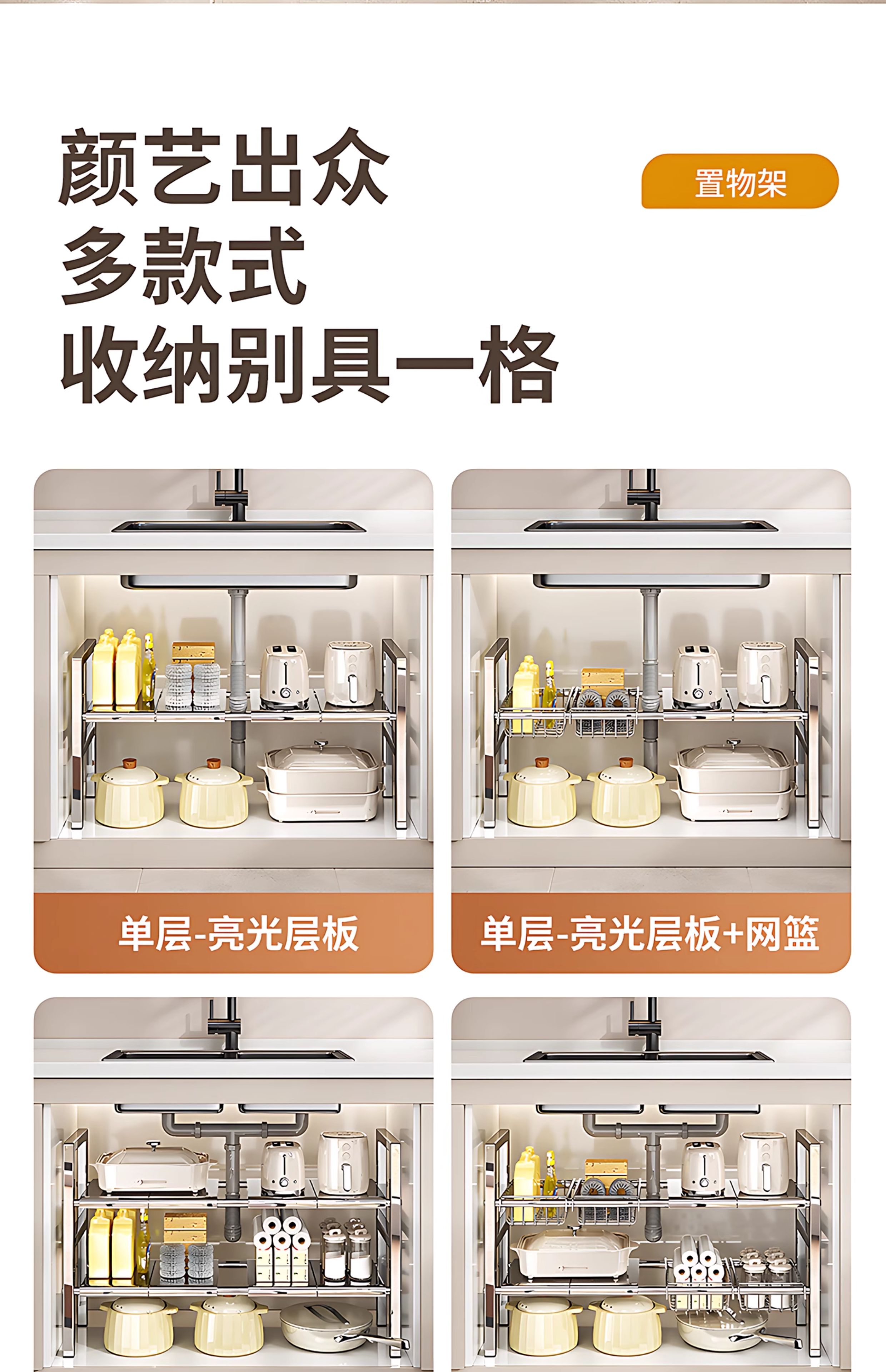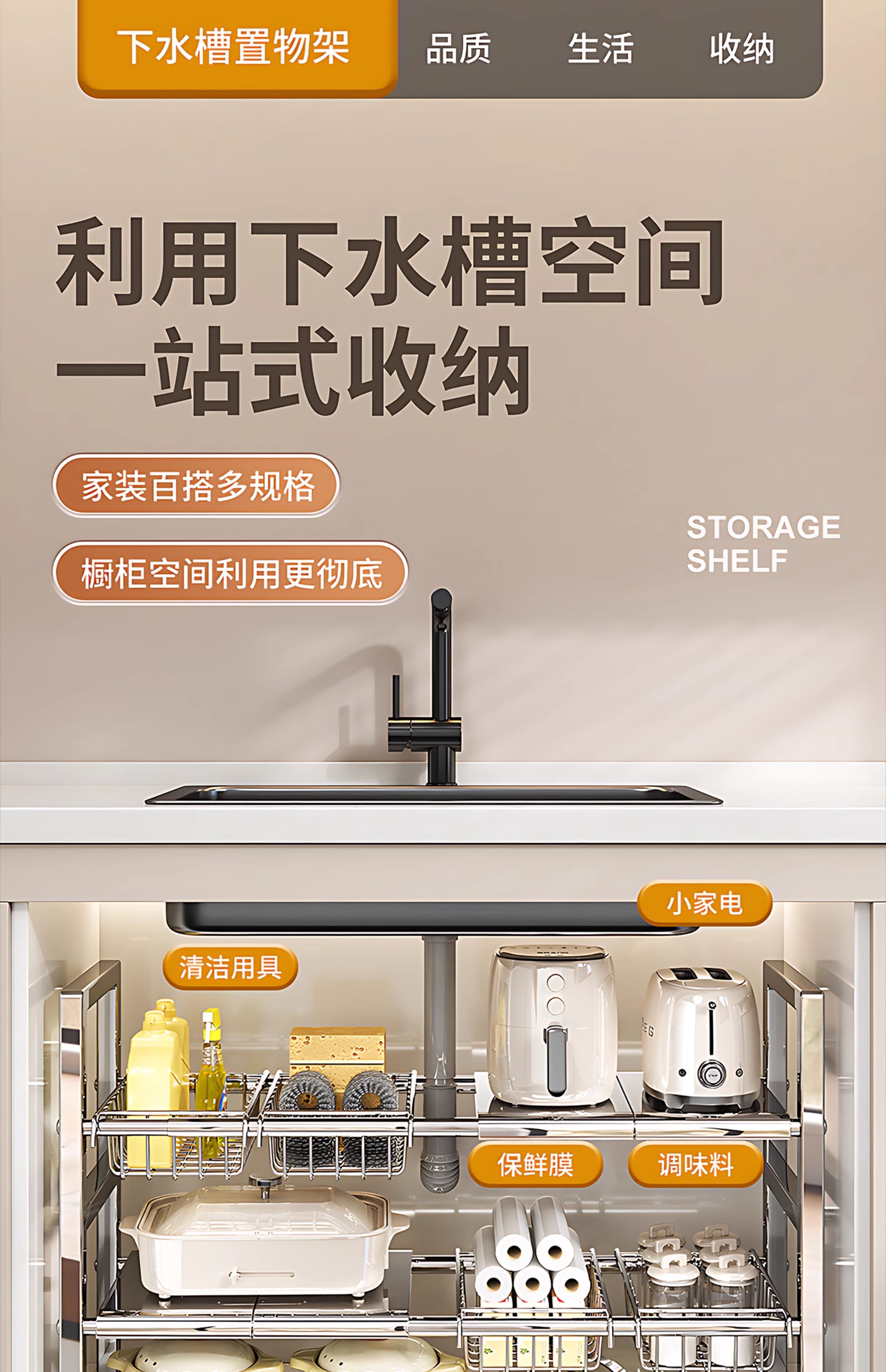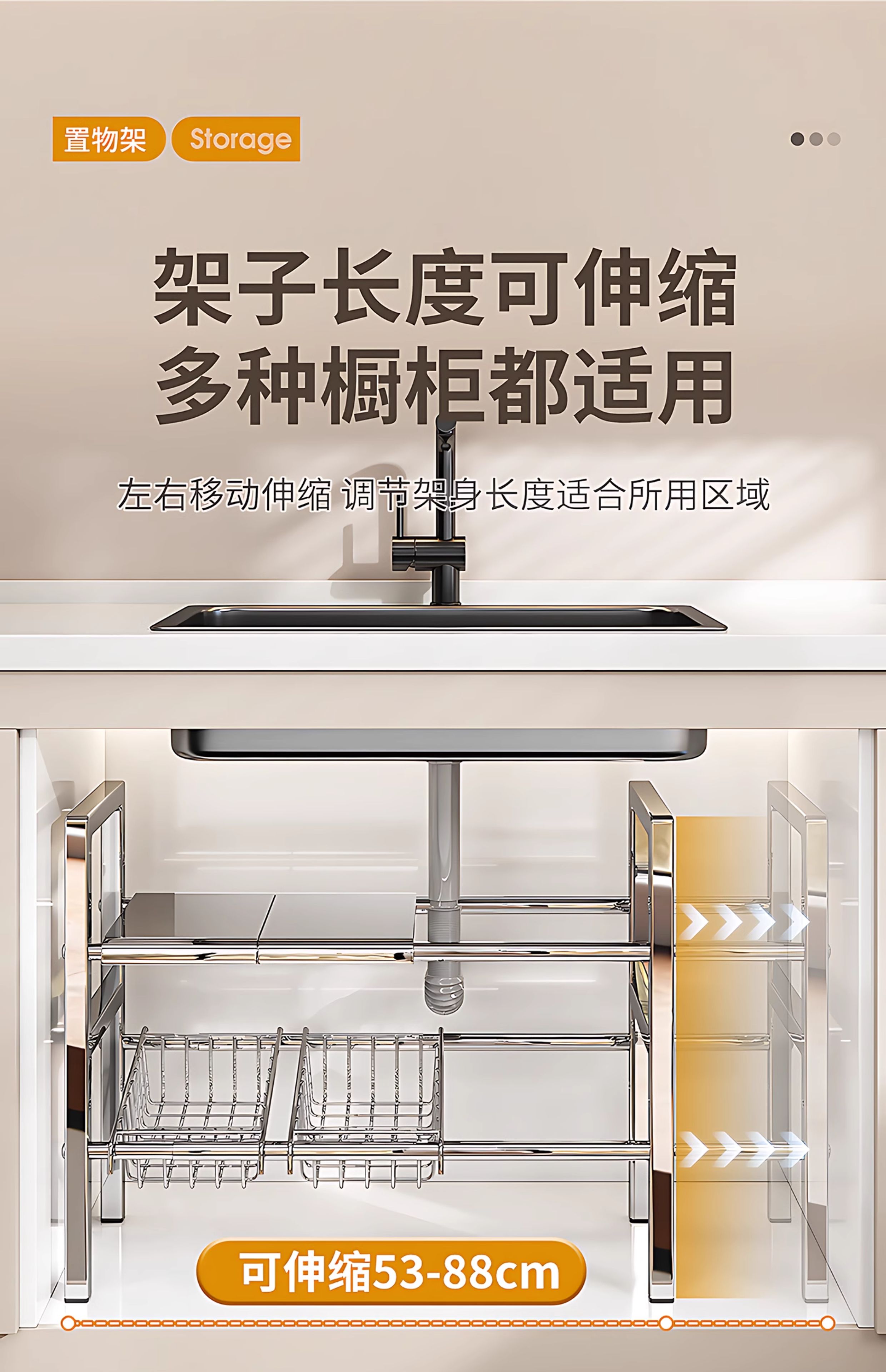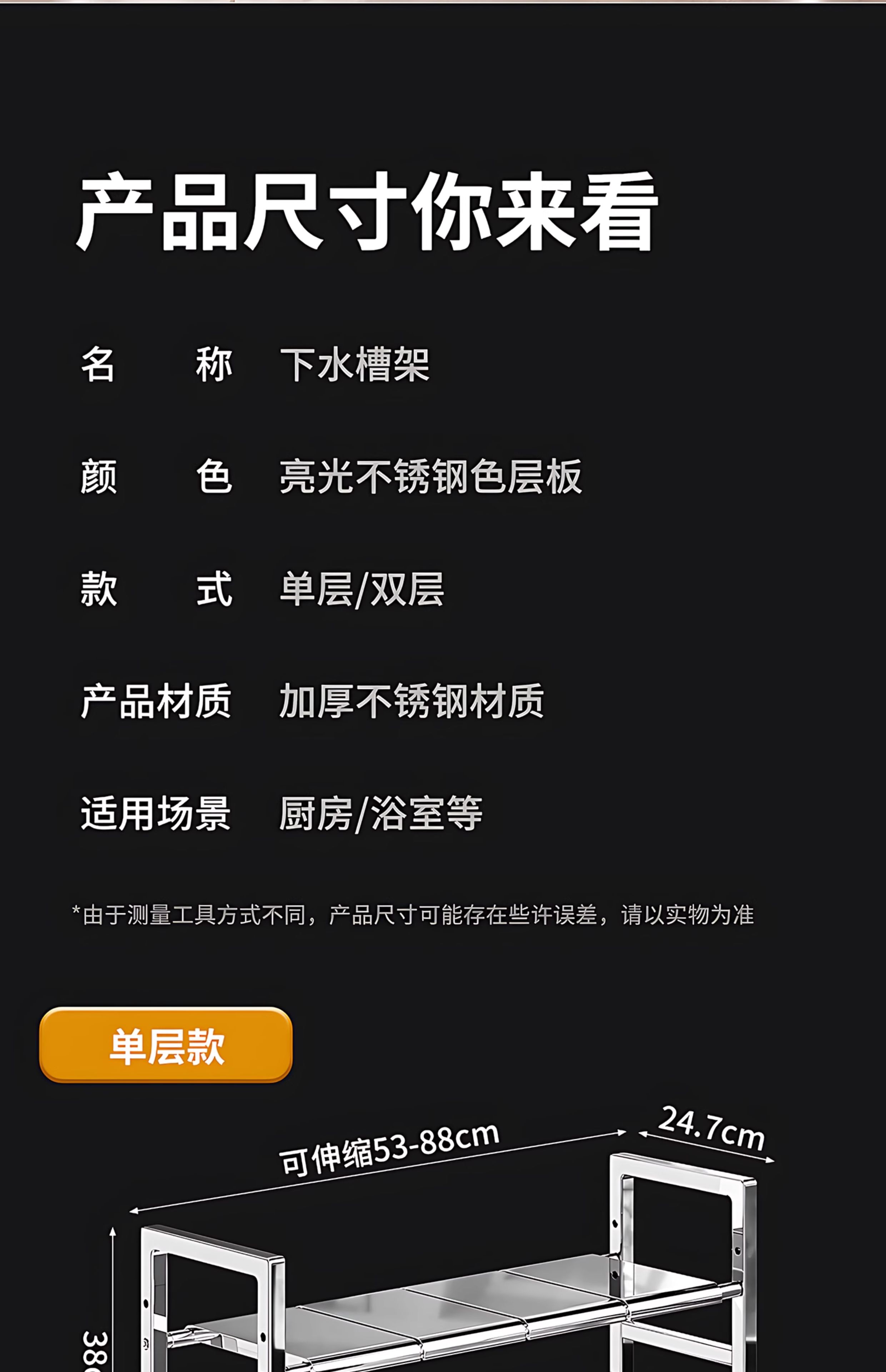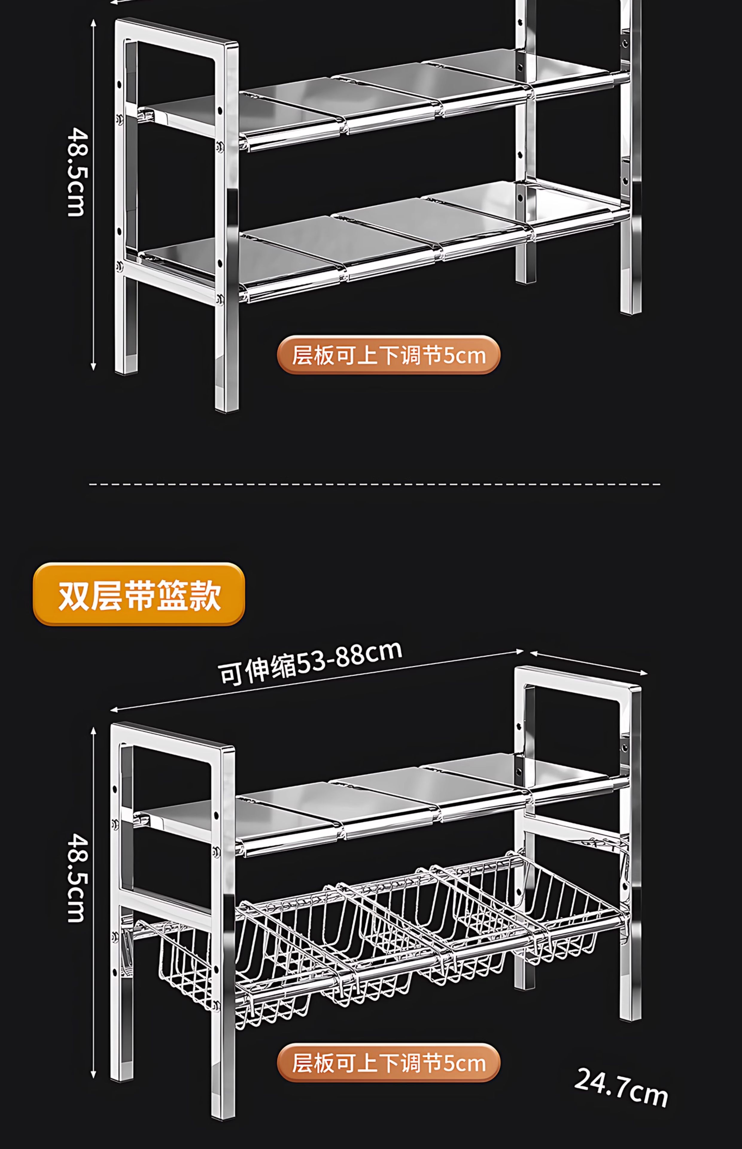 炊大皇厨房伸缩置物架水槽下不锈钢架分层橱柜碗碟储物台面锅架收纳架子 A1【不锈钢本色】单层三板
