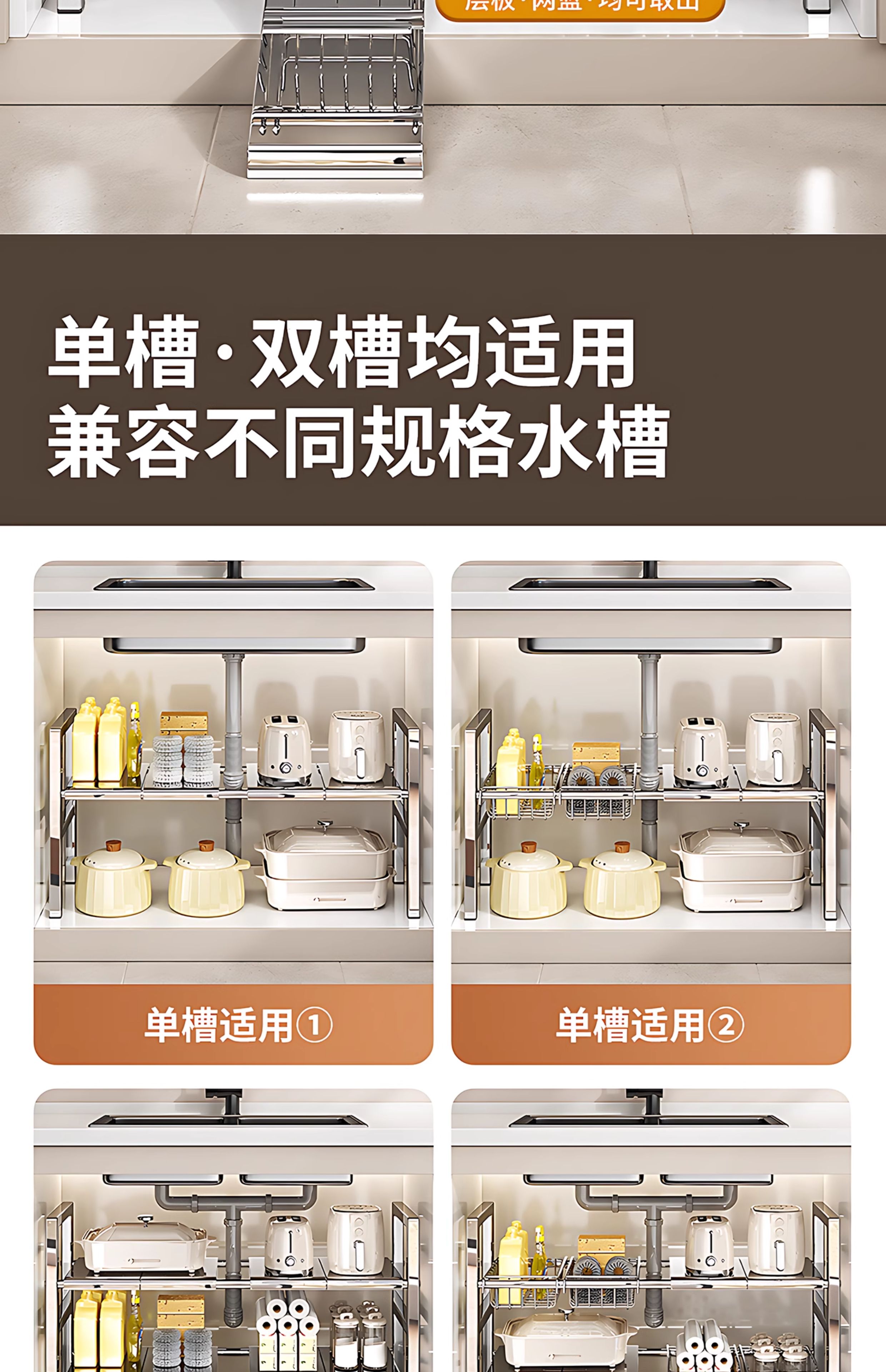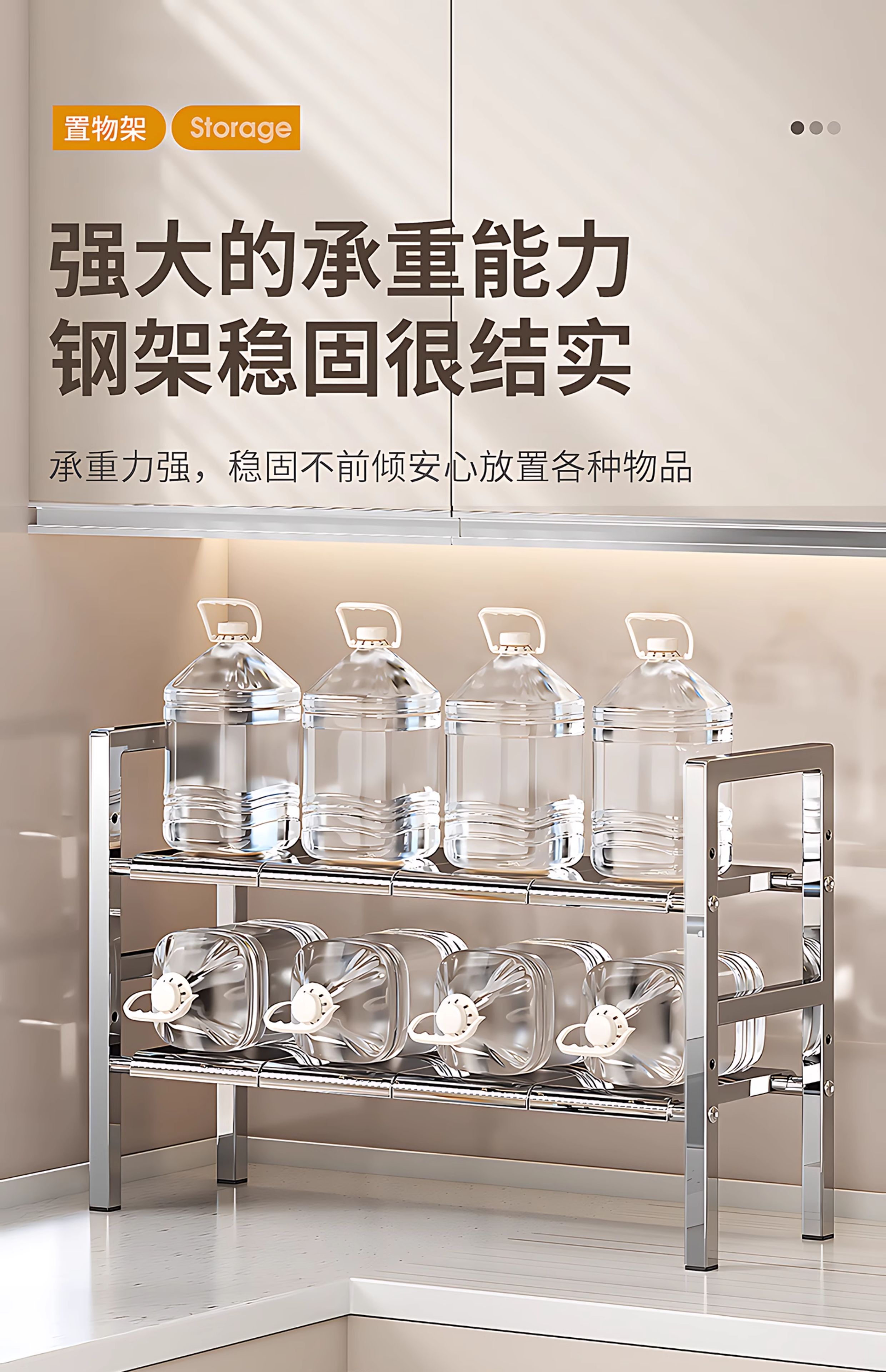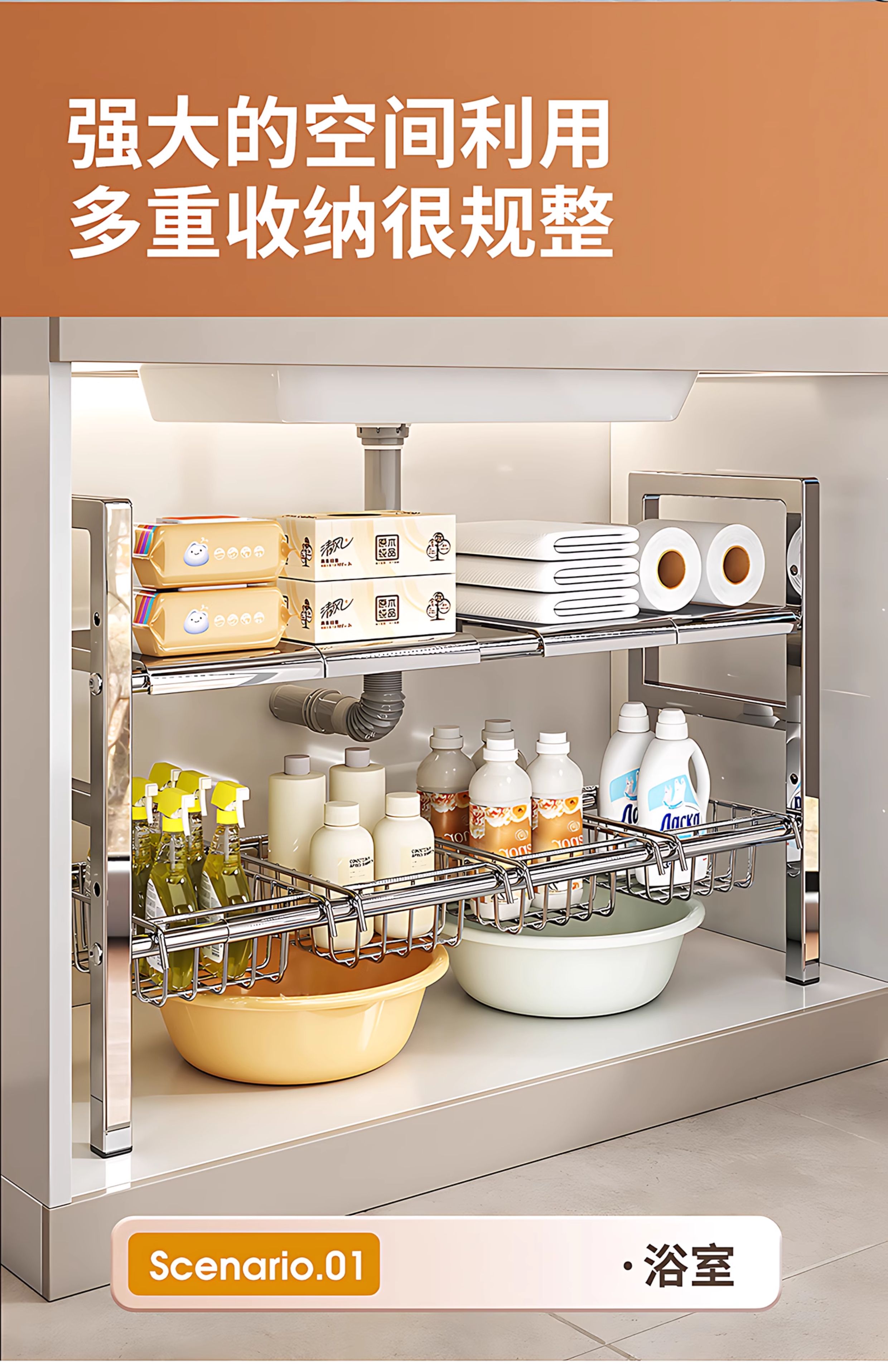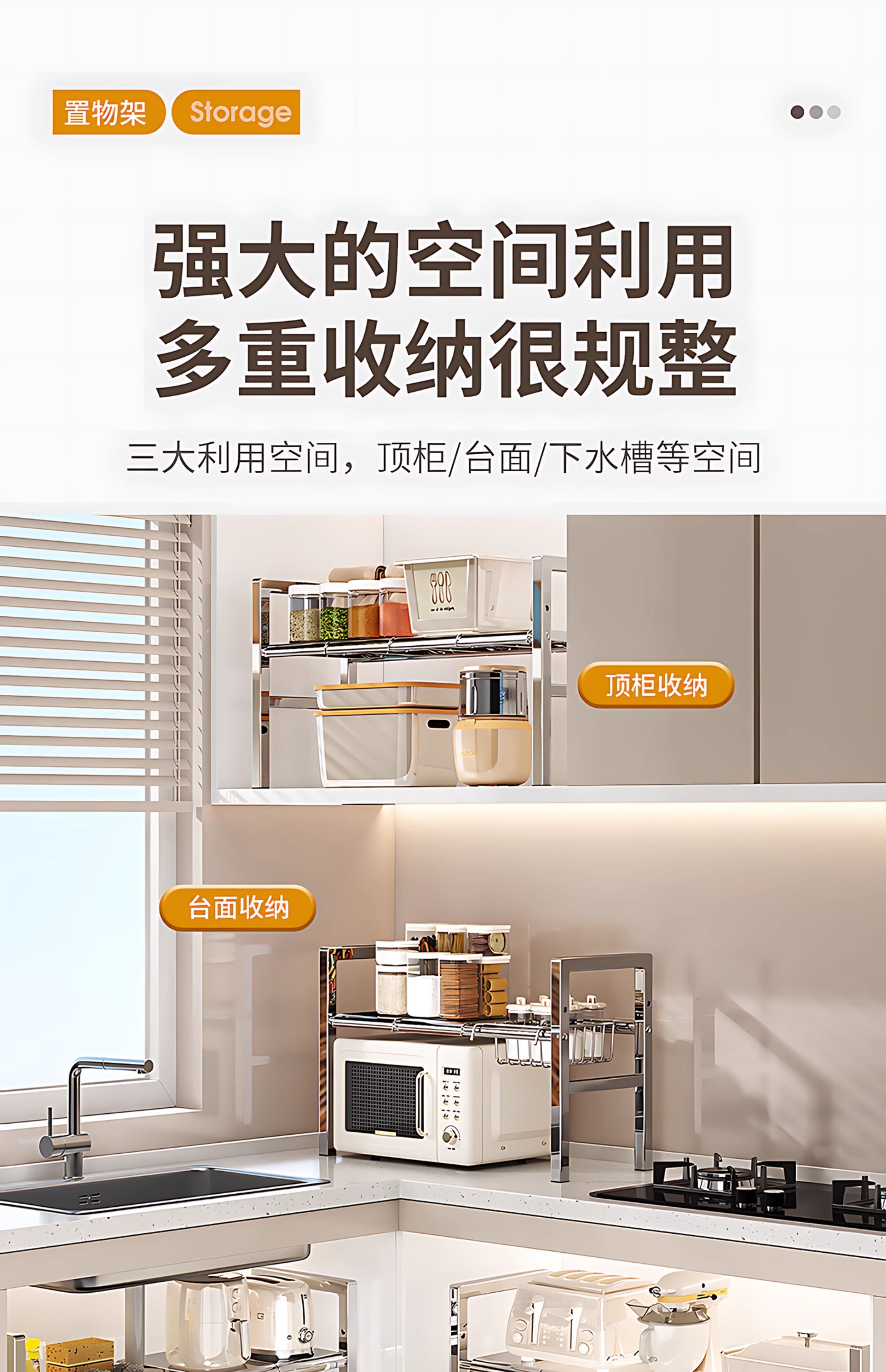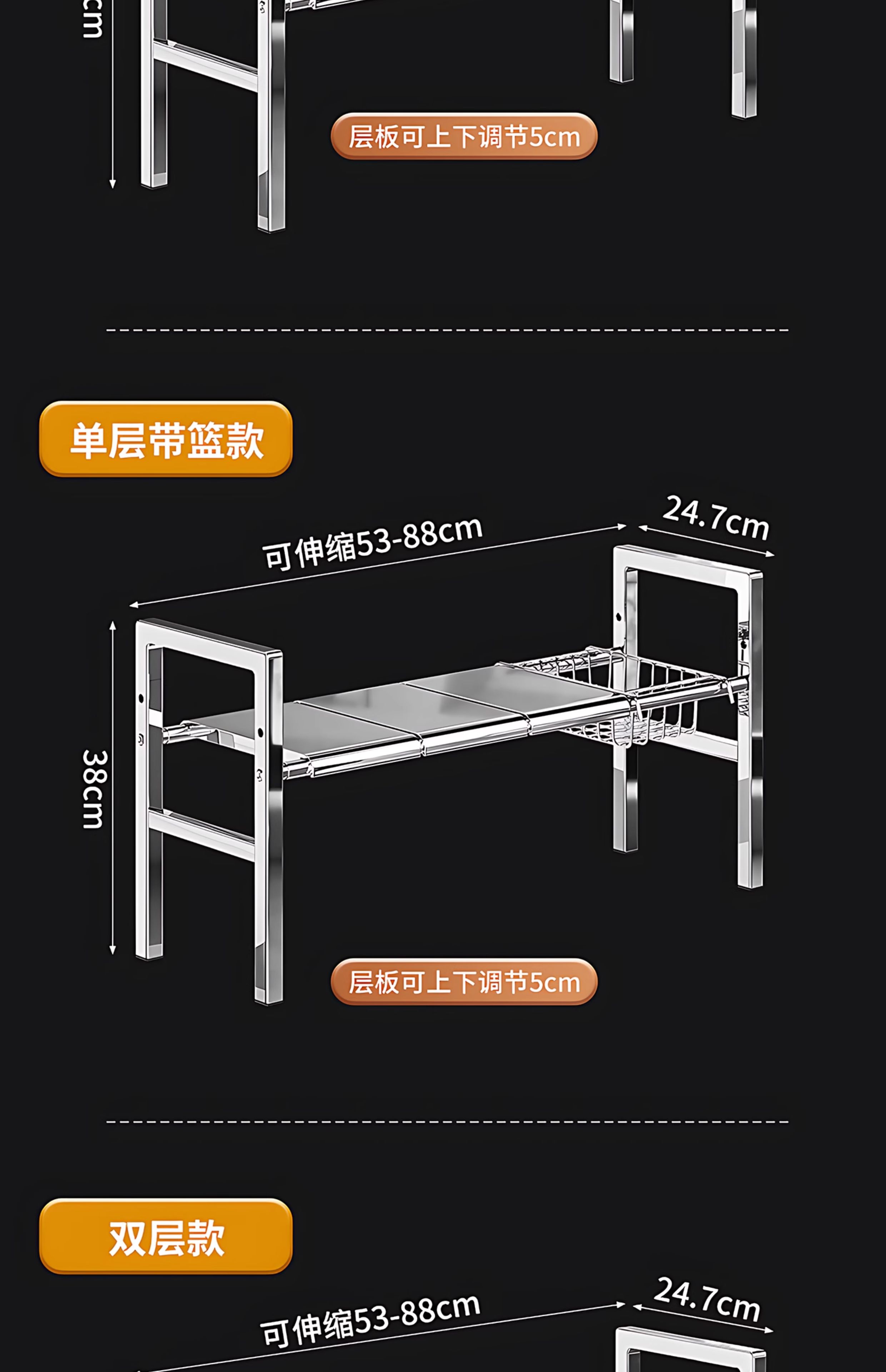 炊大皇厨房伸缩置物架水槽下不锈钢架分层橱柜碗碟储物台面锅架收纳架子 A1【不锈钢本色】单层三板