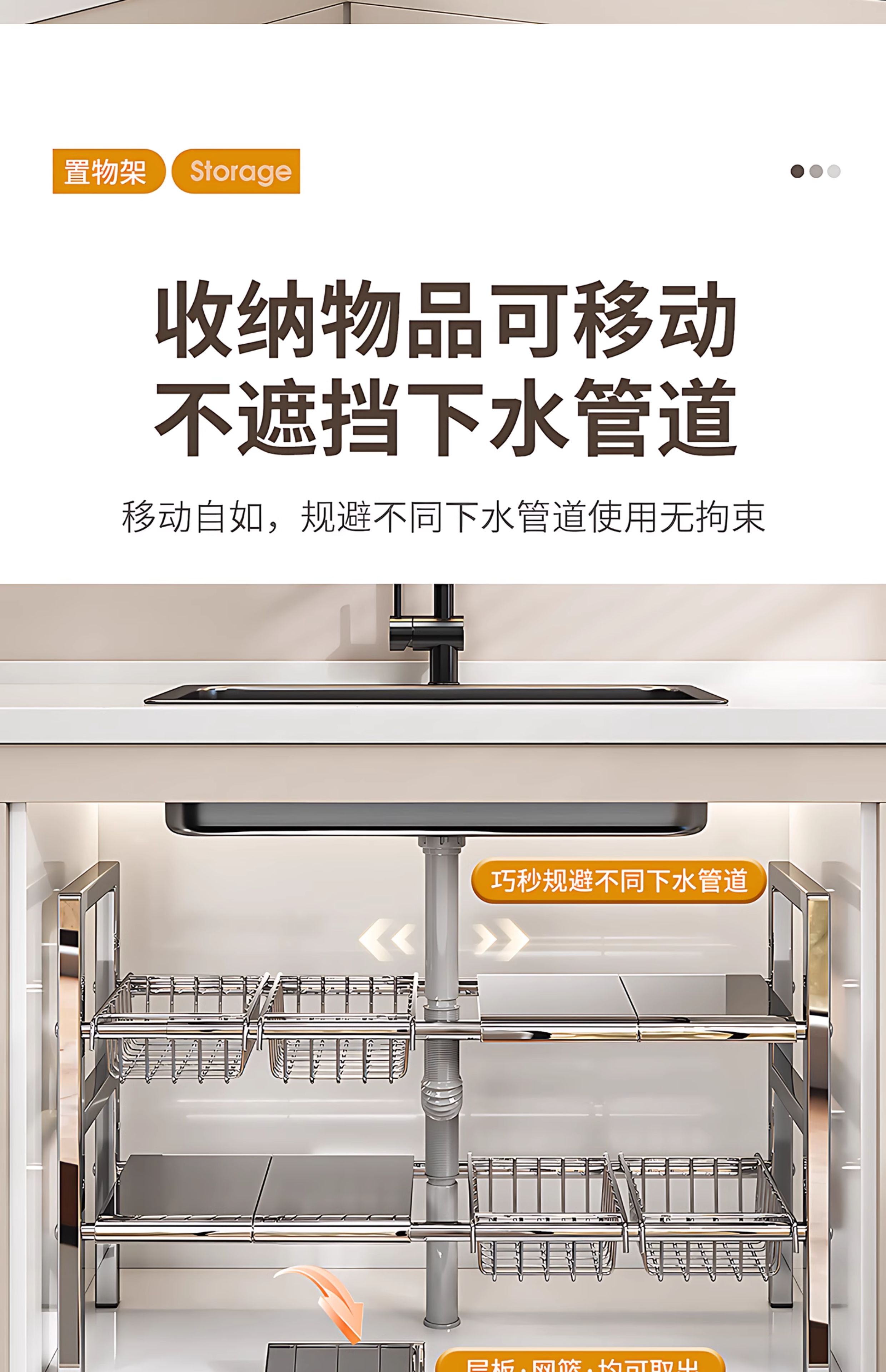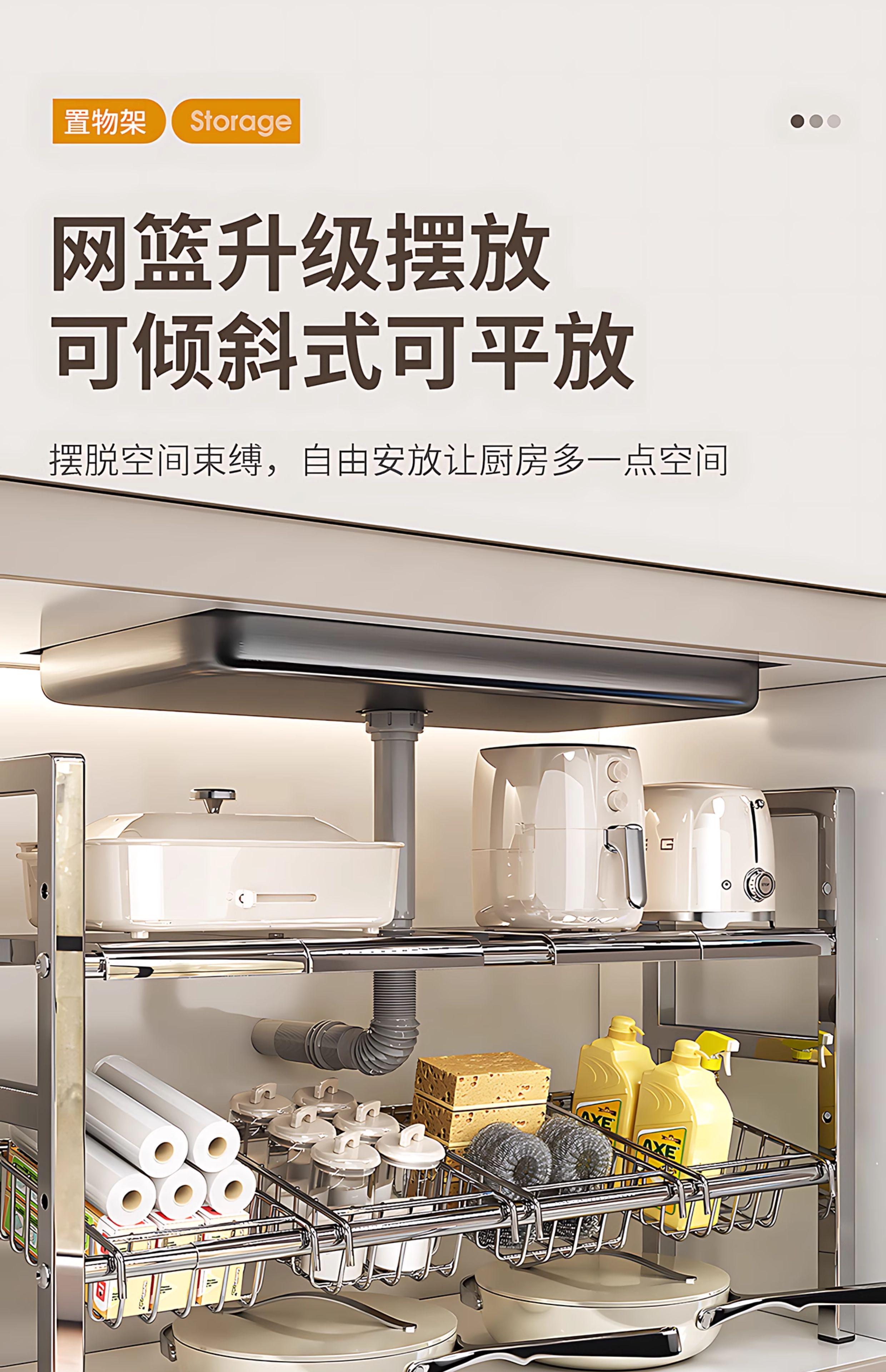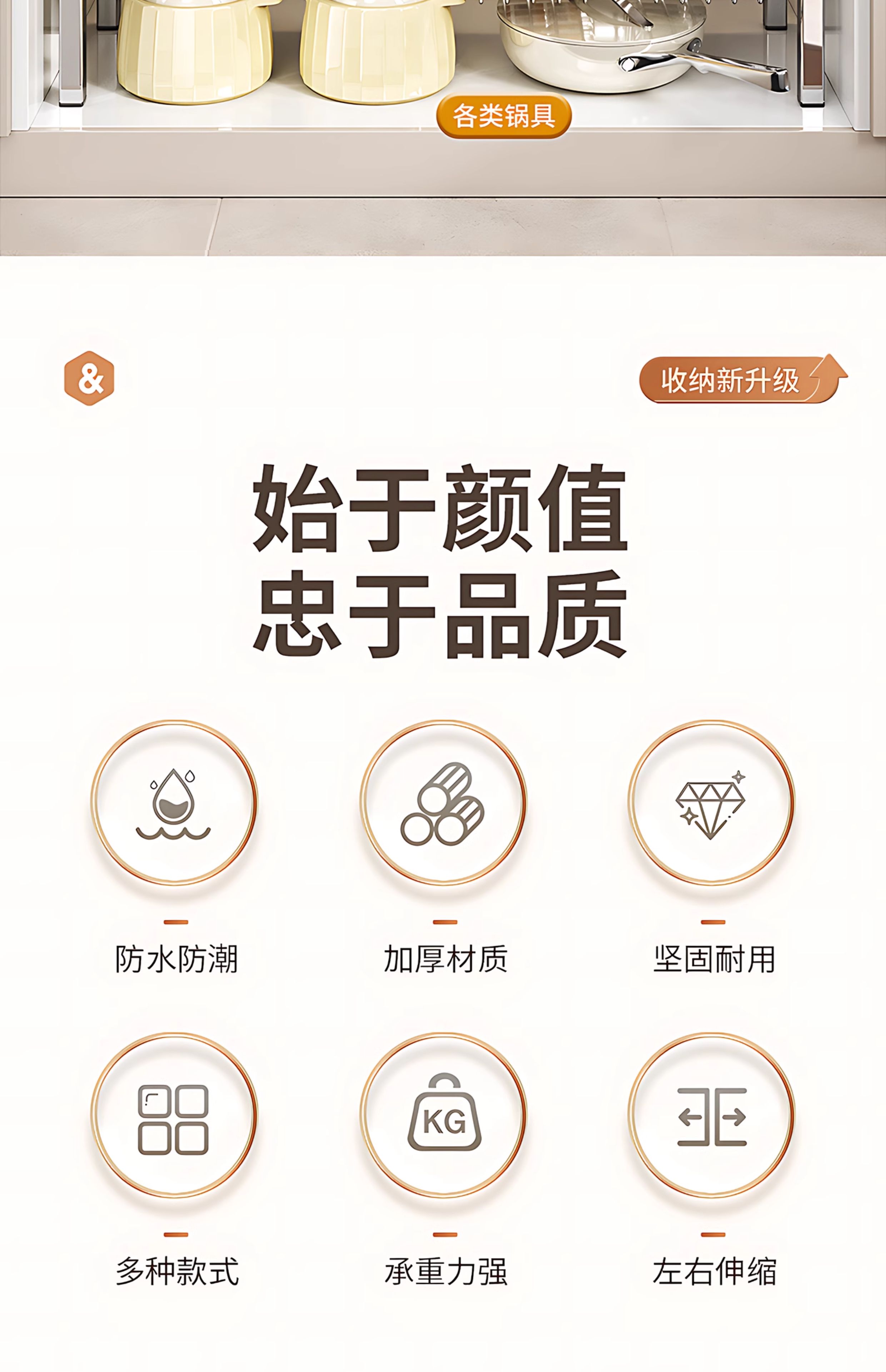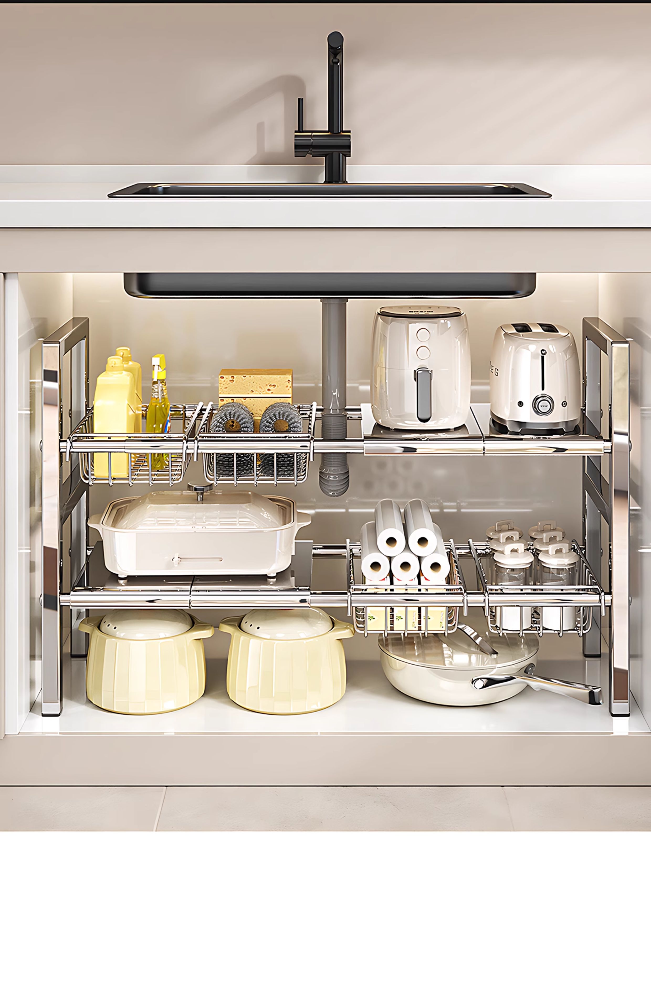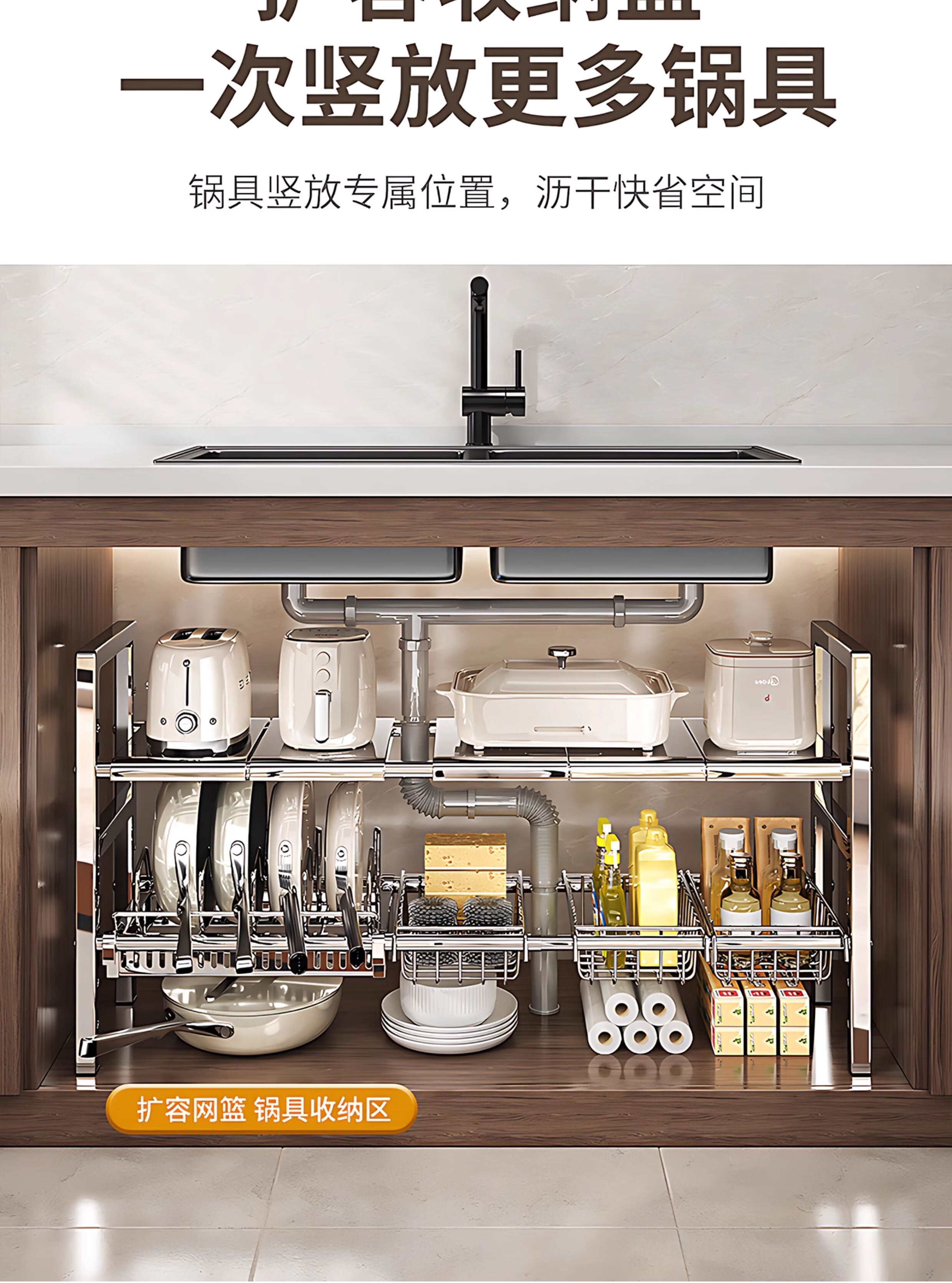 炊大皇厨房伸缩置物架水槽下不锈钢架分层橱柜碗碟储物台面锅架收纳架子 A1【不锈钢本色】单层三板