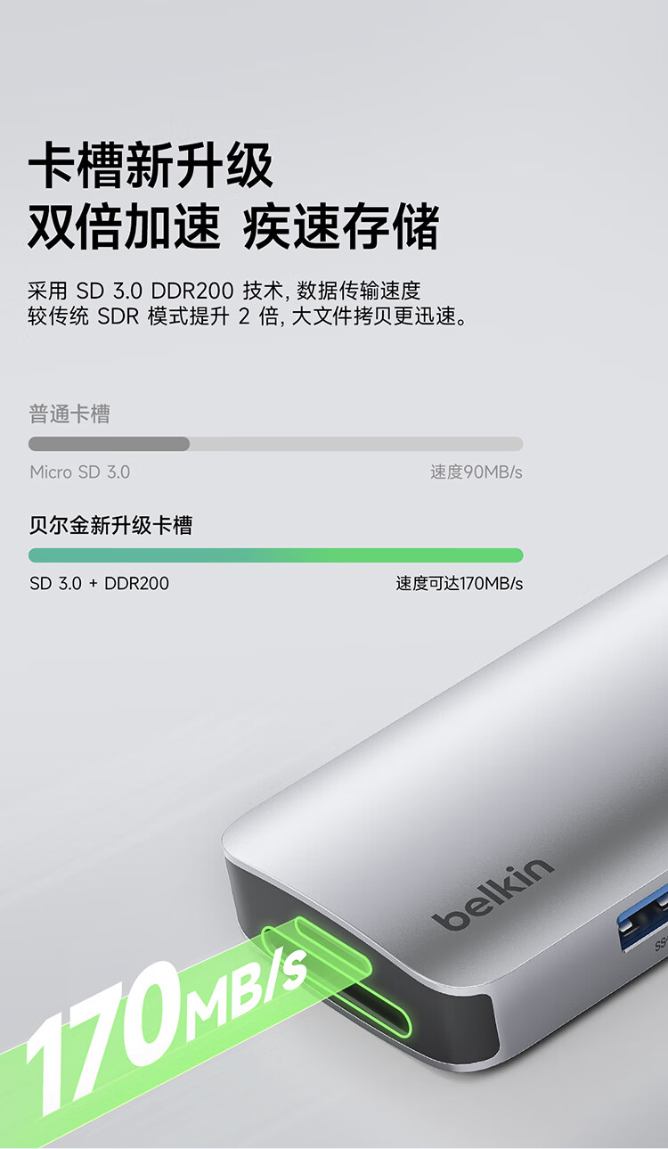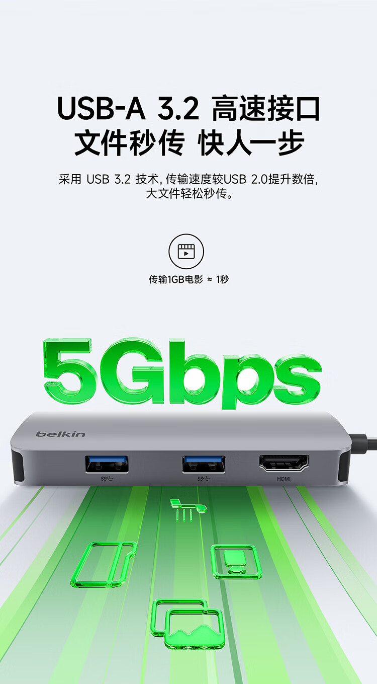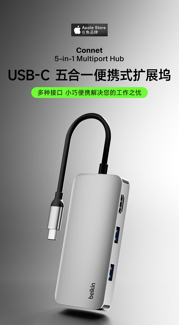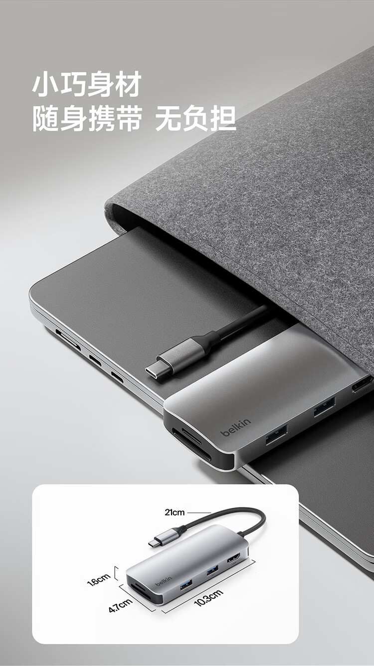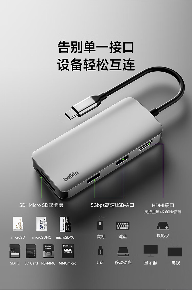 贝尔金(BELKIN)Type-C拓展坞 MacBook扩展坞5合1 电脑USB扩展TF/SD读卡器 iPad投屏HDMI 兼容雷电口 AVC007-V2