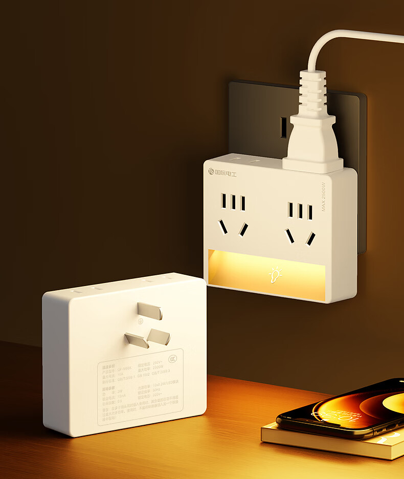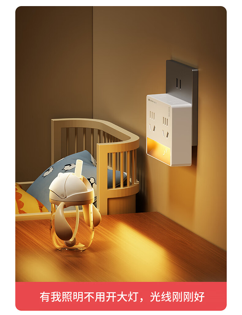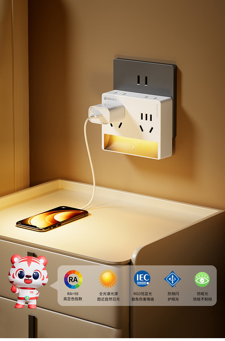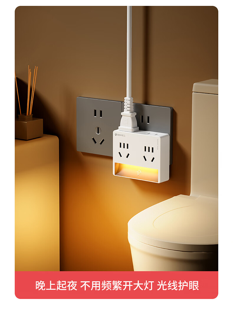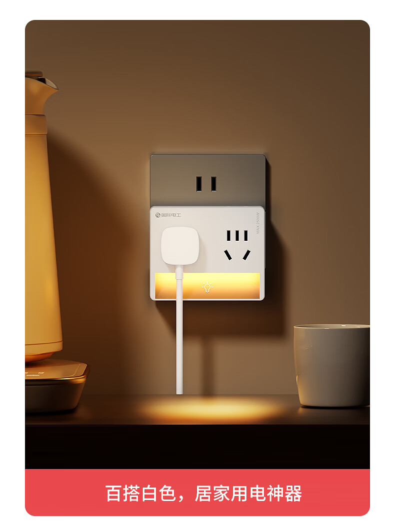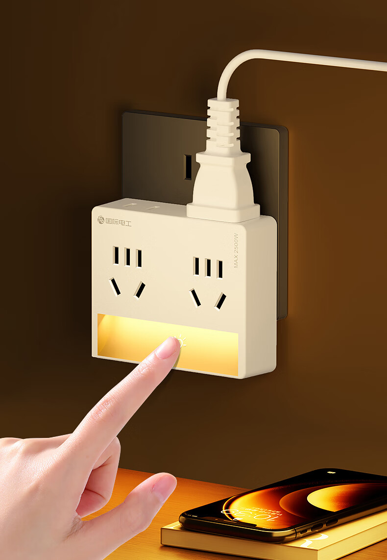 国际电工全光谱小夜灯转换插座免布线家用多功能无线扩展器触摸感应灯插座 一转四向上感应灯【白色】