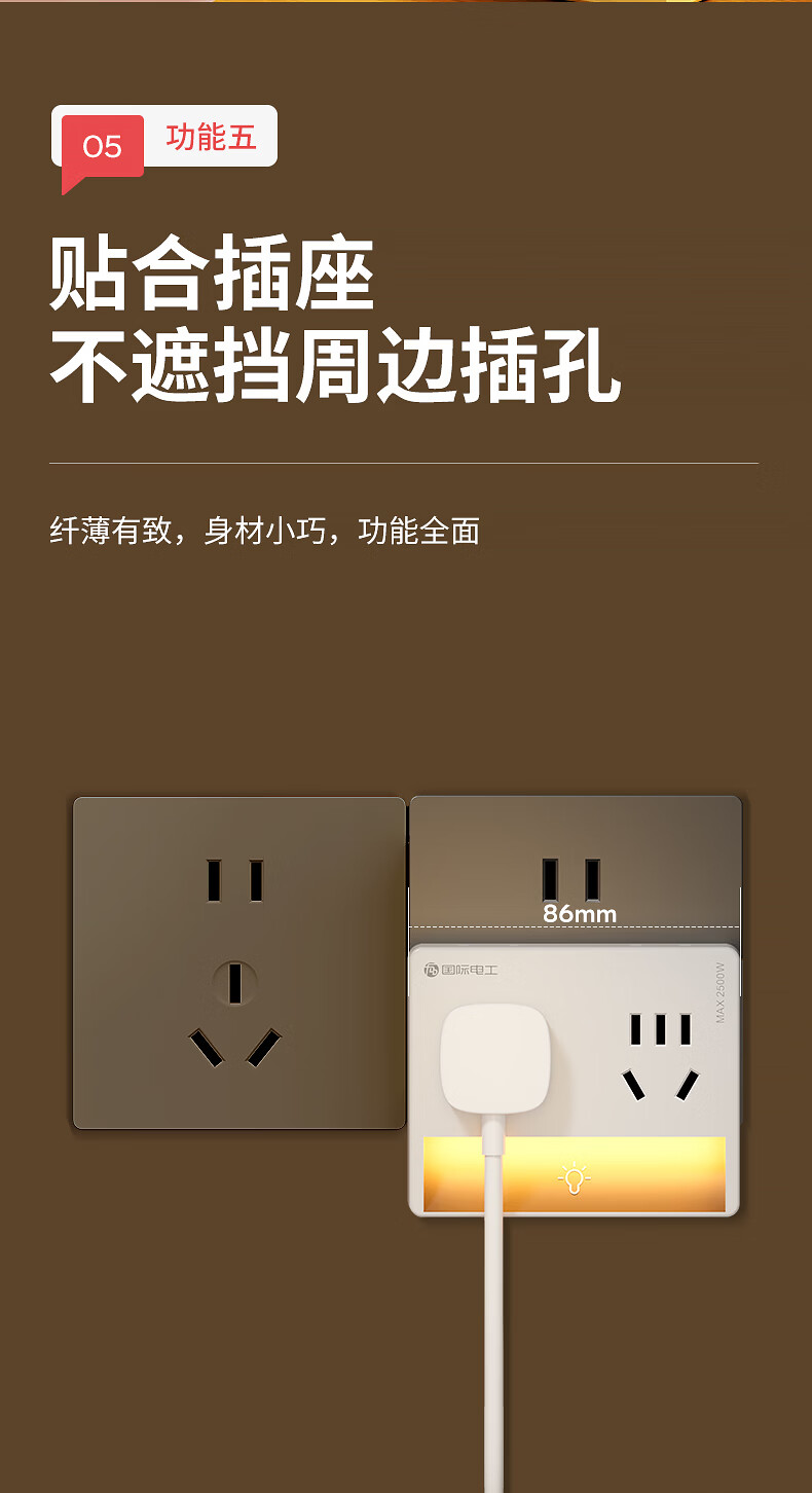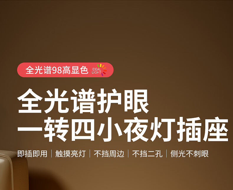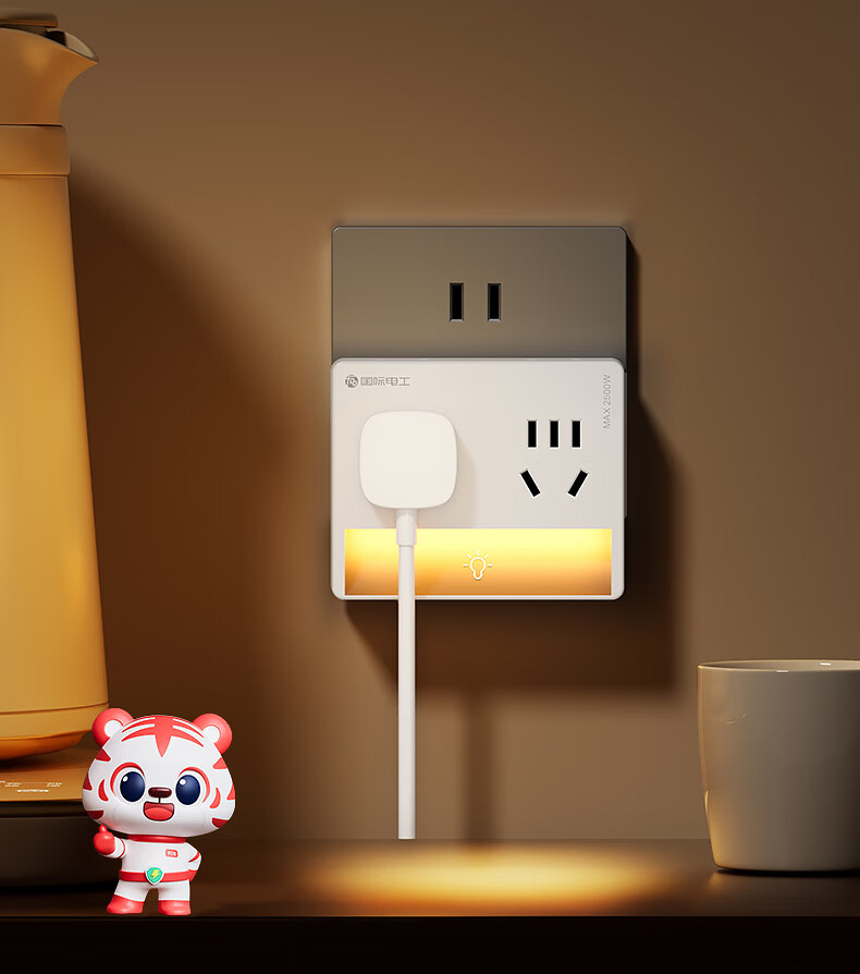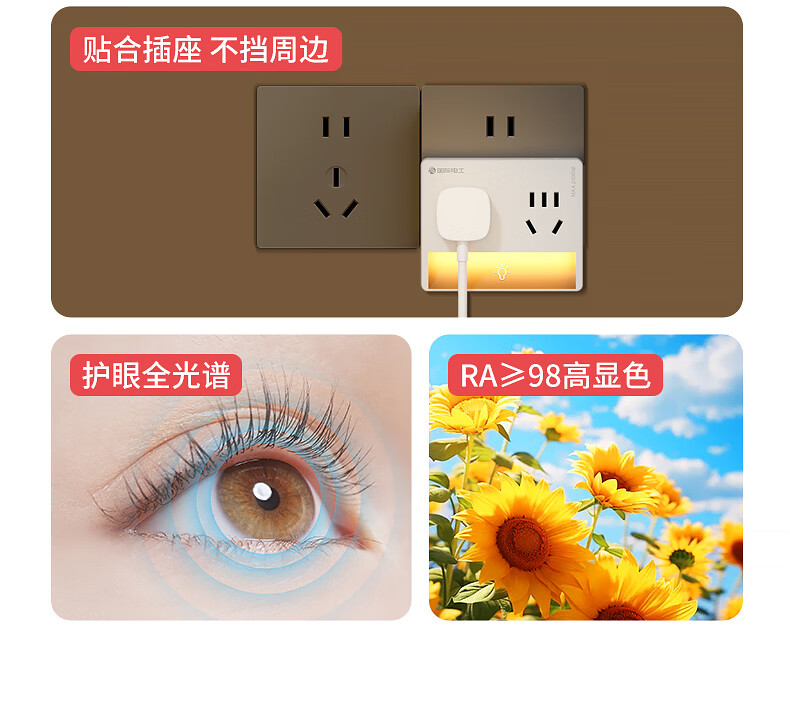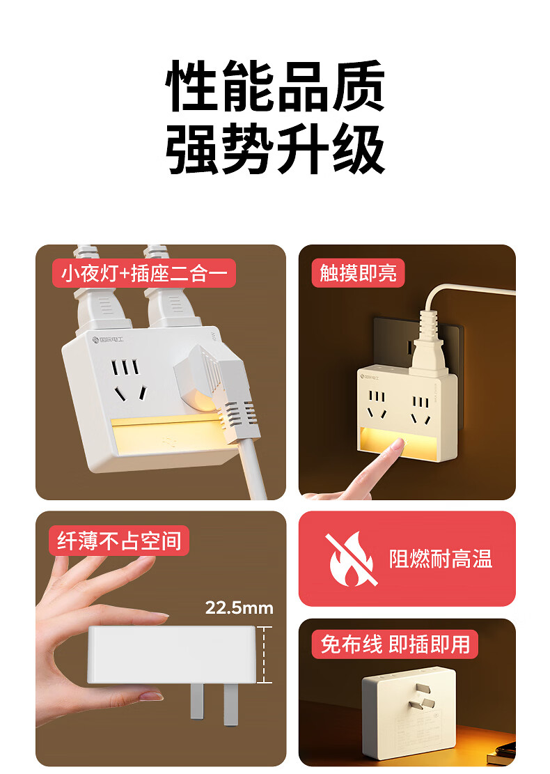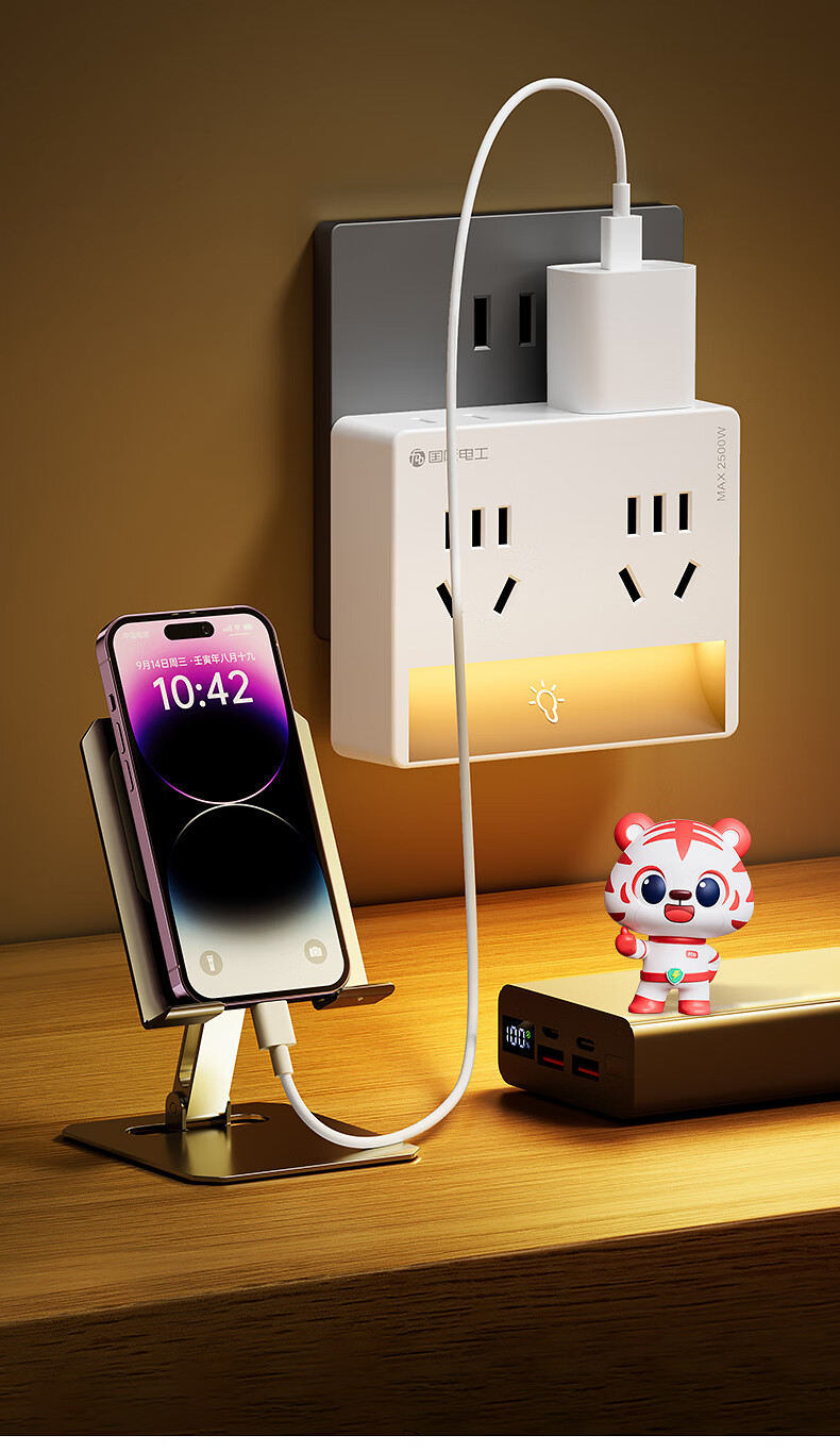 国际电工全光谱小夜灯转换插座免布线家用多功能无线扩展器触摸感应灯插座 一转四向上感应灯【白色】