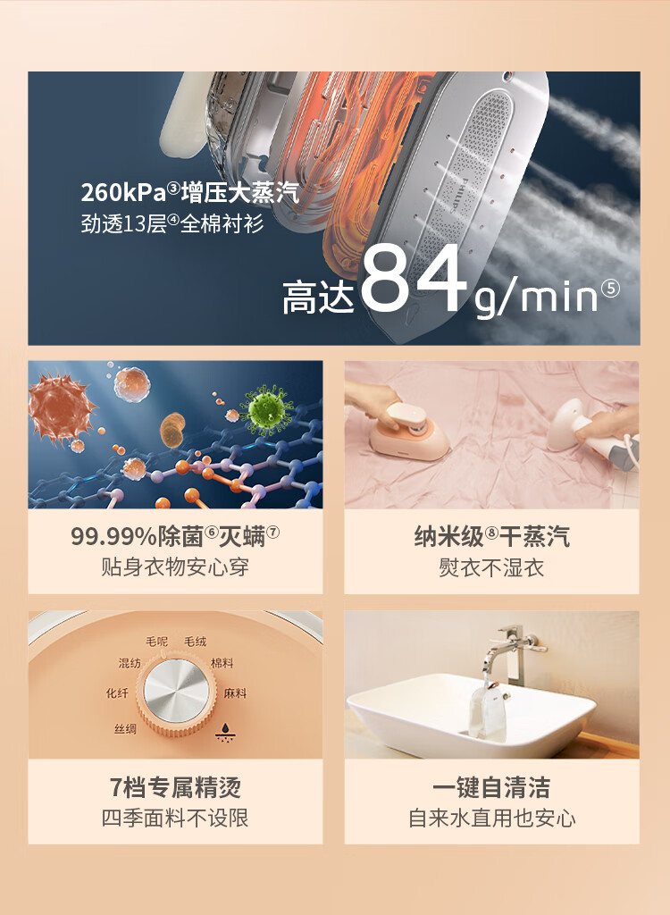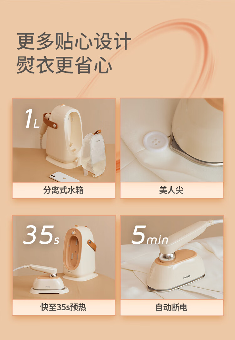 飞利浦(PHILIPS)家用熨烫机熨斗免收纳增压大蒸汽手持台式挂烫机熨烫刷熨烫STE0850/50桃汽包出差旅行便携礼物