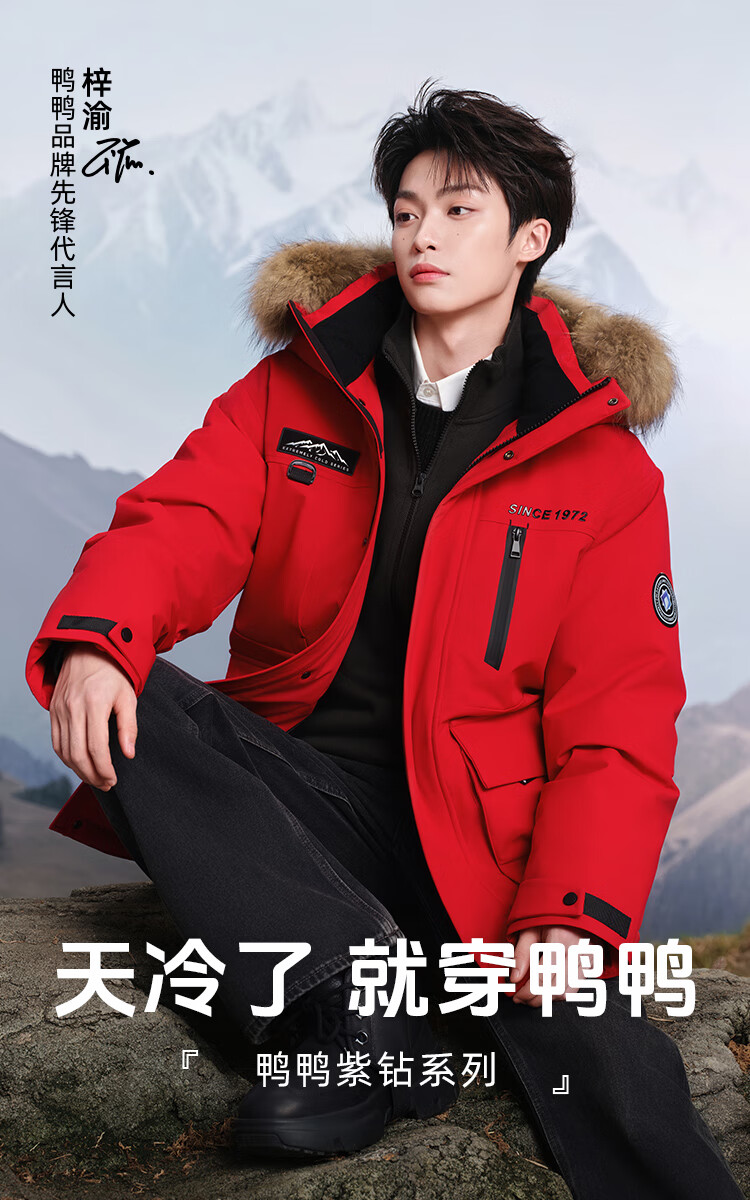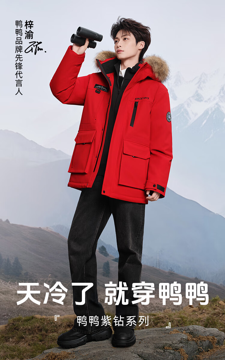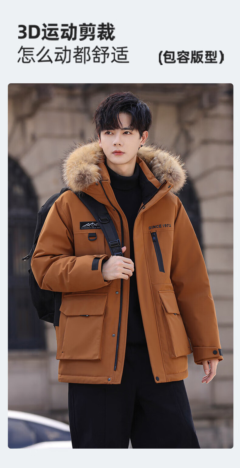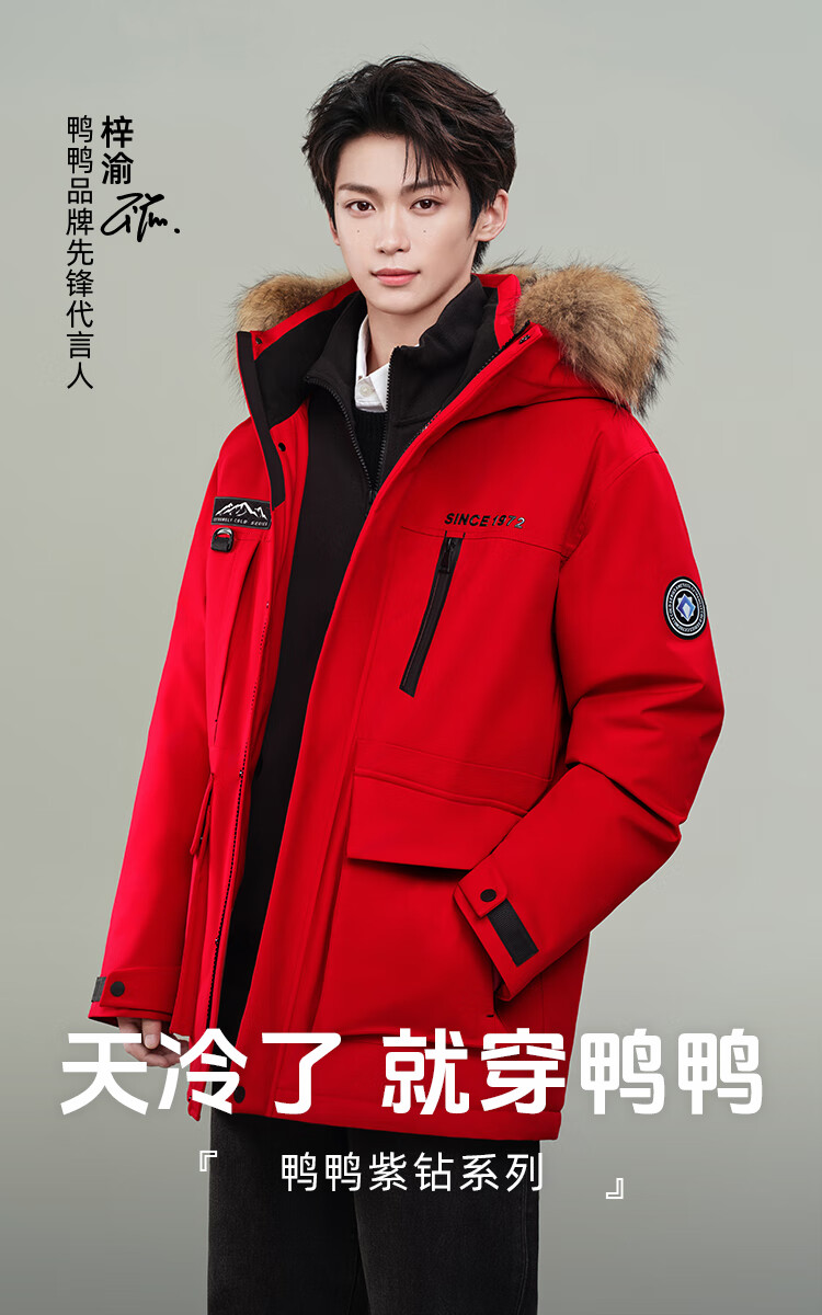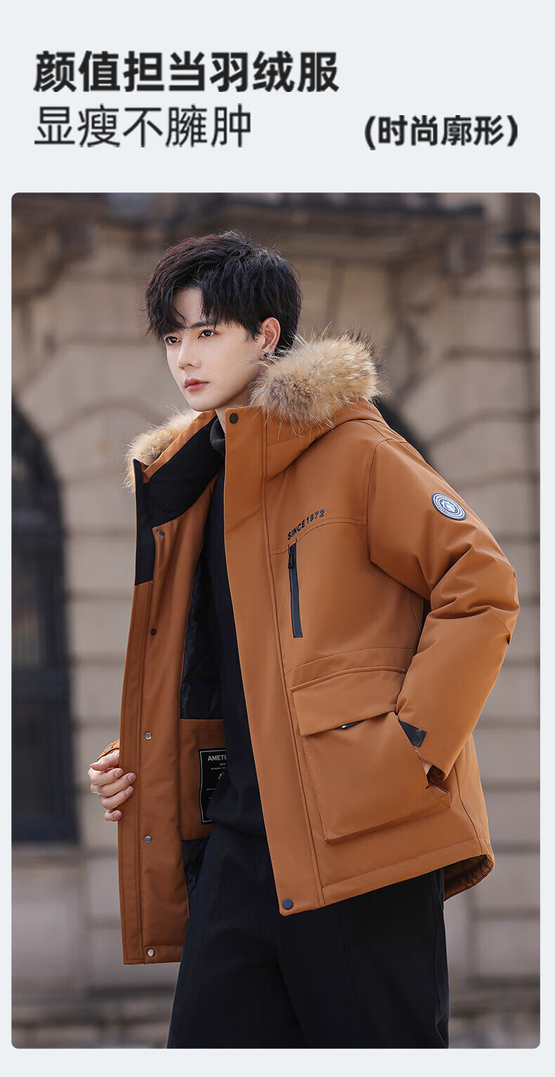 鸭鸭梓渝同款羽绒服男士短款2025冬季新款连帽加厚户外貉子毛领外套DY 中国红色 L 175/92A