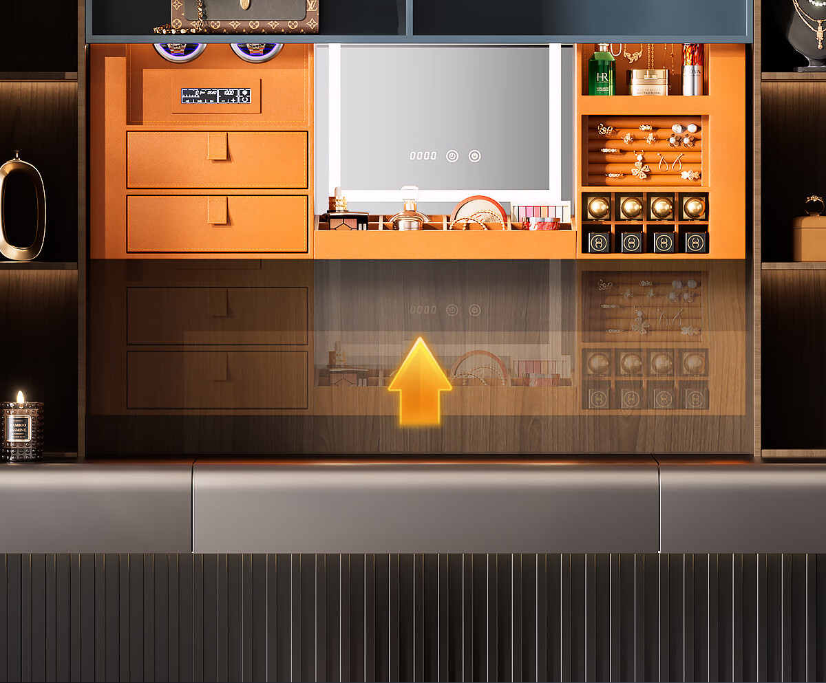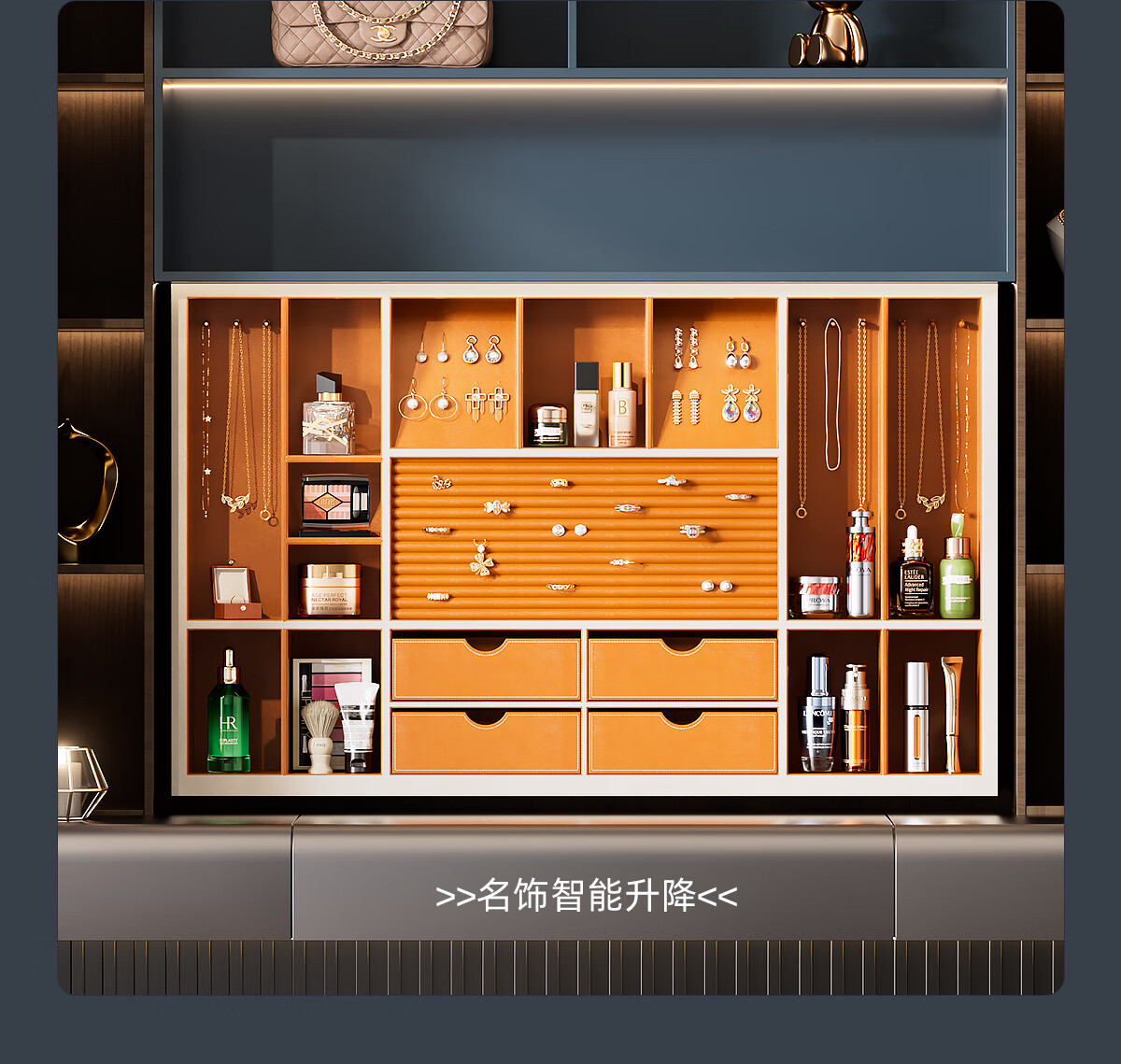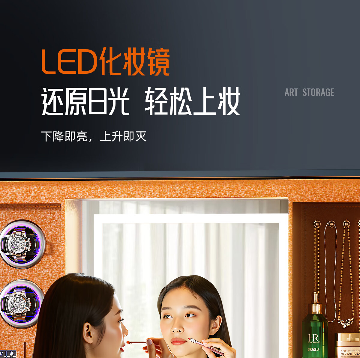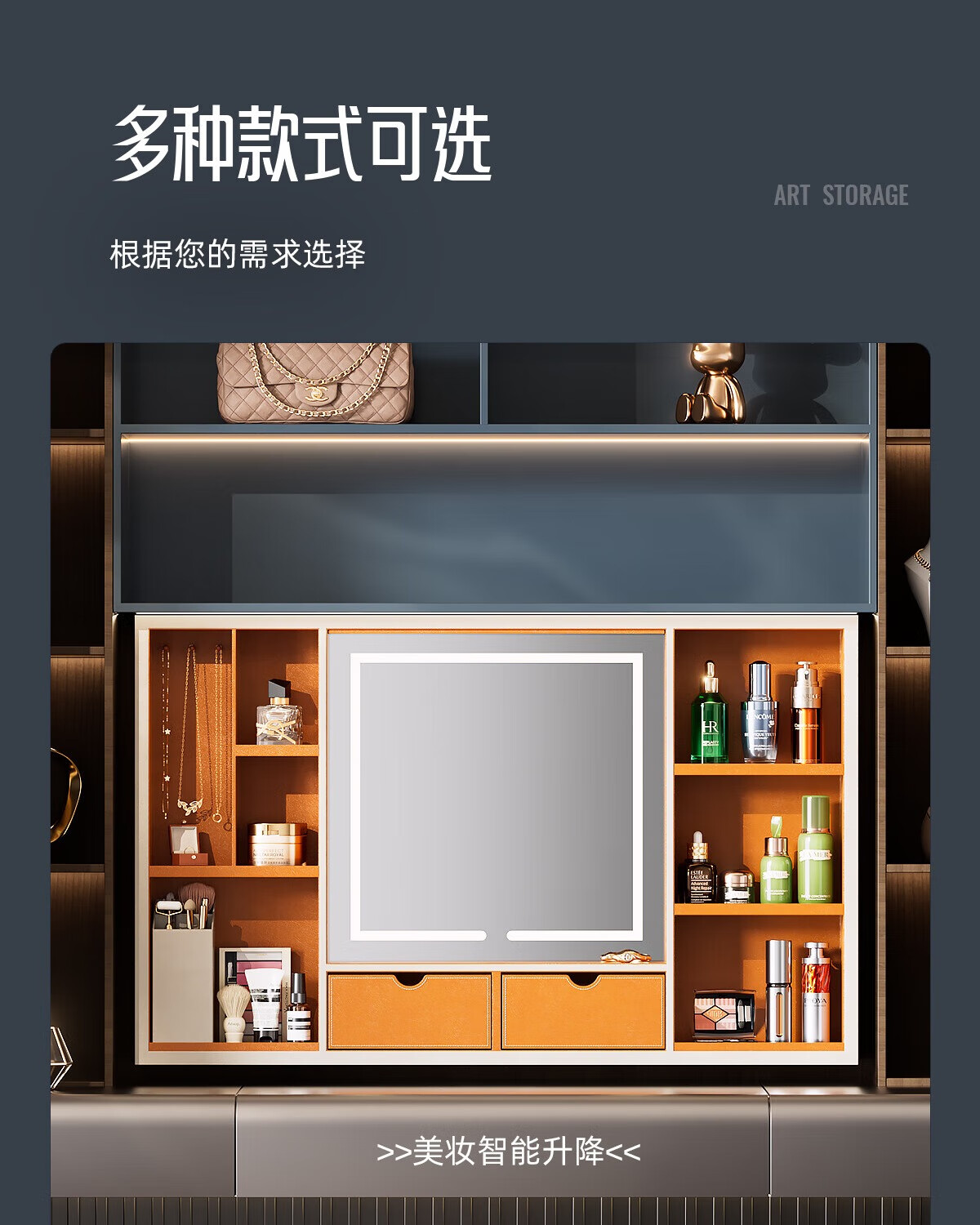 德米莫衣帽间智能电动收纳升降梳妆台化妆镜子隐形摇腕表器高端皮革 慕颜1300柜-指纹遥控+涂鸦智能【15天发】