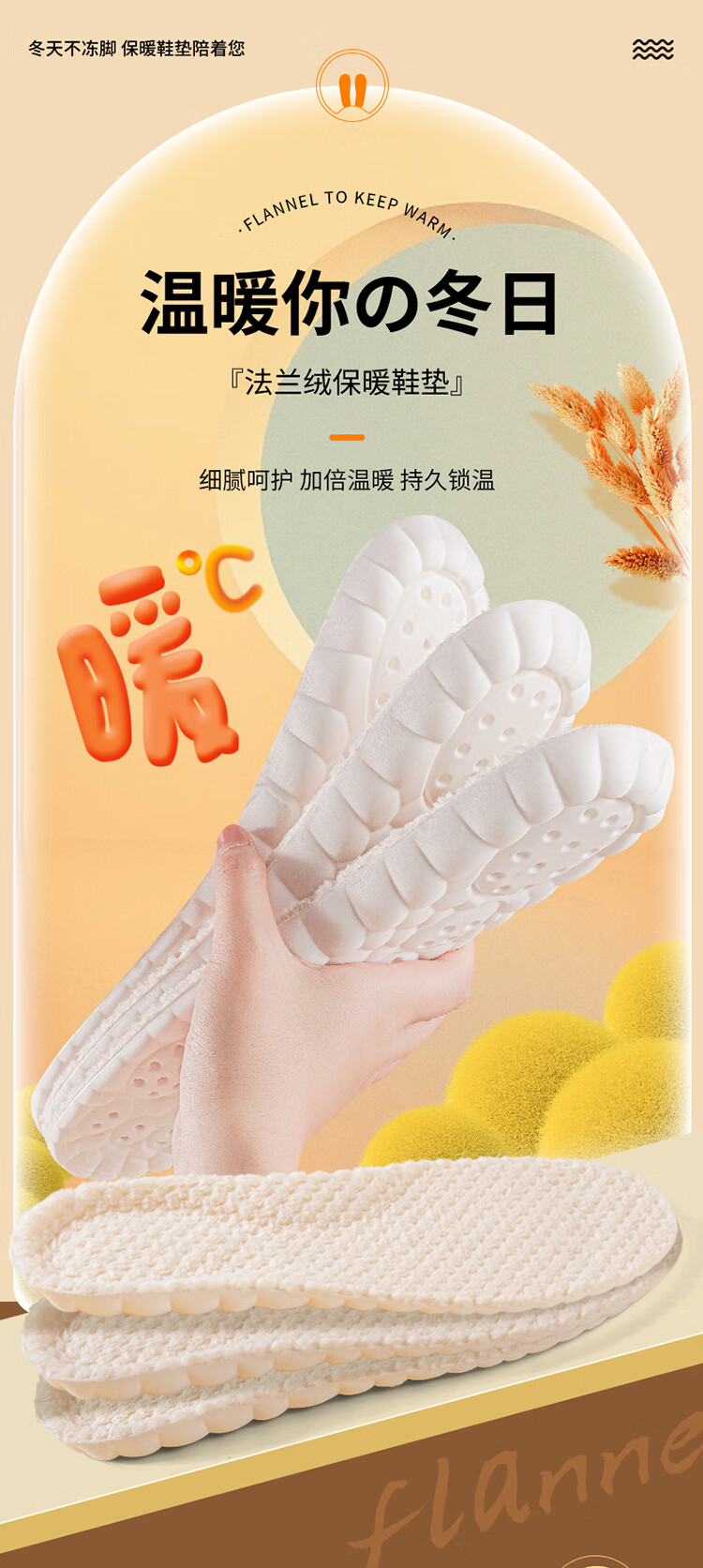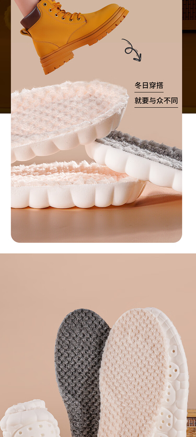 足印部落加厚保暖鞋垫男款运动减震加绒冬季防寒雪地靴棉鞋垫女软弹踩屎感 3双装-米色】加厚法兰绒保暖款 3536码