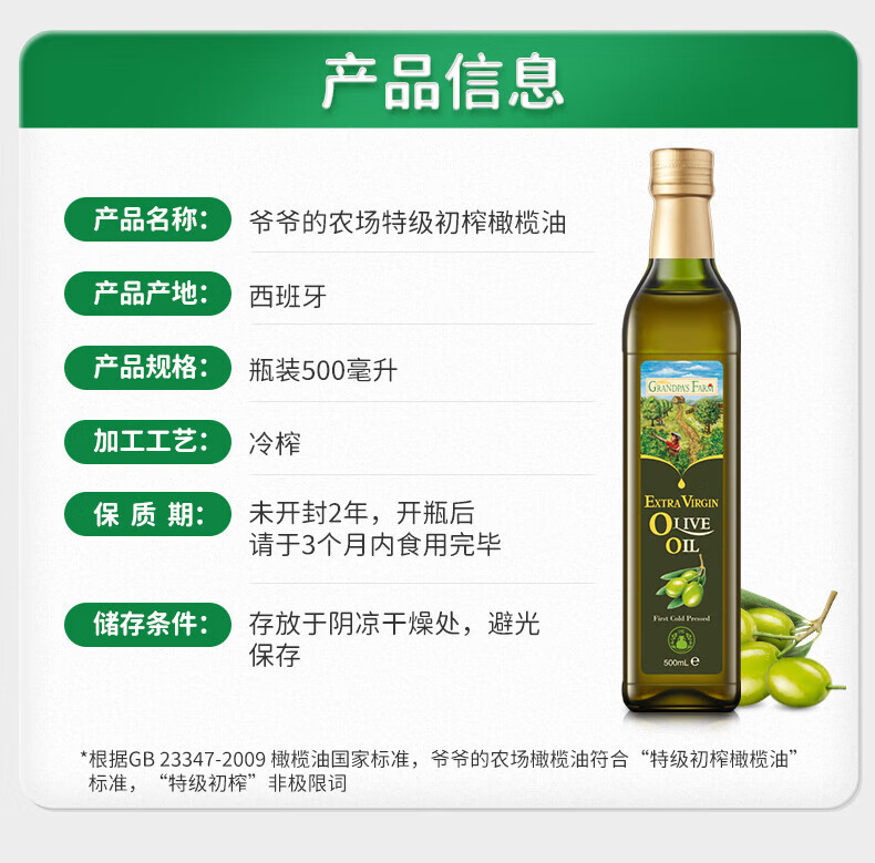 爷爷的农场核桃亚麻籽营养油 宝宝儿童辅食油热炒凉拌全家食用油 特级橄榄油500ml