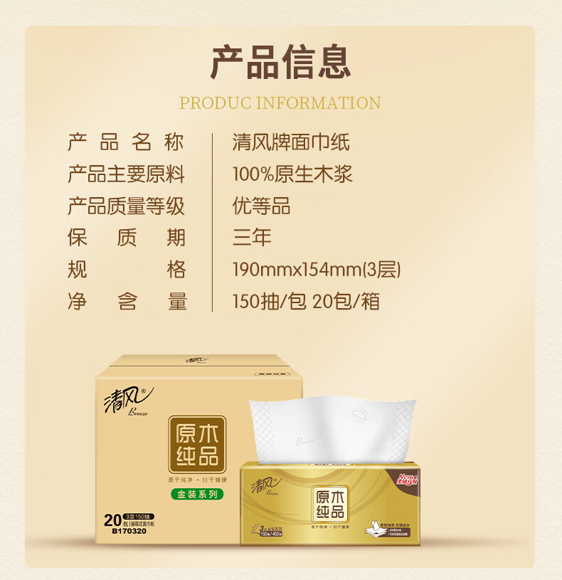 清风(APP)抽纸 金装3层150抽*20包M码 面巾纸 纸巾抽 餐巾纸 整箱装