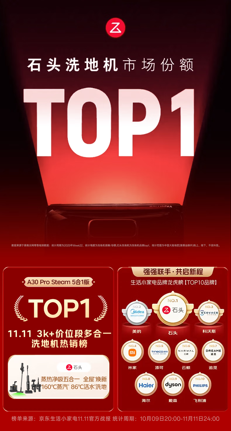 石头A30 Pro Steam5合1【160°蒸汽86°C热水全屋清洁】全向助力洗地机0缠毛0异味扫地机器人