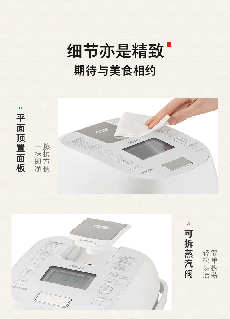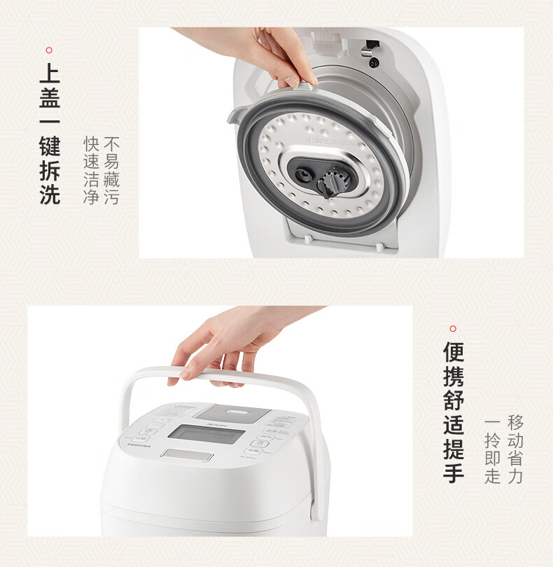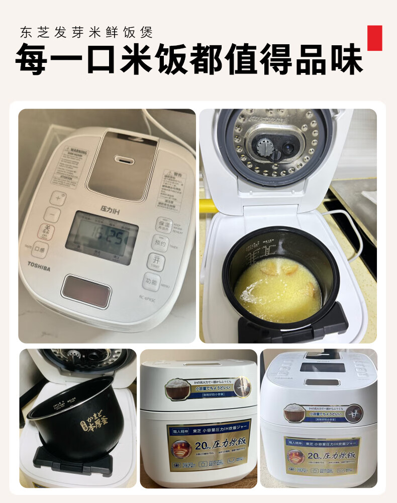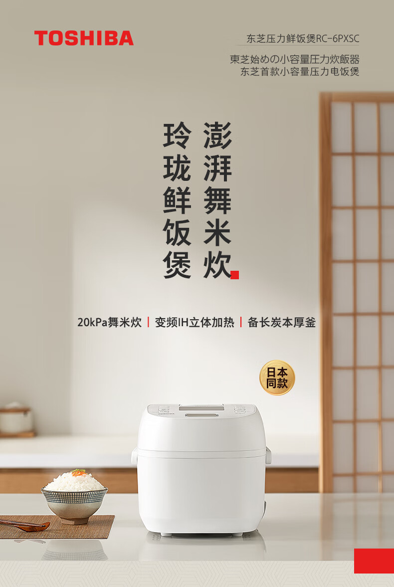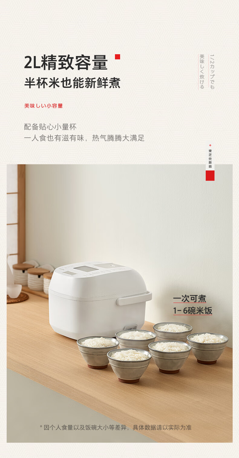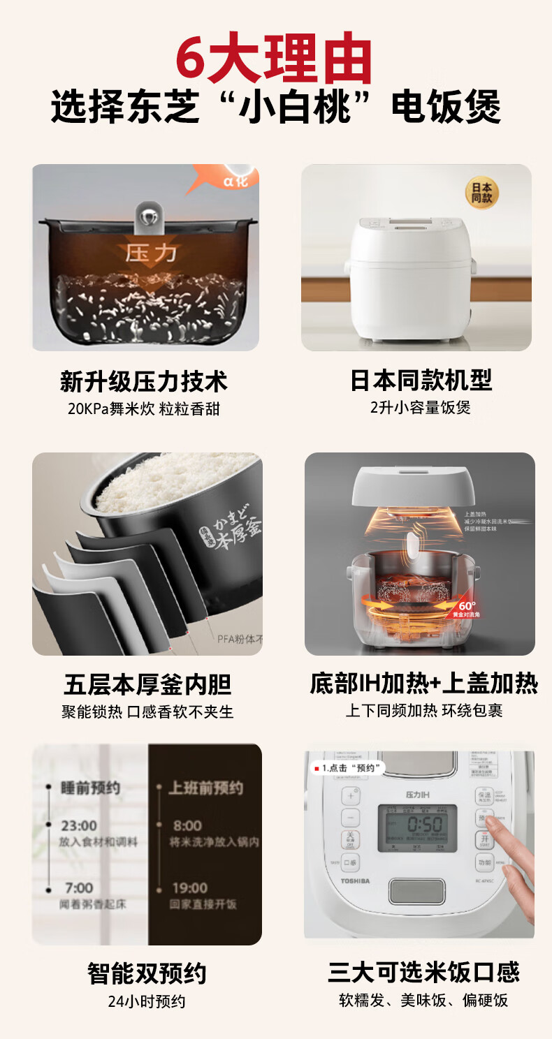东芝(TOSHIBA)小白桃0涂层迷你鲜饭煲 进口不沾涂层 多功能家用智能IH加热微压力小型电饭锅1-2人线下 日本同款 RC-6PXSC【微压焖香】 2L