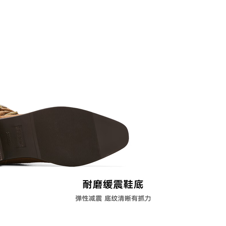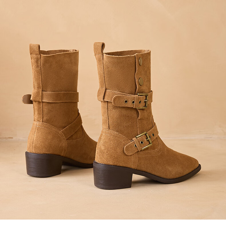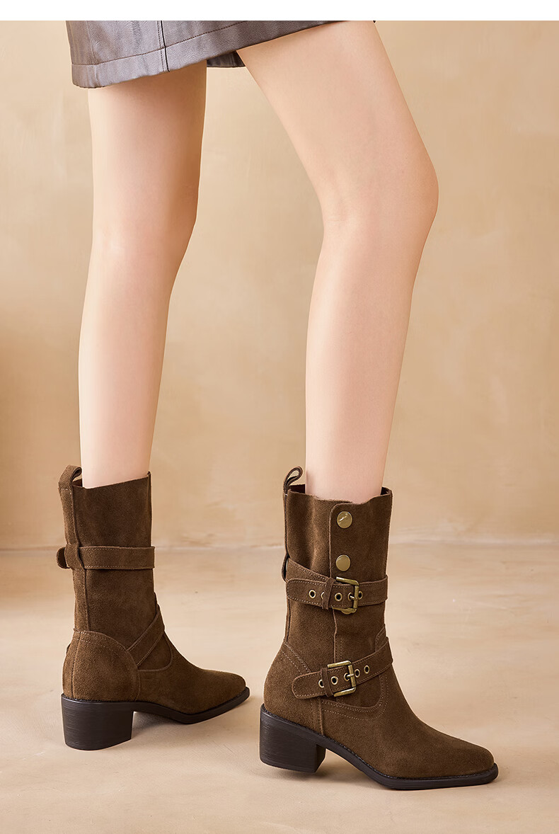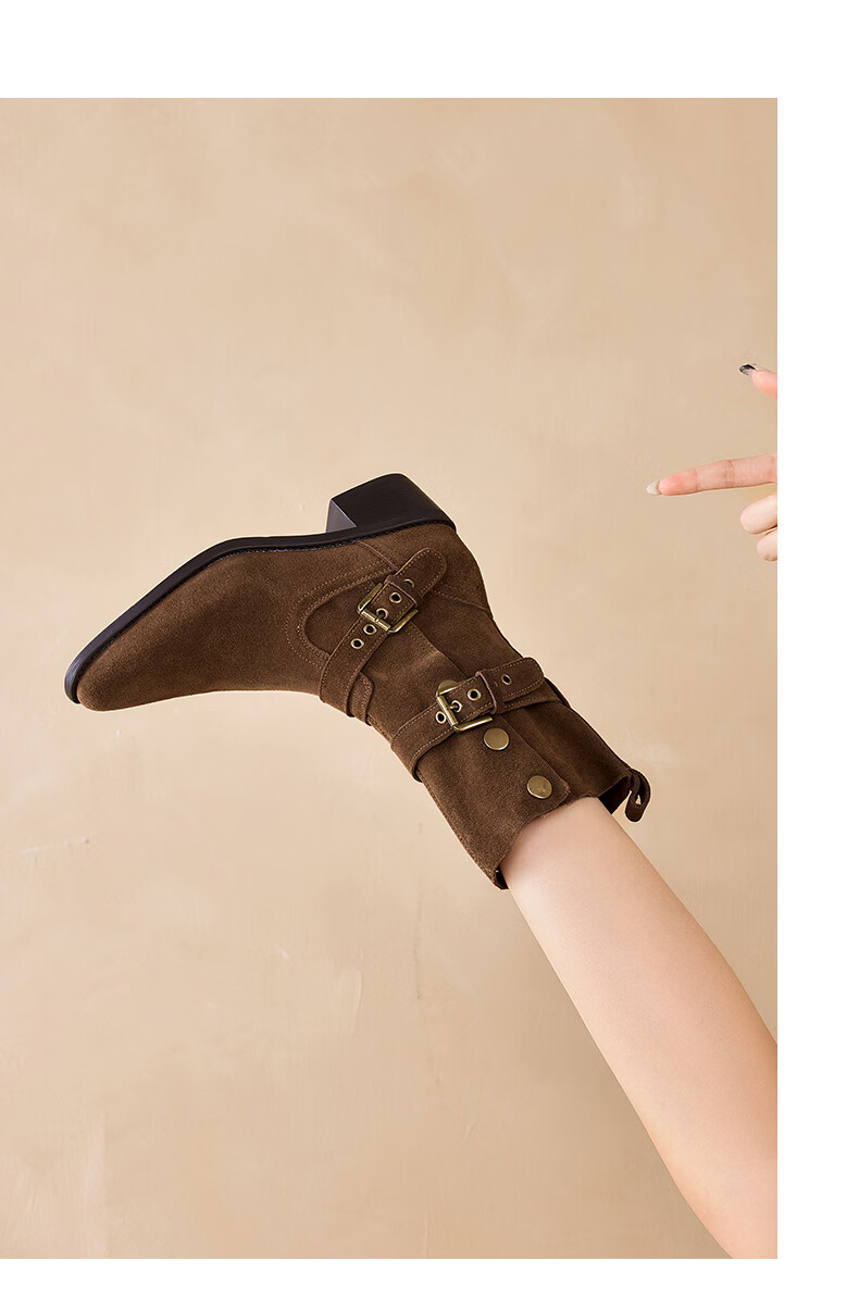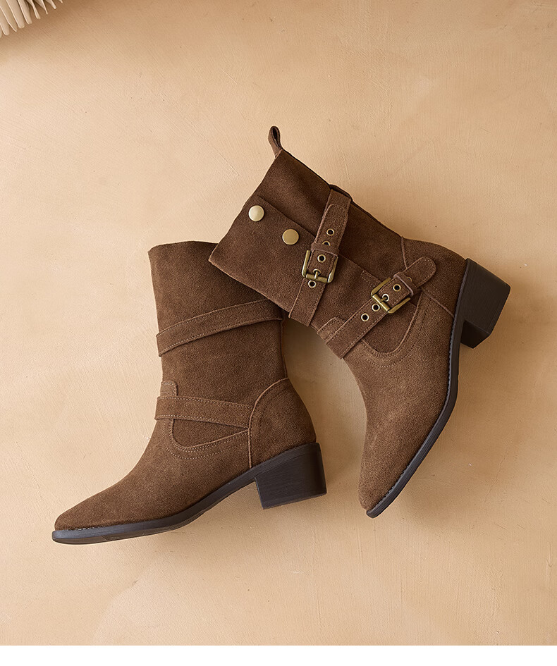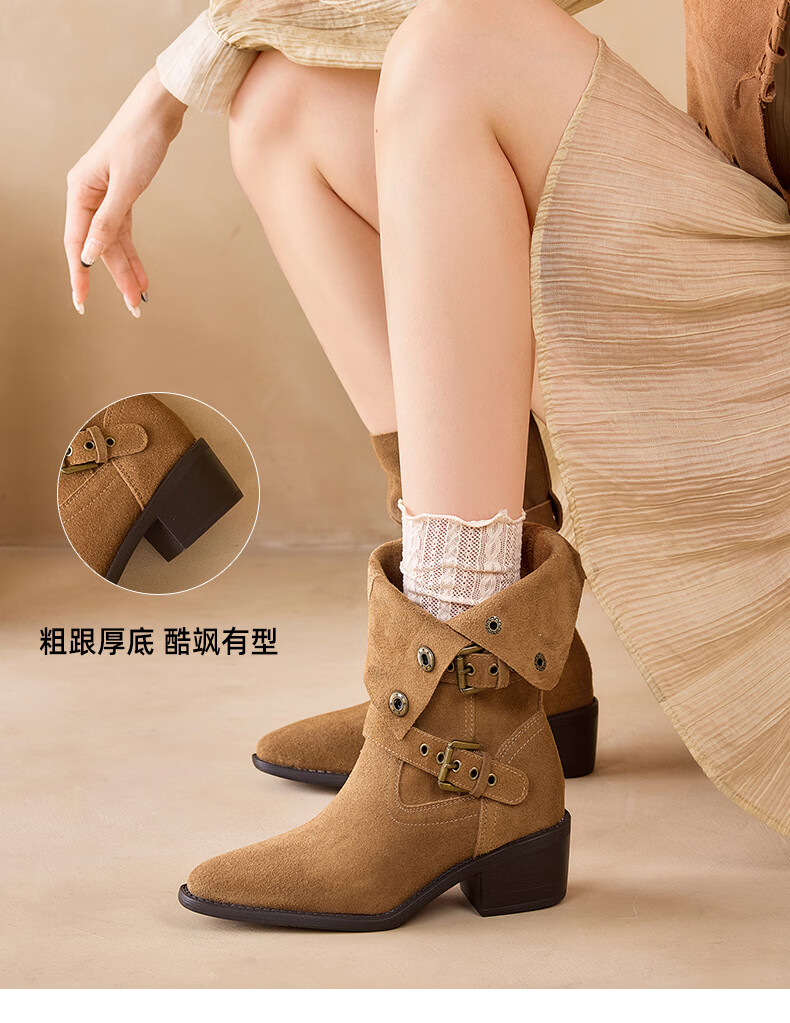 星期六粗跟短靴女款2025新款冬季尖头棕色靴子女西部牛仔马丁靴女 咖色 35
