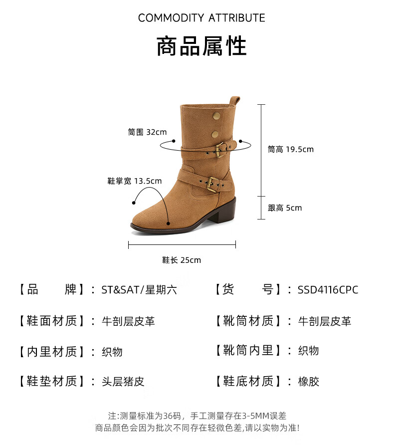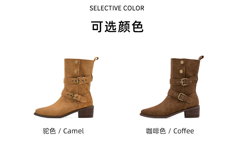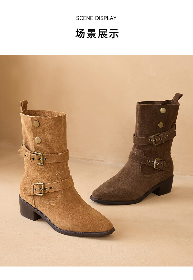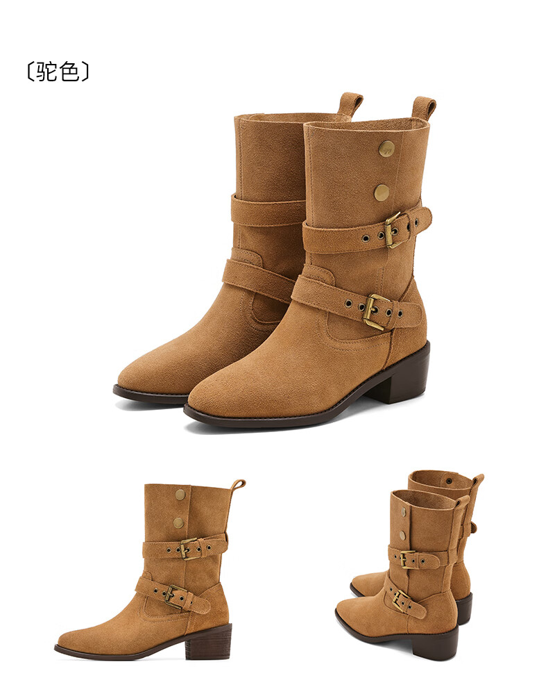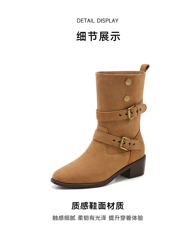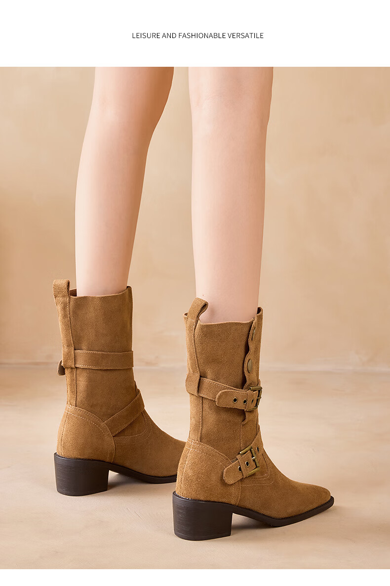 星期六粗跟短靴女款2025新款冬季尖头棕色靴子女西部牛仔马丁靴女 咖色 35