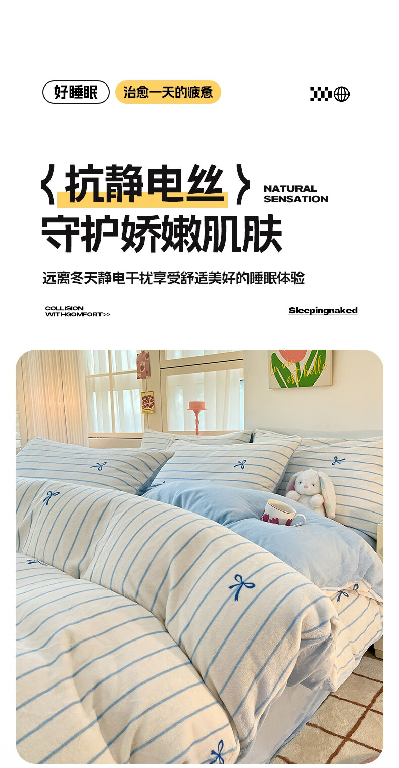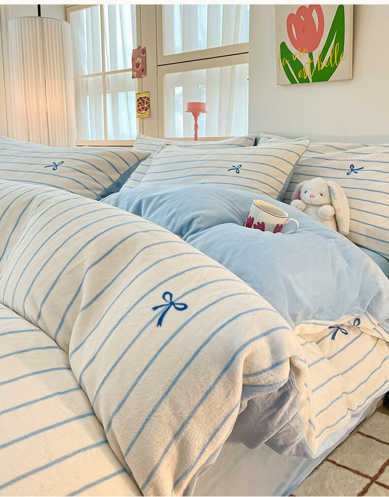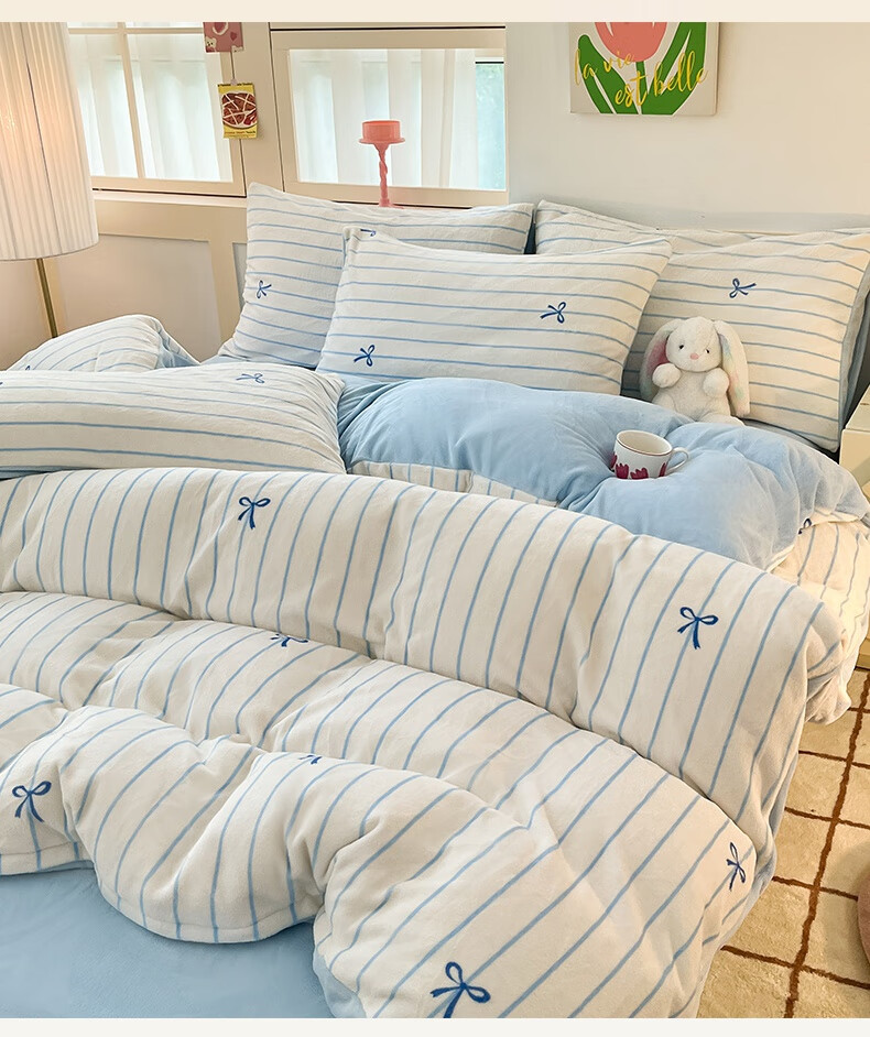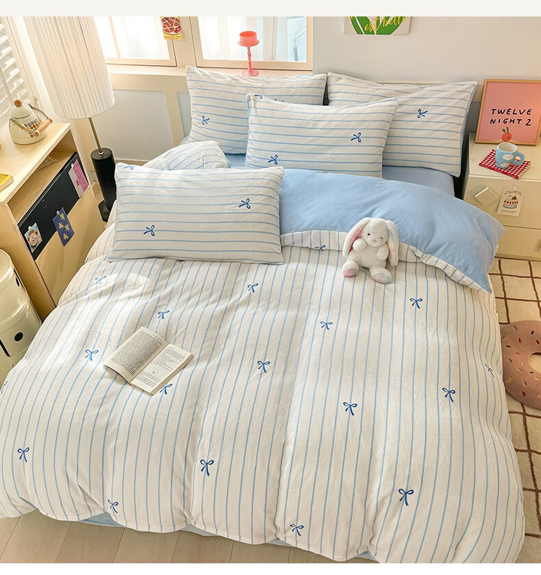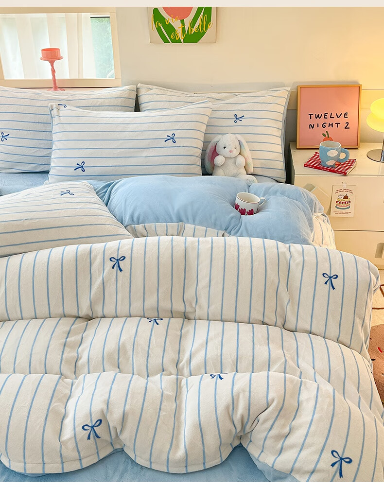 猫人(MiiOW)冬季加厚牛奶绒床上四件套2025新款加绒珊瑚绒床单被套床品三件套 浅灰蝴蝶结【双面加厚牛奶绒 加倍保暖】 床笠款 1.5m床四件套-适合200x230cm被芯