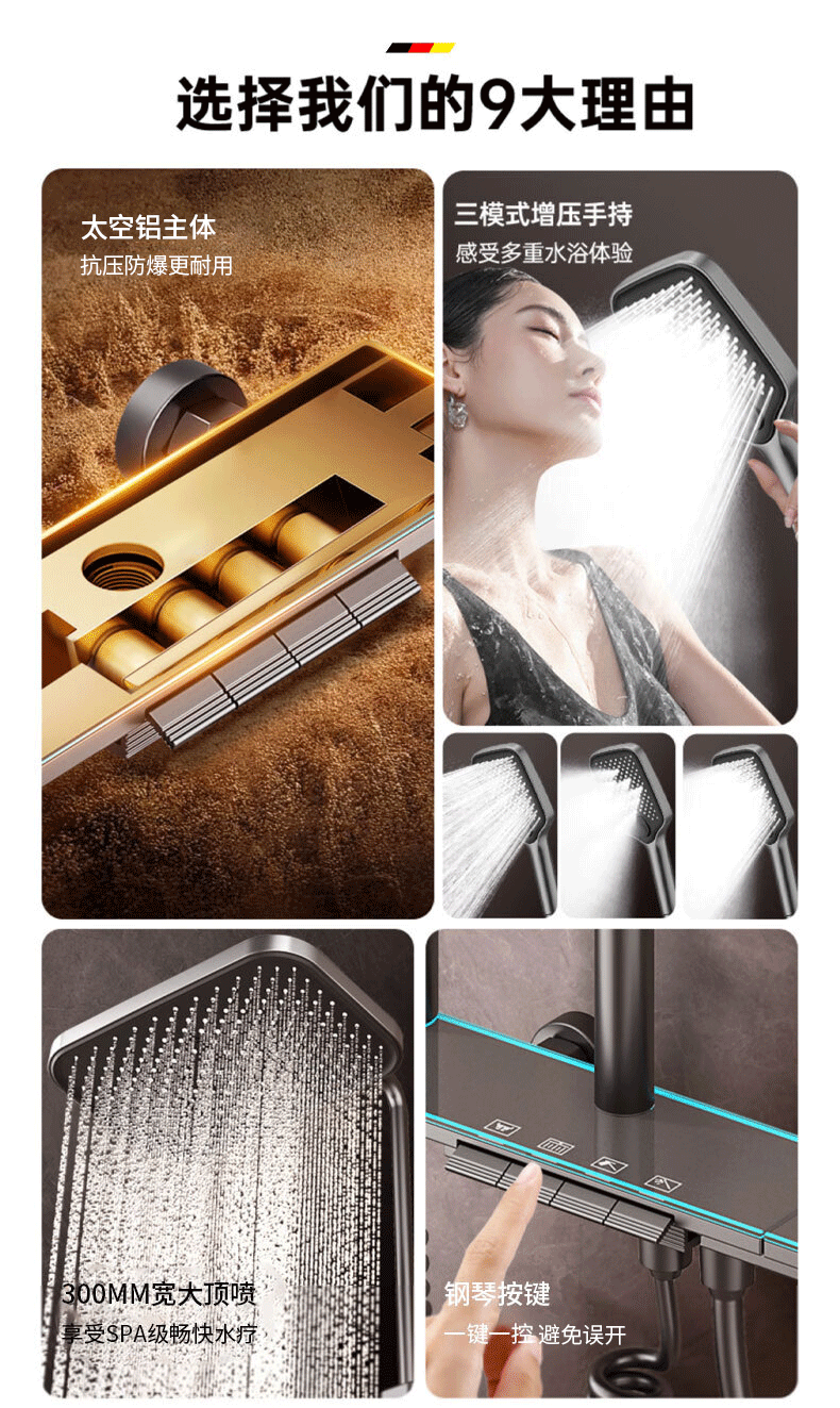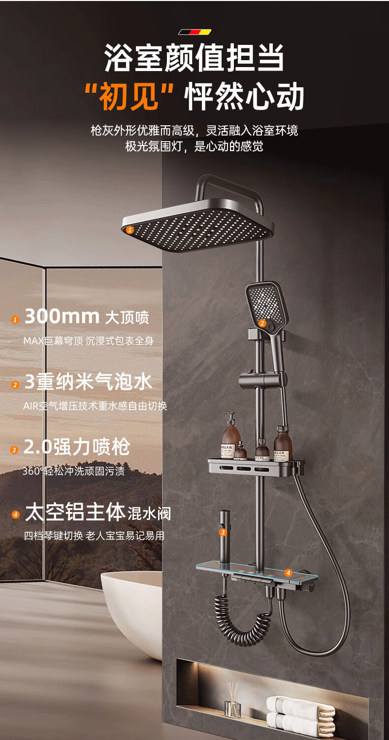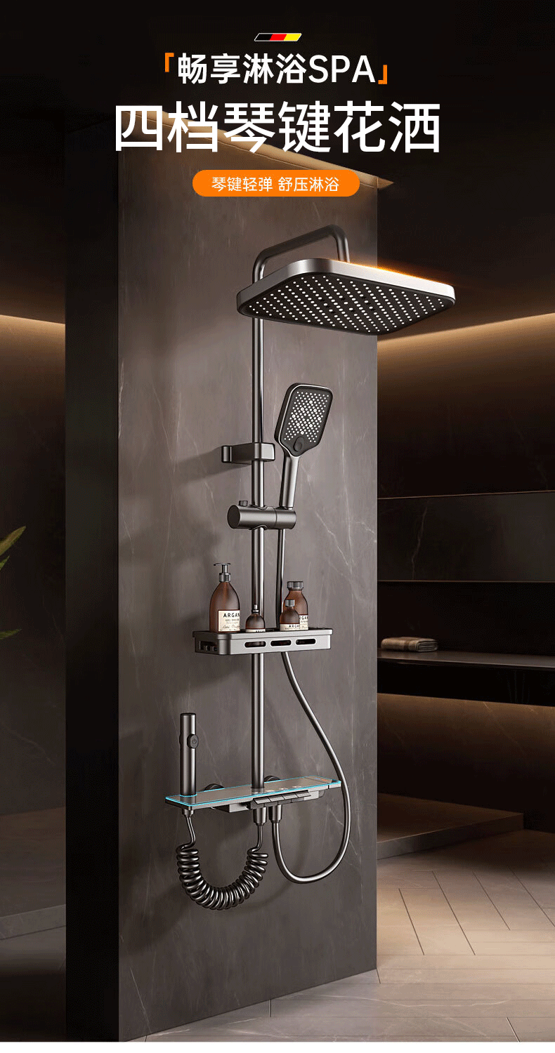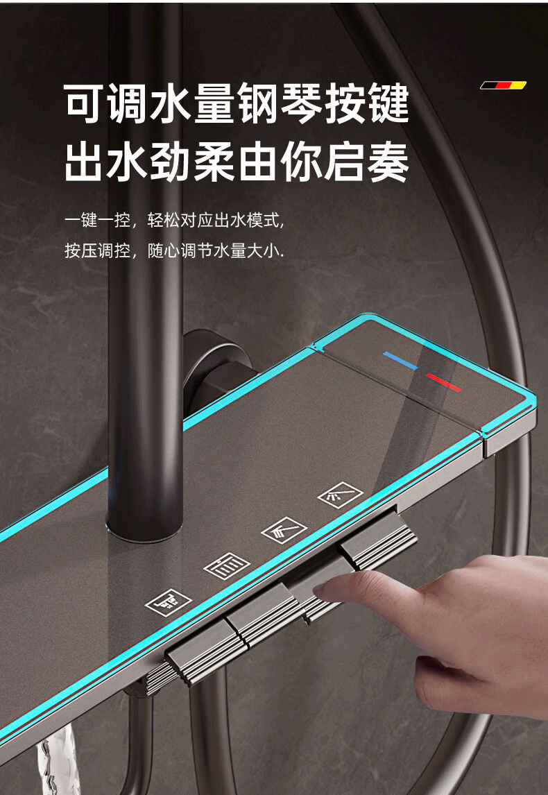 CUNKOY【德国】智能淋浴花洒套装恒温冷热增压淋浴全套一体整套2025新款 四档琴键花洒套装-动感氛围灯 太空铝主体丨钢琴按键丨创新氛围灯