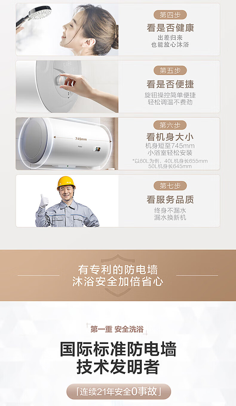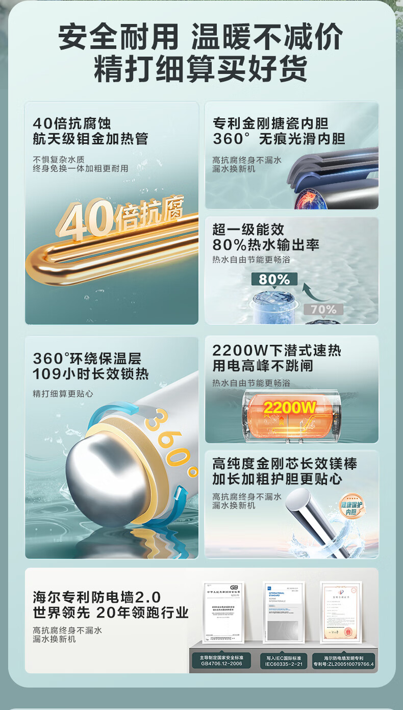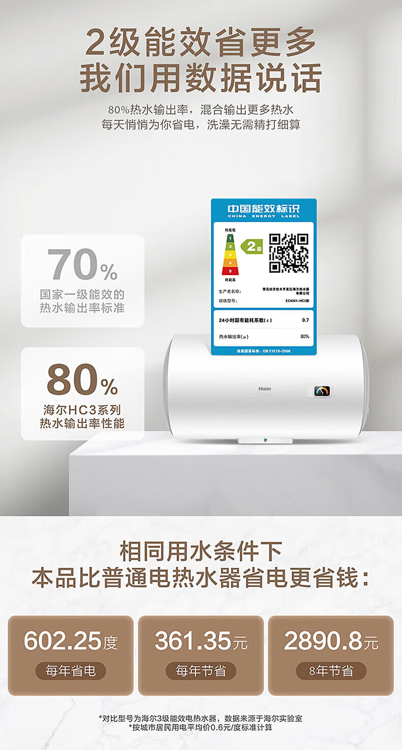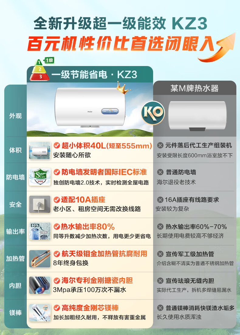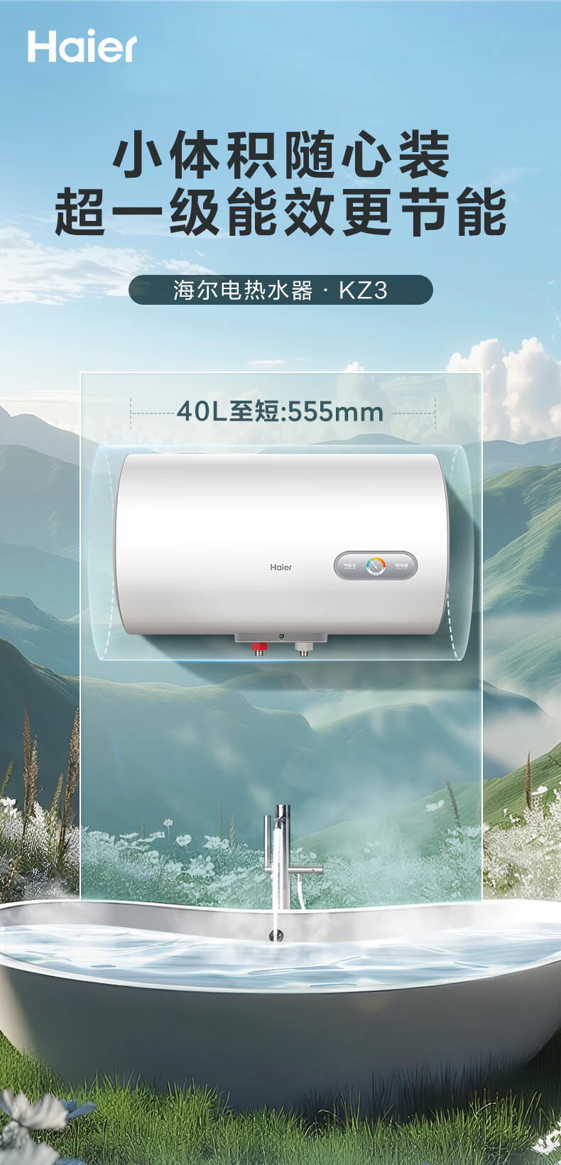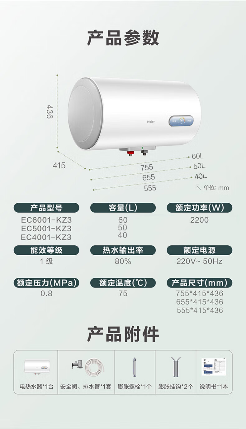 海尔(Haier)热水器电热水器50升【咨询客服享补贴 】家用储水式2200W速热KZ3一级能效小户型租房优选防电墙2.0 40L 2200W 一级节能KZ3