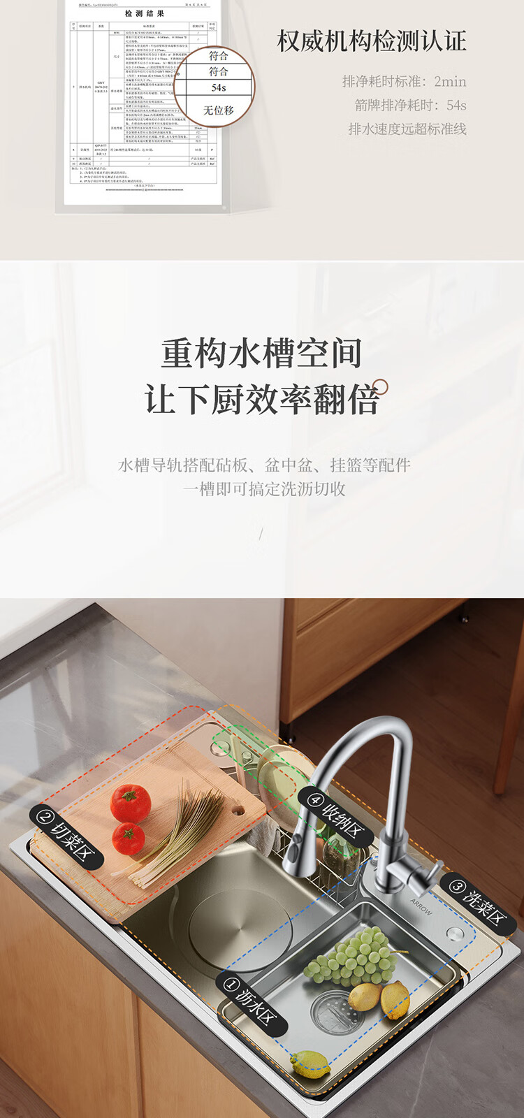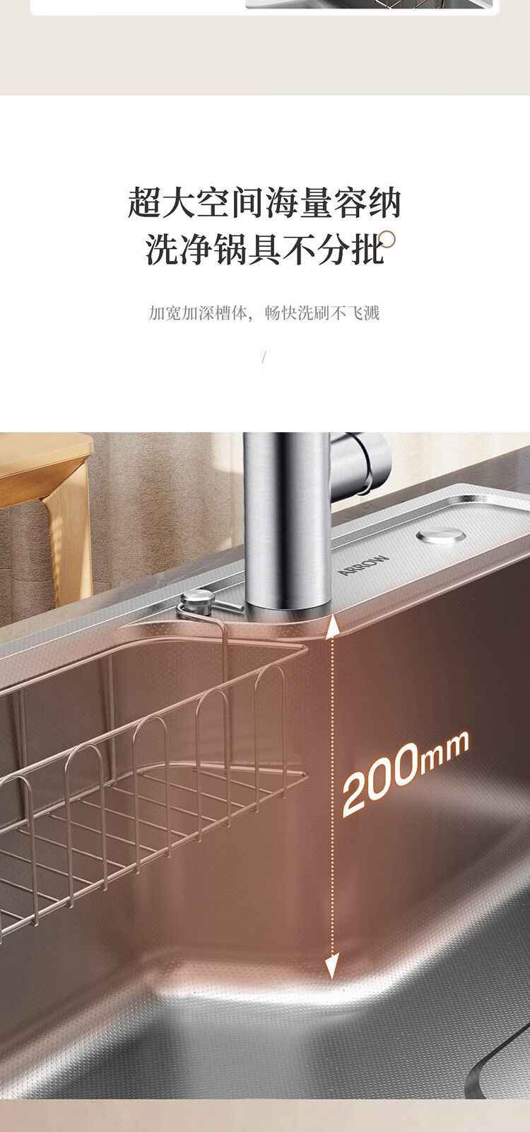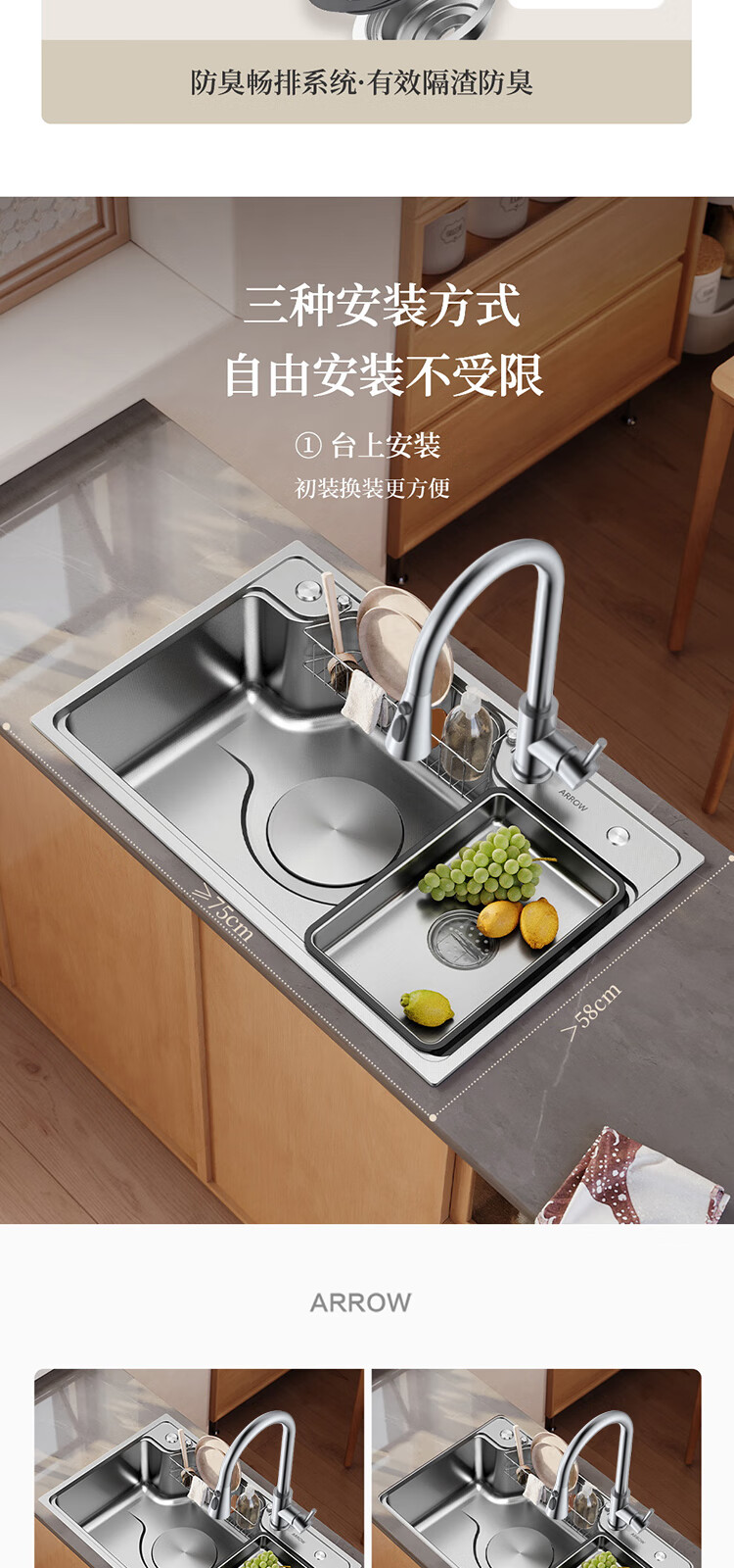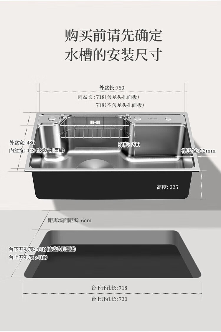 箭牌(ARROW)水槽厨房洗菜盆不锈钢家用日式大单槽AE5575452G23-YSS·75*48