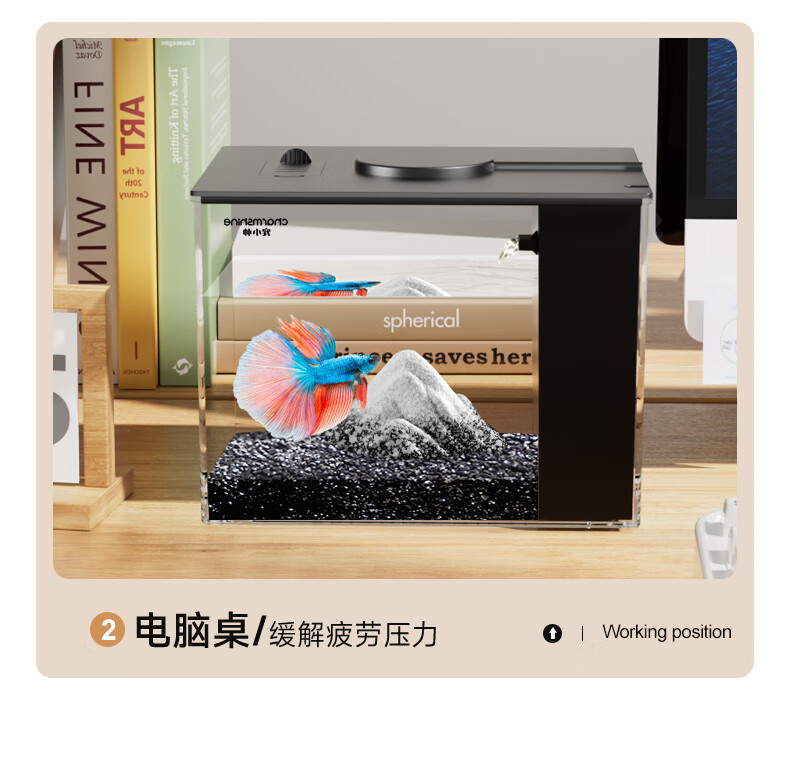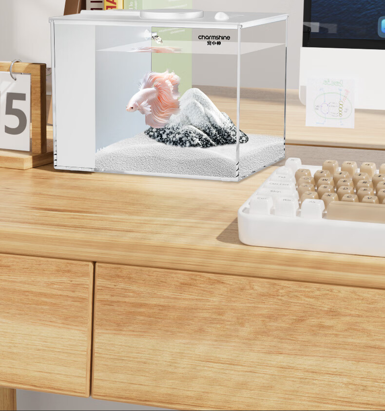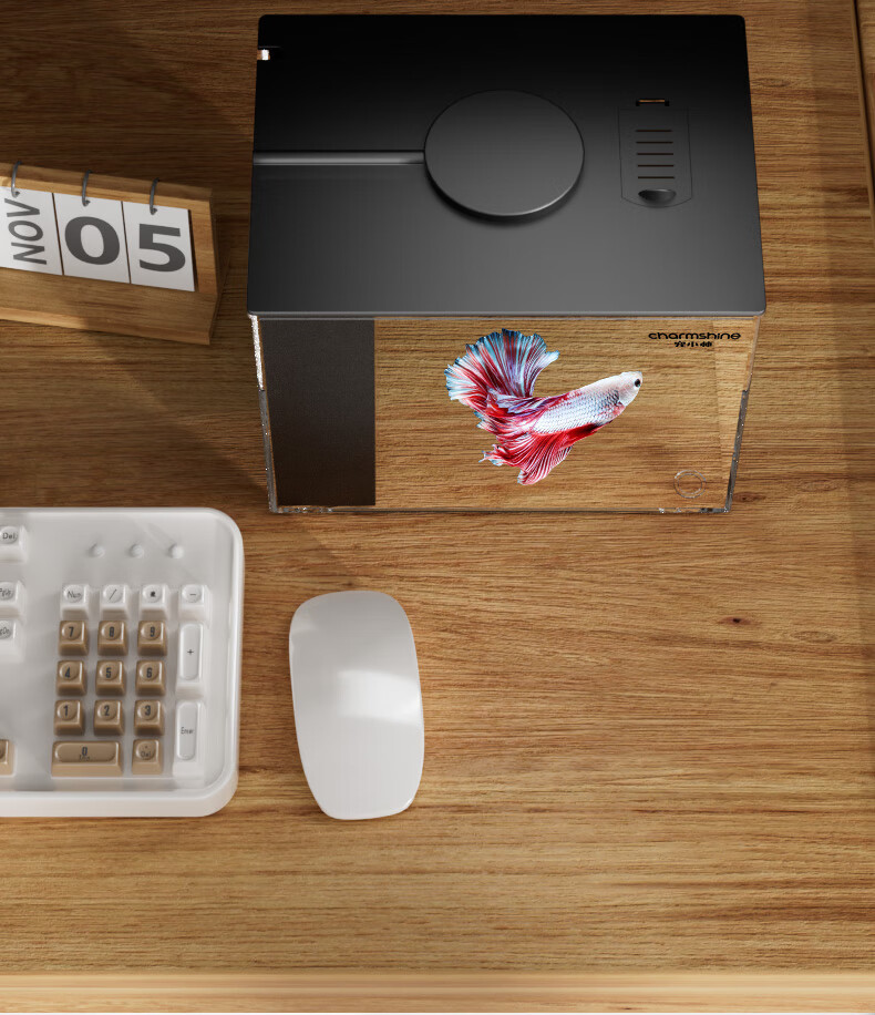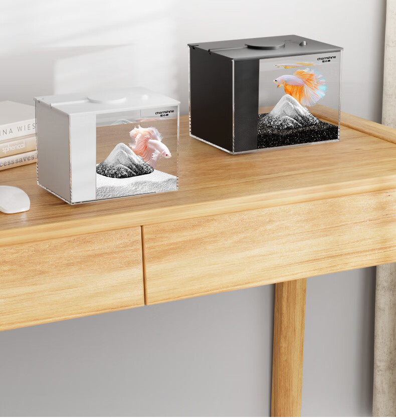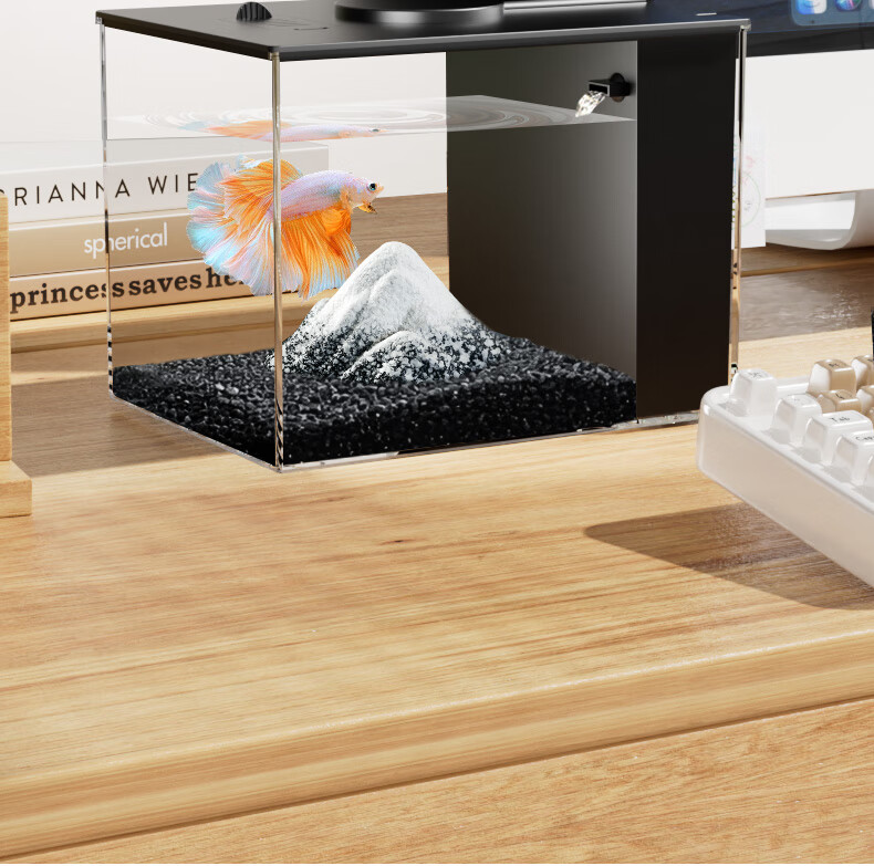 宠小帅智能桌面鱼缸办公桌小鱼缸增氧循环净水一体缸雪山造景工位斗鱼缸 酷感黑【MINI智能鱼缸】 15x11x13CM【小号】