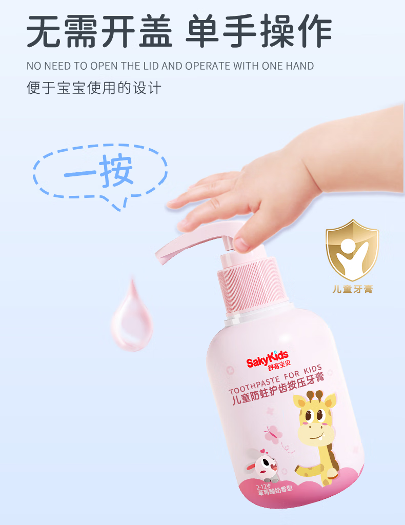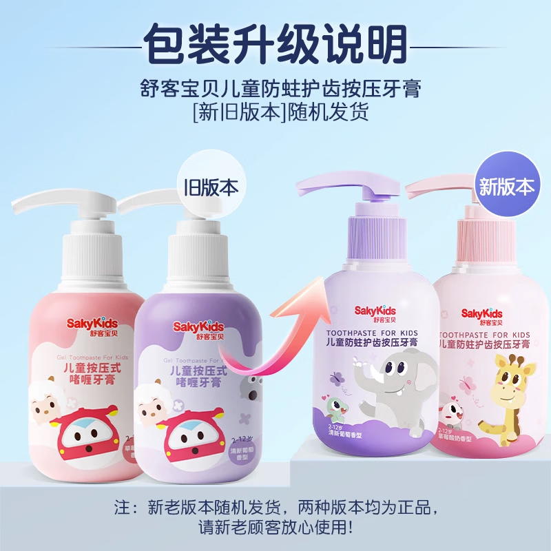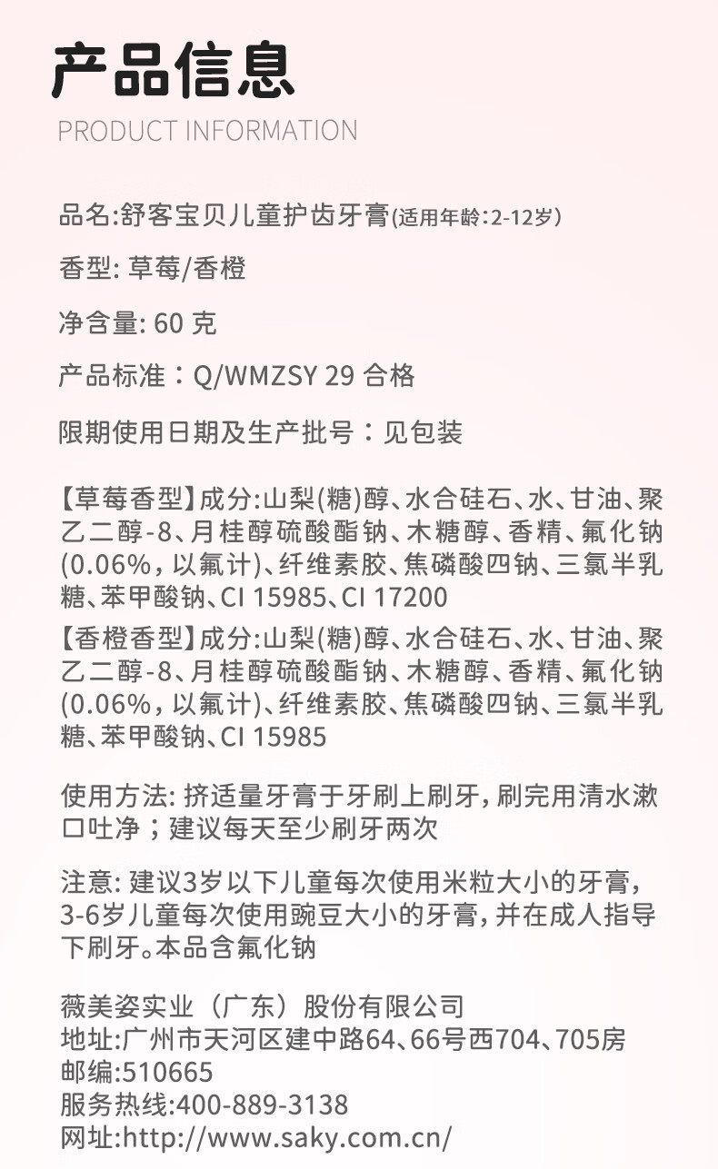 舒客按压式儿童宝宝牙膏含氟防蛀3一6一12岁以上换牙期 草莓香型+鲜橙香型 60g 4支