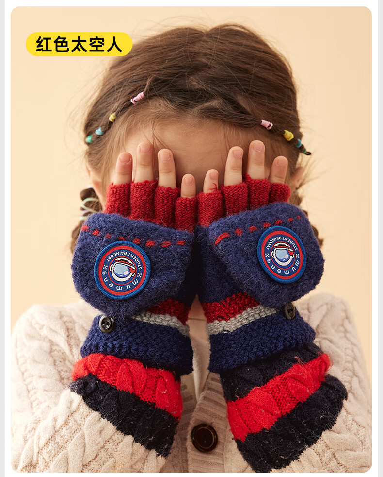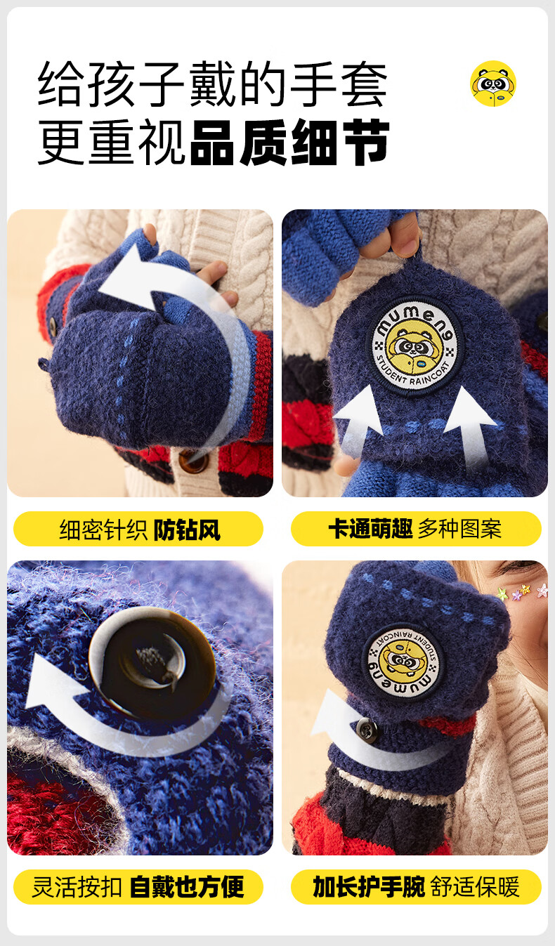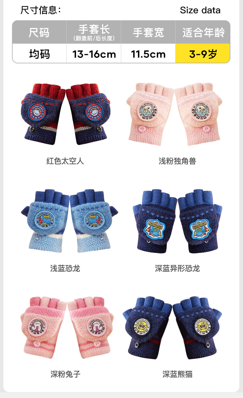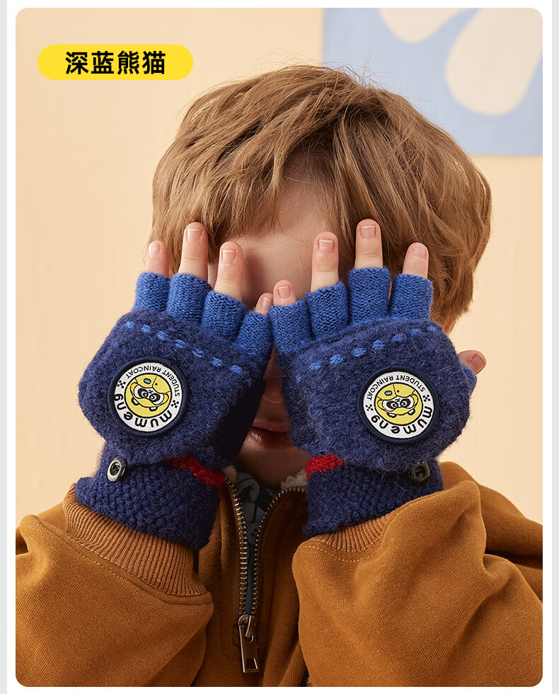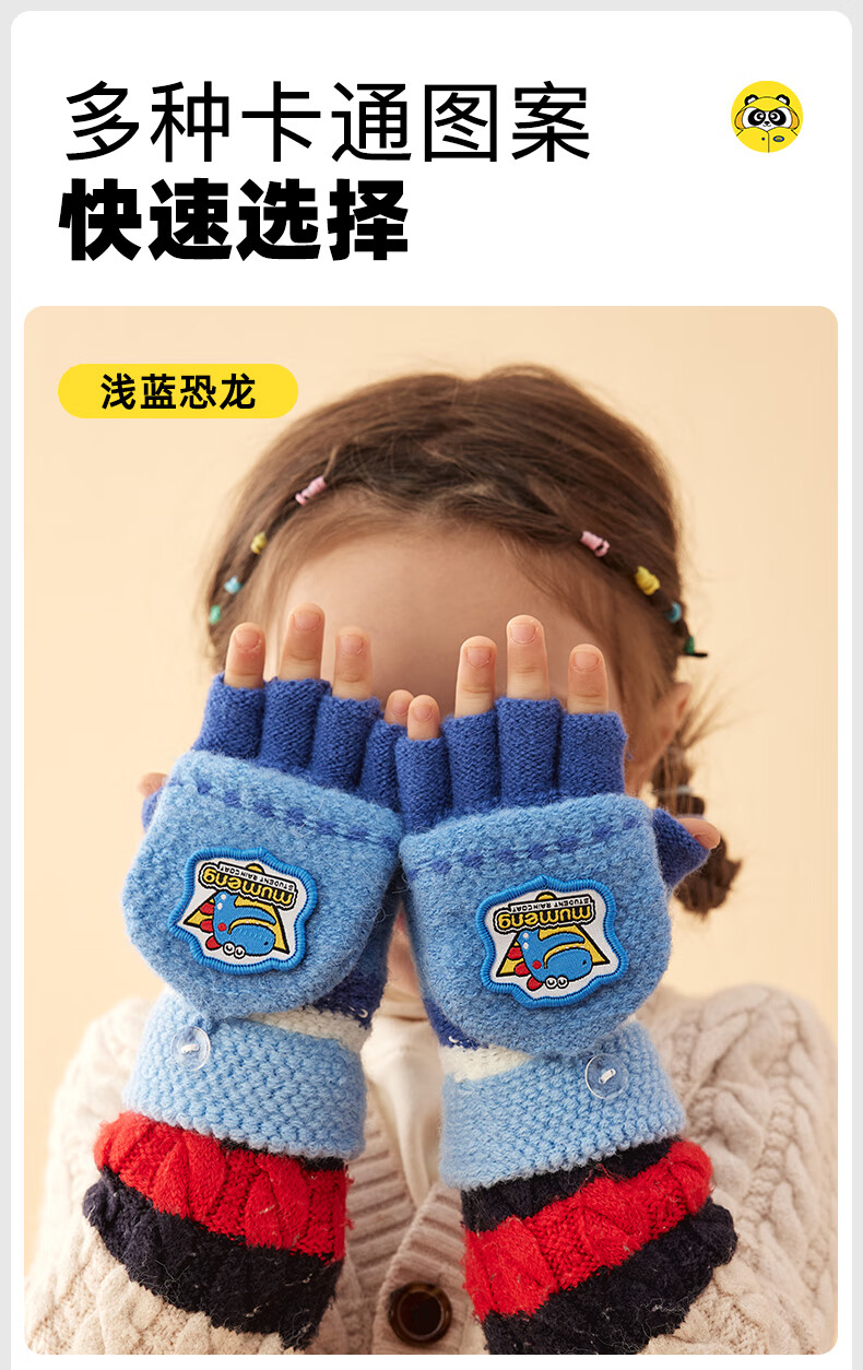 牧萌儿童手套男童女童秋冬季翻盖手套保暖小学生半指写字可爱毛线手套 深蓝恐龙【半指-翻盖两用】 2-9岁宝宝【高弹力】