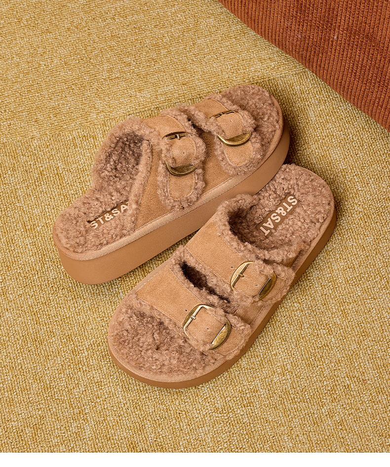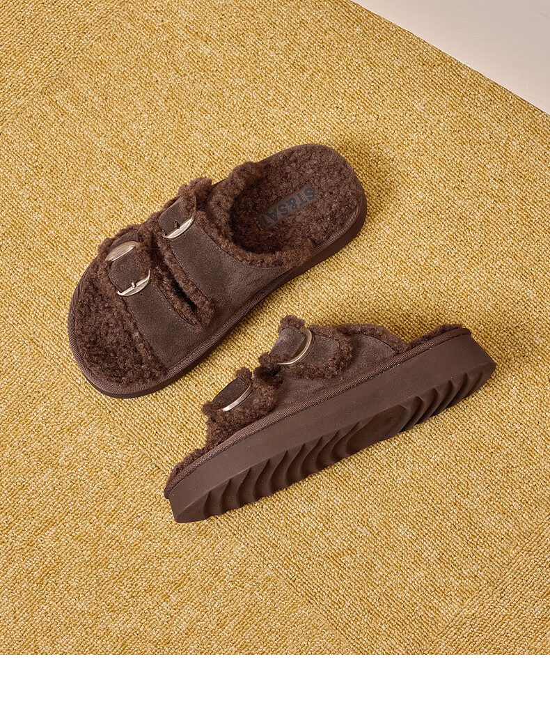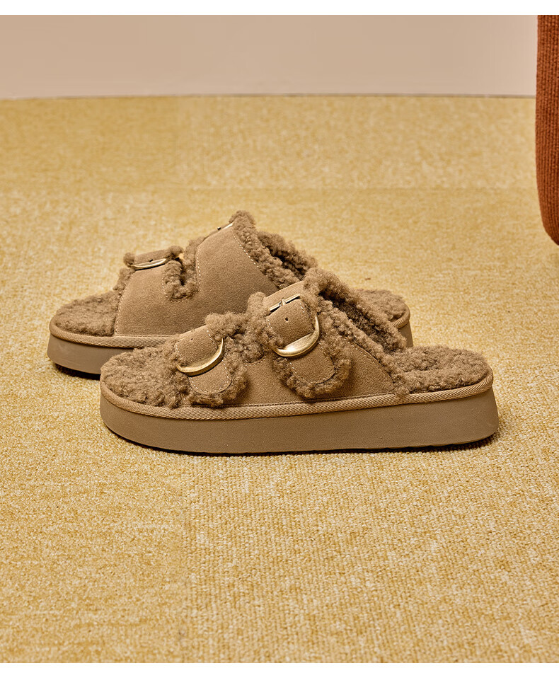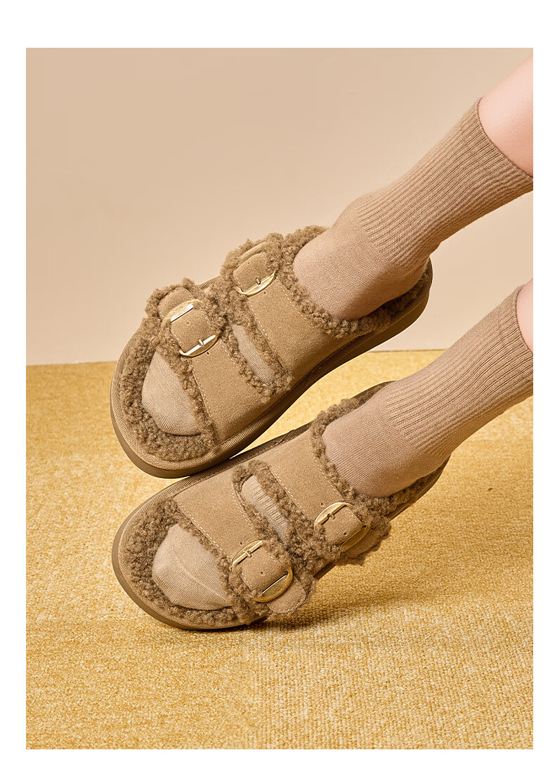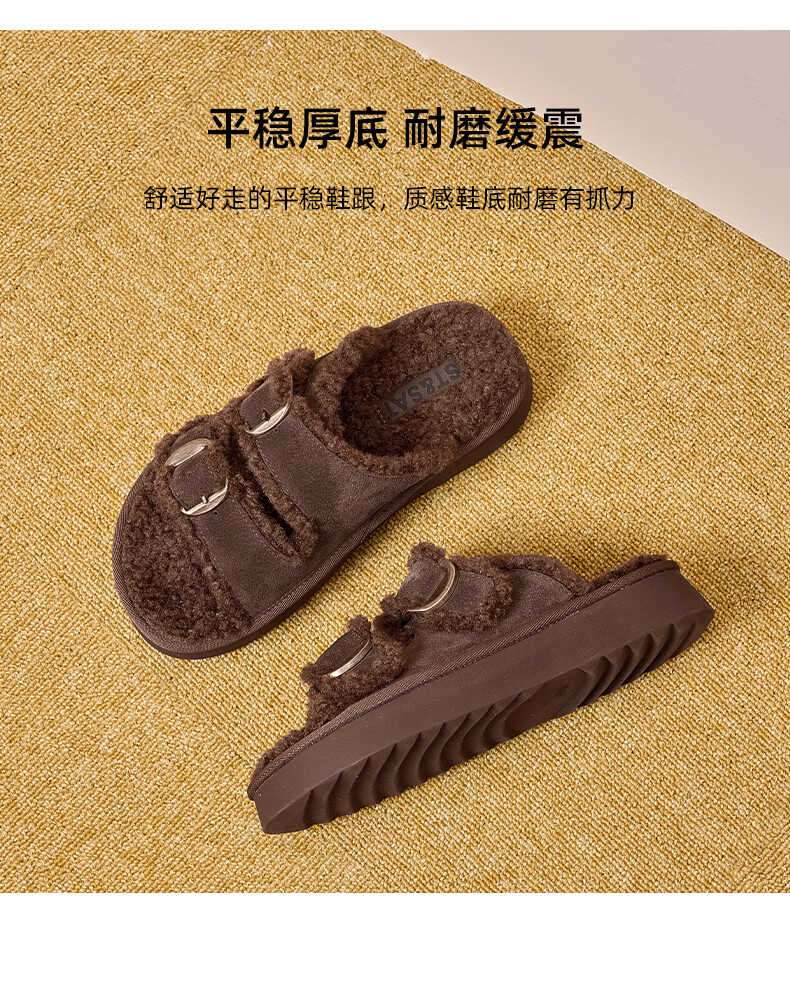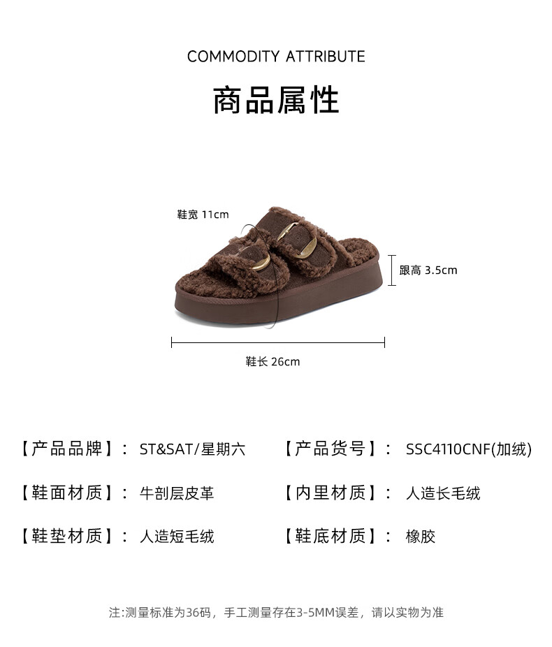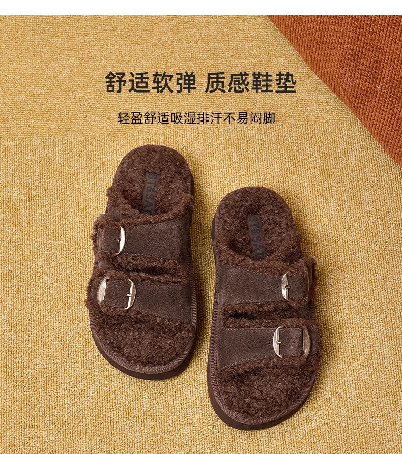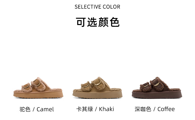 星期六加绒毛毛鞋女款2025新款秋冬季棕色复古真皮加厚拖鞋一脚蹬懒人鞋 卡其绿 【真皮牛革】跟高3.5cm 37