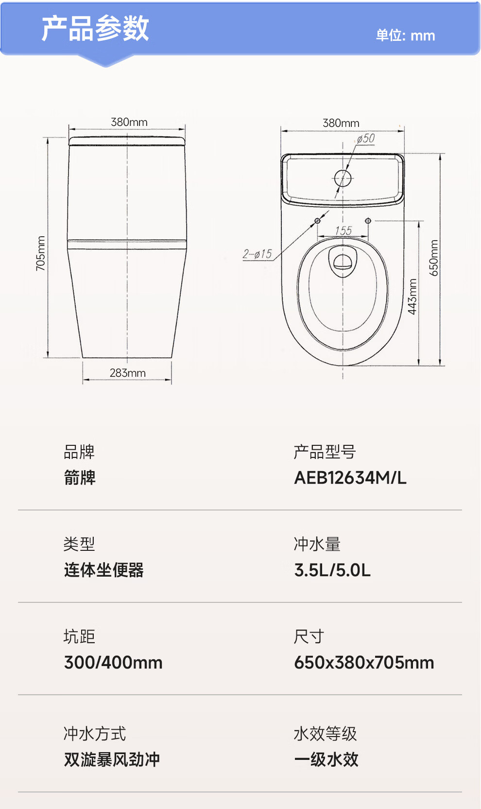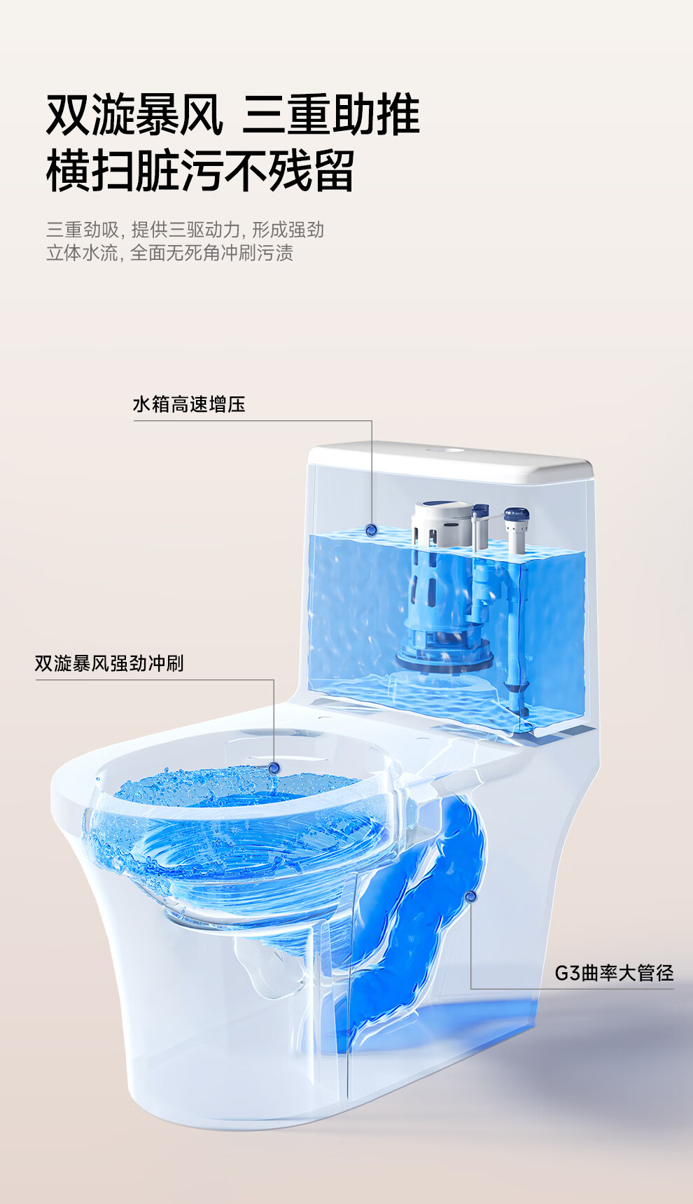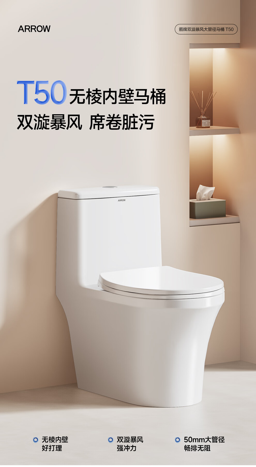 箭牌(ARROW)卫浴超大冲力喷射虹吸式加大加粗管径无棱内壁马桶缓降盖板坐便器 暴风劲冲无棱内壁大管径12634 305mm