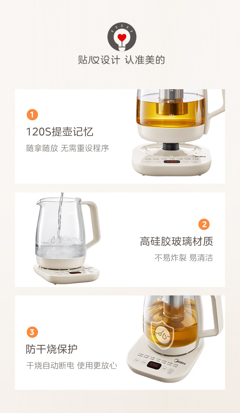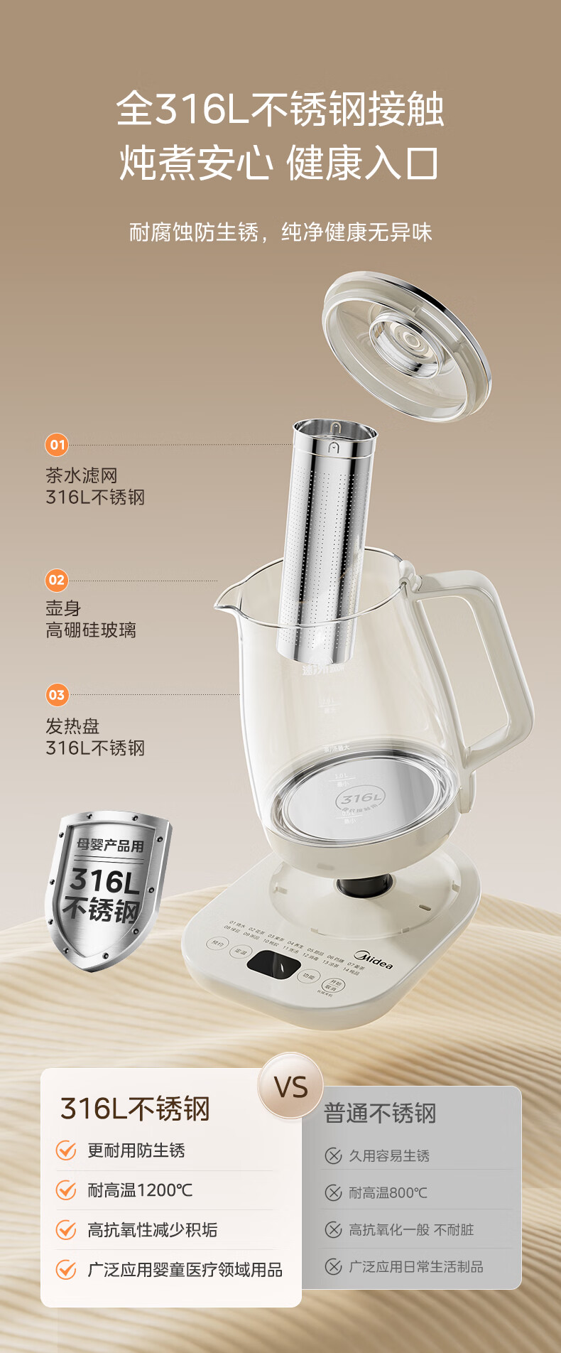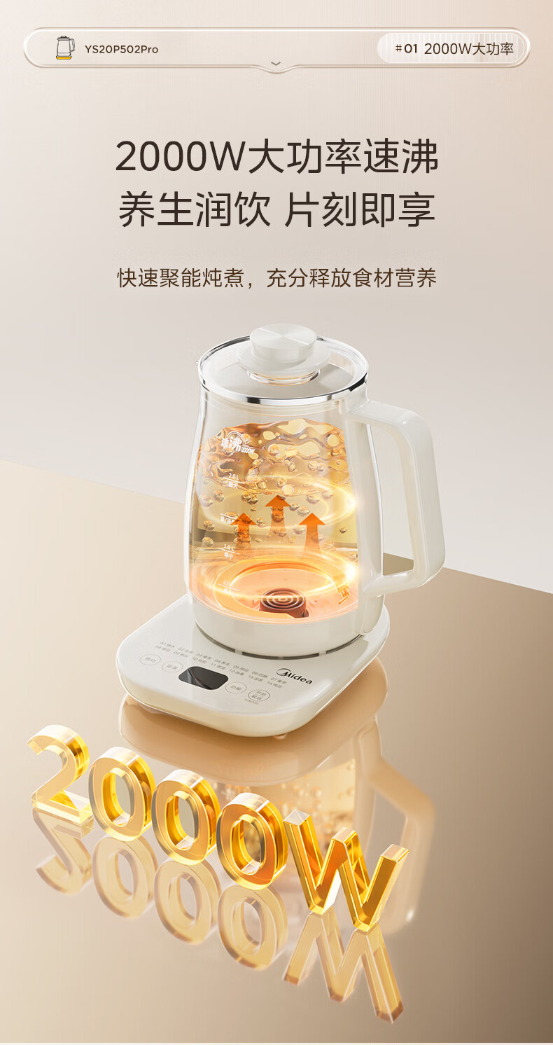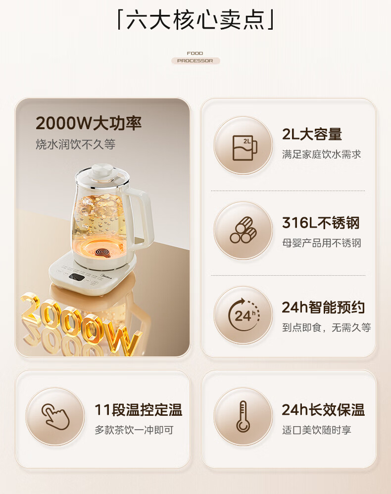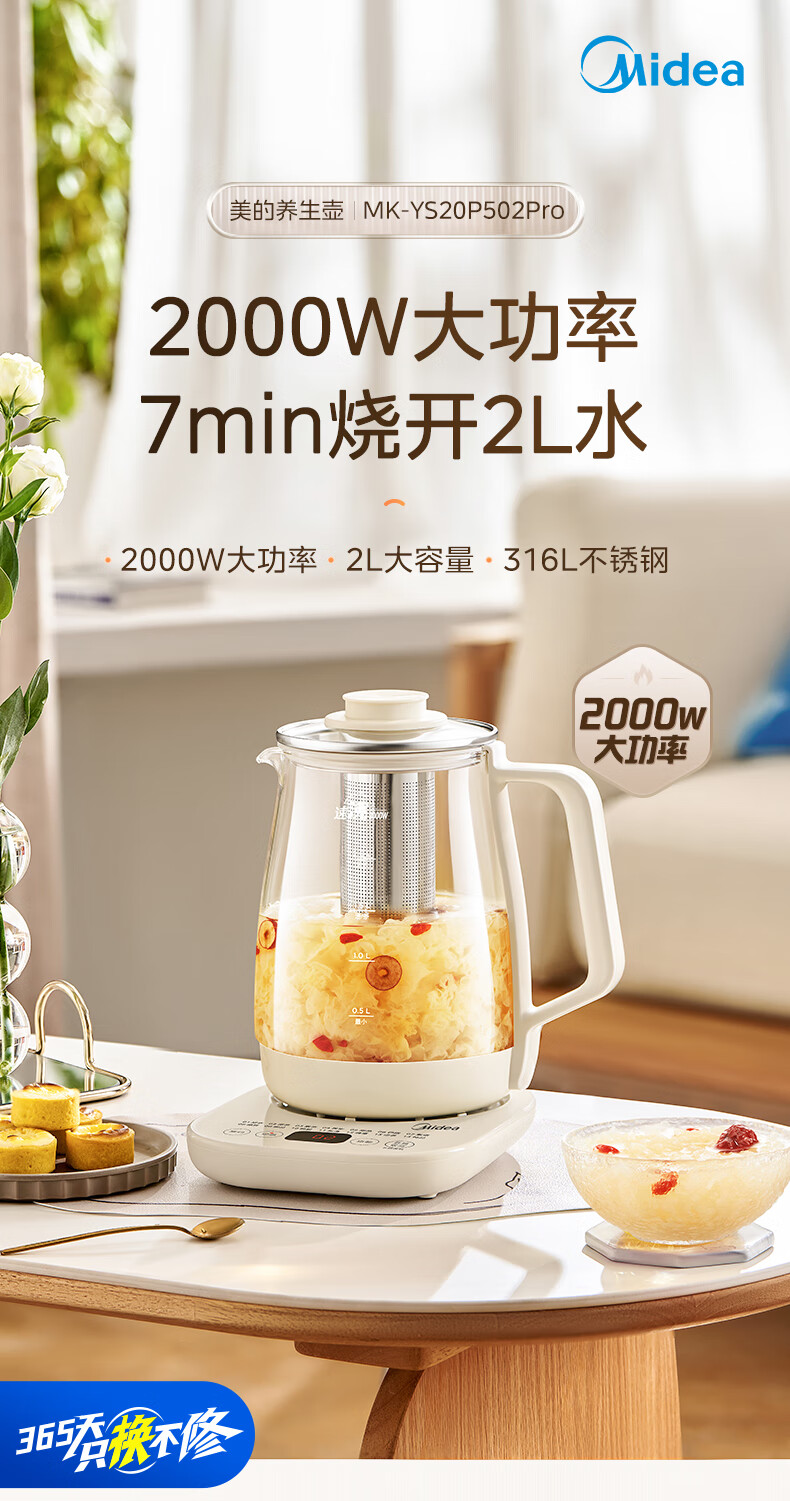 美的(Midea)养生壶2L大容量炖煮壶一体烧水壶恒温保温家用自动办公室花茶壶玻璃煮茶器316L不锈钢 【旗舰新品-配茶漏】 2L