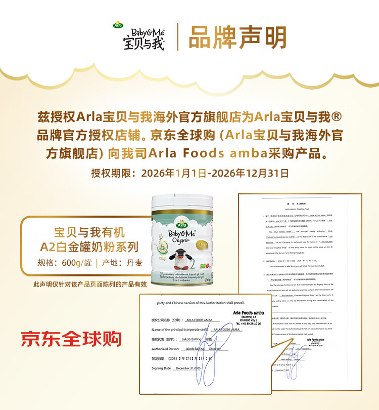 Arla(宝贝与我)有机A2丹麦阿拉婴幼儿奶粉白金罐2段(6-12月)600g*6罐【效期27年5月】