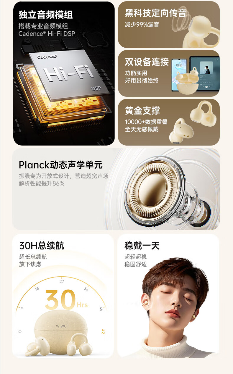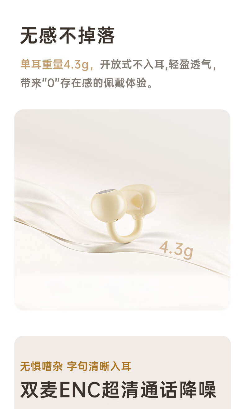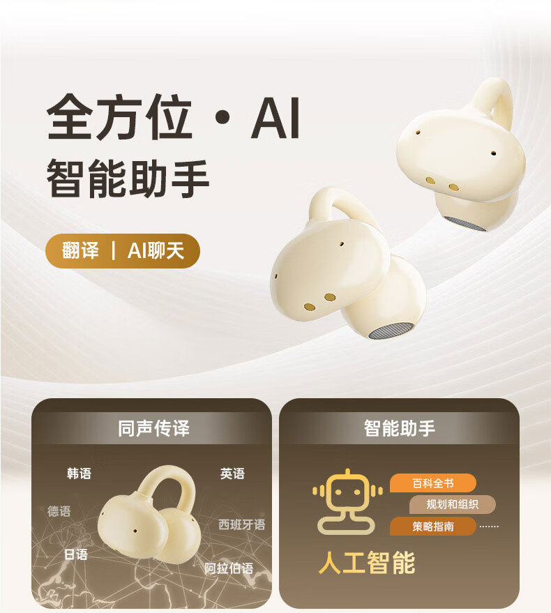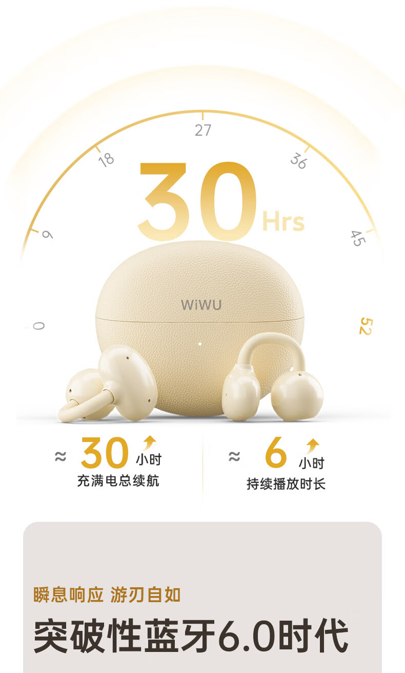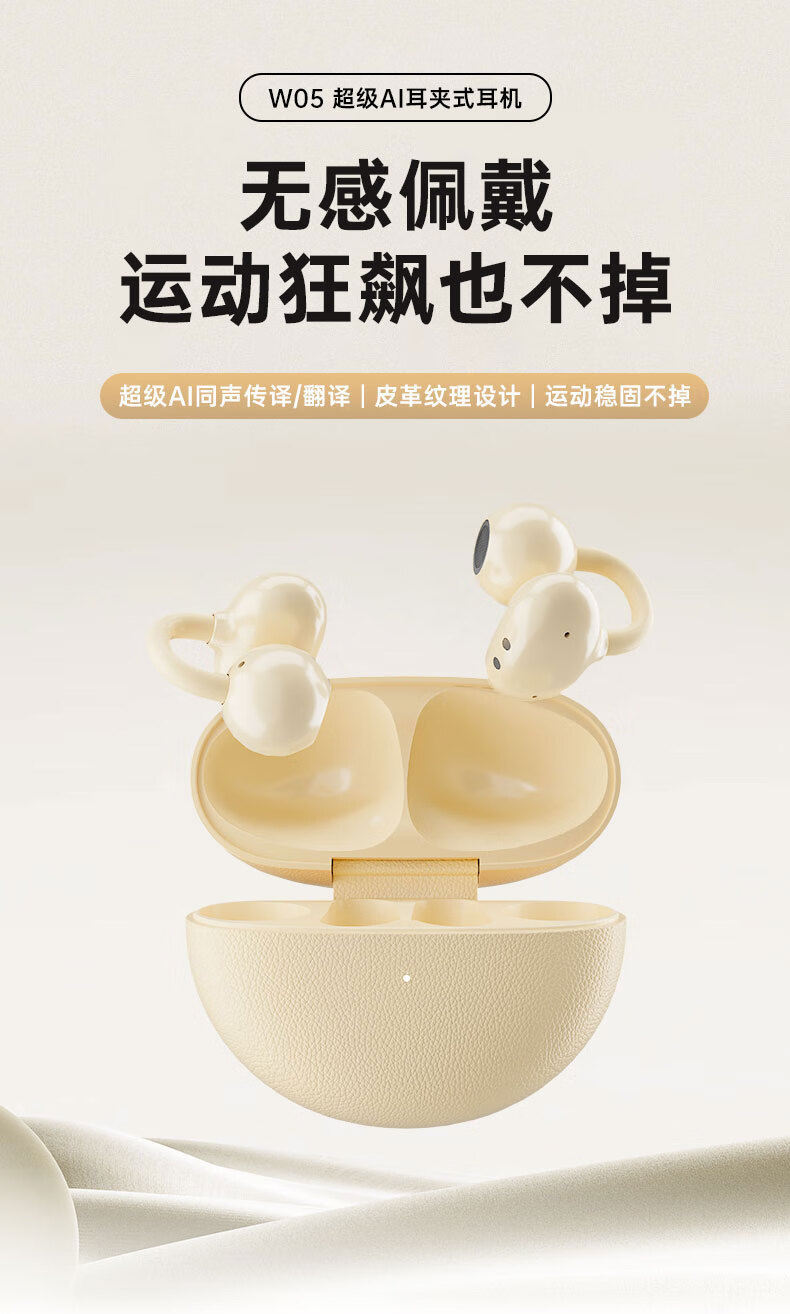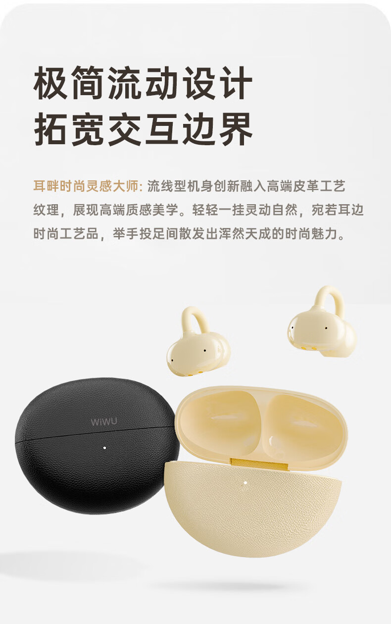 WIWU【超级AI同声传译】小云朵耳夹式蓝牙耳机降噪运动夹耳式耳机不入耳开放式骨传导概念适用苹果安卓 米白色【超级AI同声传译+皮革纹理设计】