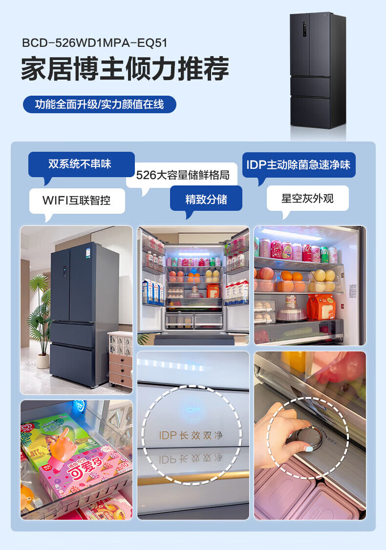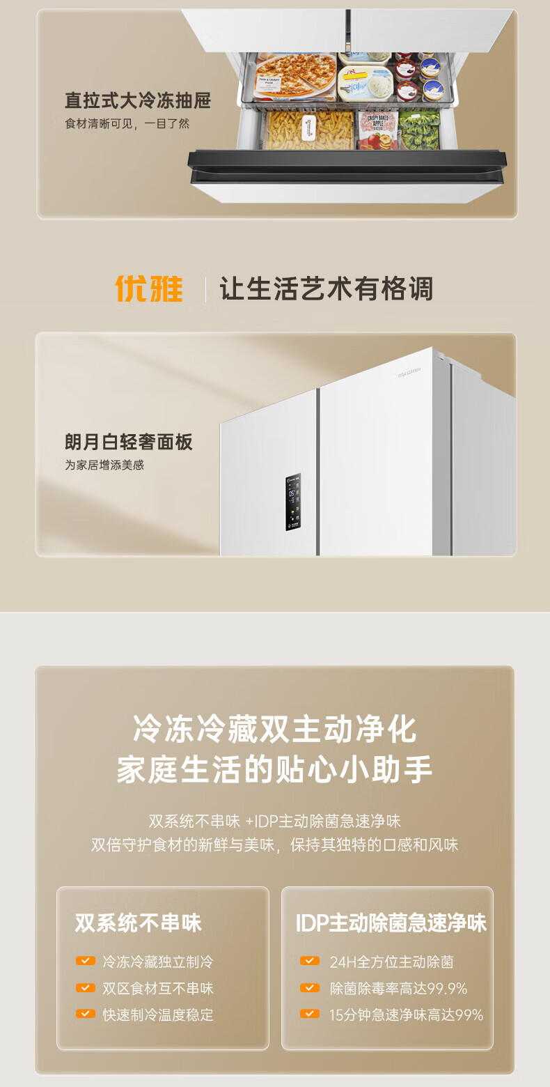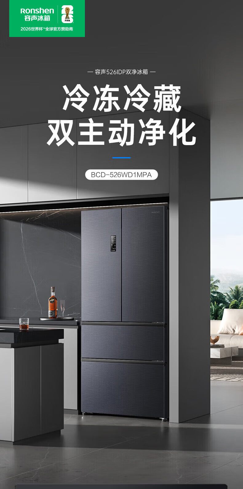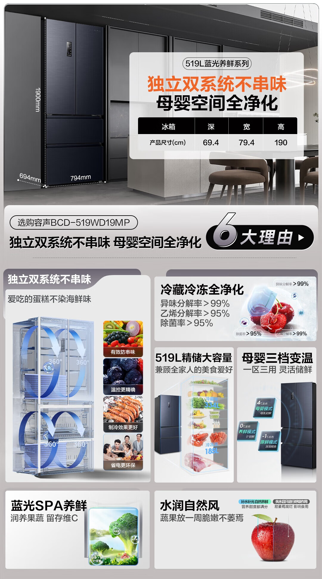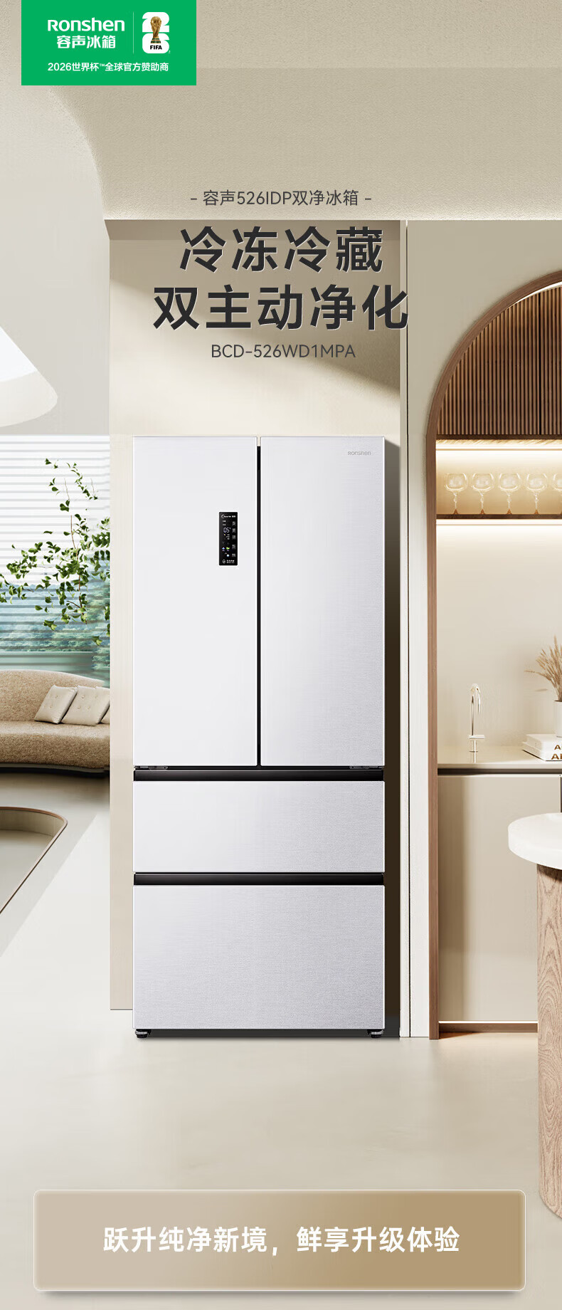 容声冰箱526L法式多门四门风冷无霜双循环一级变频家用母婴净味嵌入式电冰箱补贴 以旧换新 双净双系统IDP除菌净味BCD-526WD1MPA
