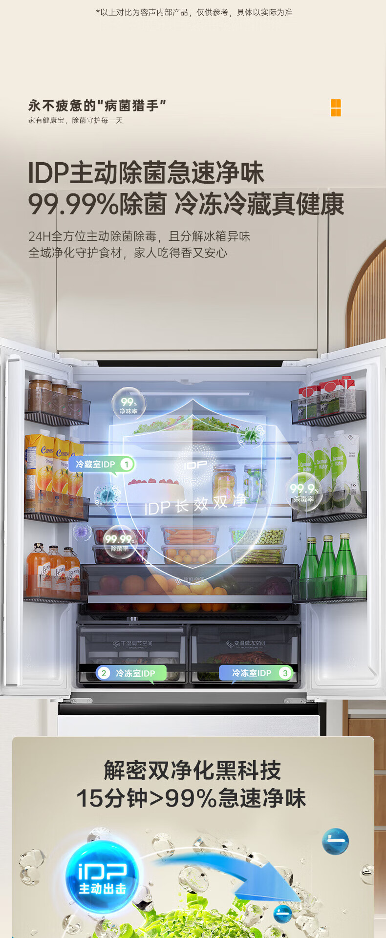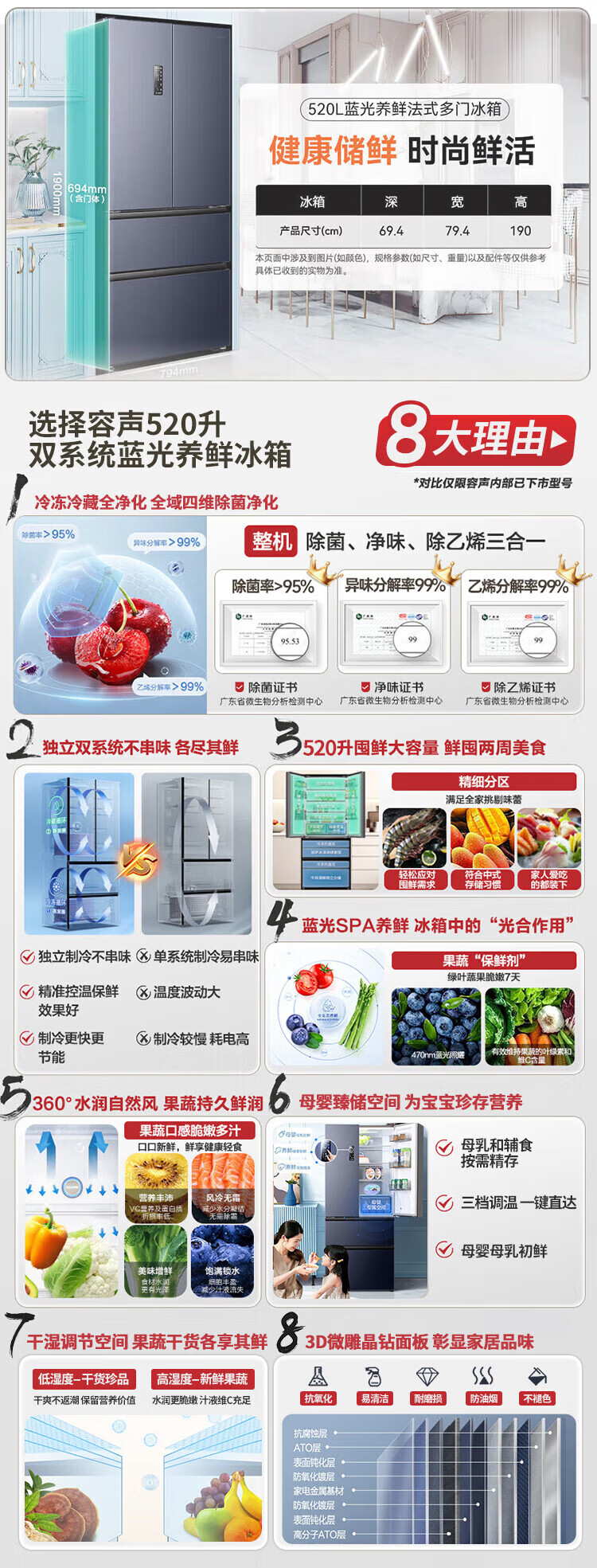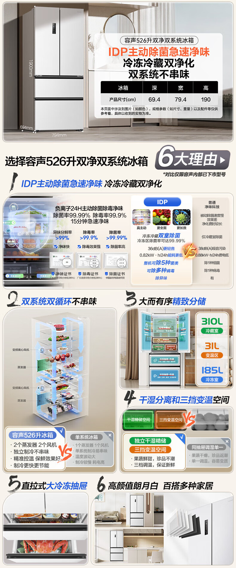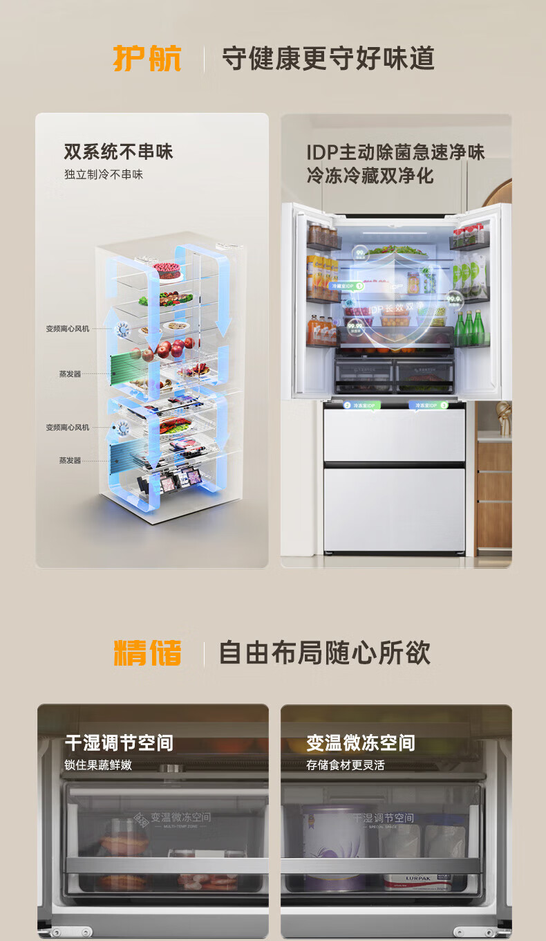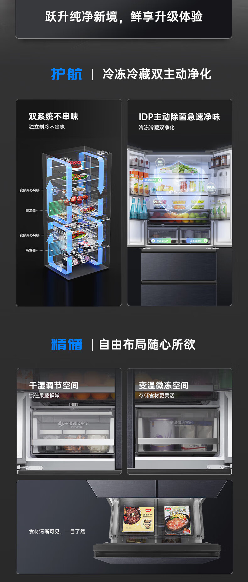 容声冰箱526L法式多门四门风冷无霜双循环一级变频家用母婴净味嵌入式电冰箱补贴 以旧换新 双净双系统IDP除菌净味BCD-526WD1MPA