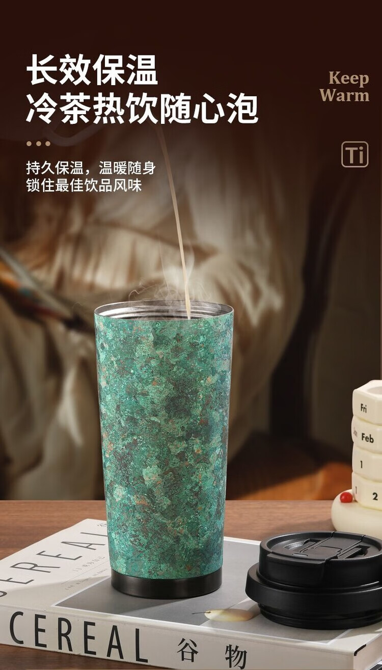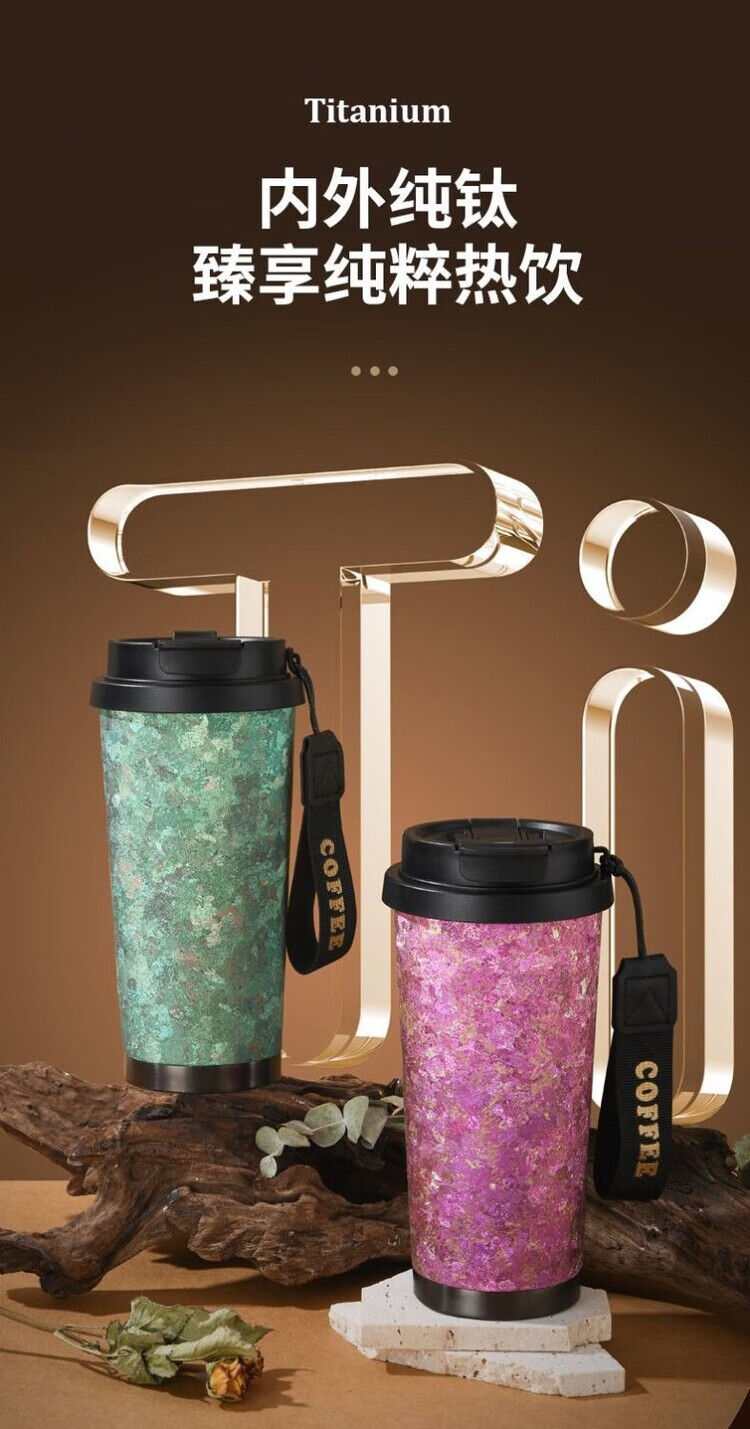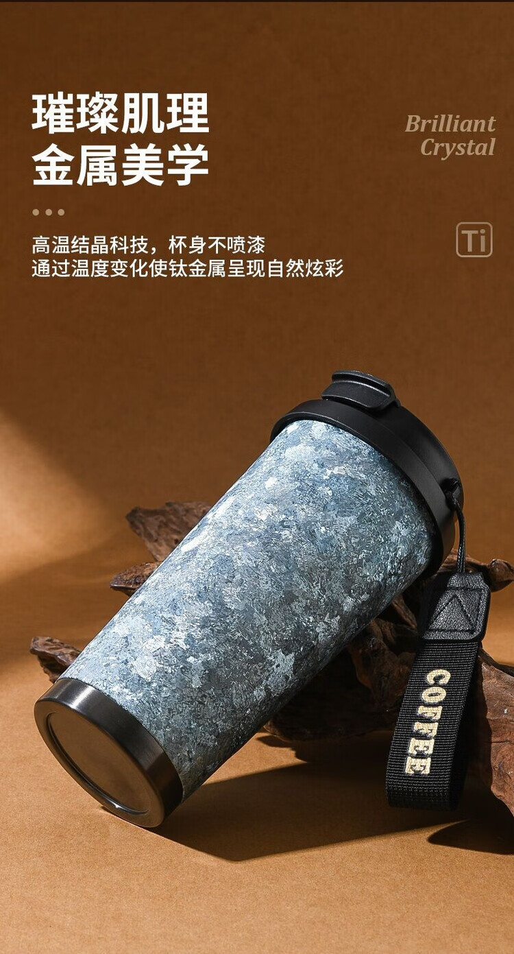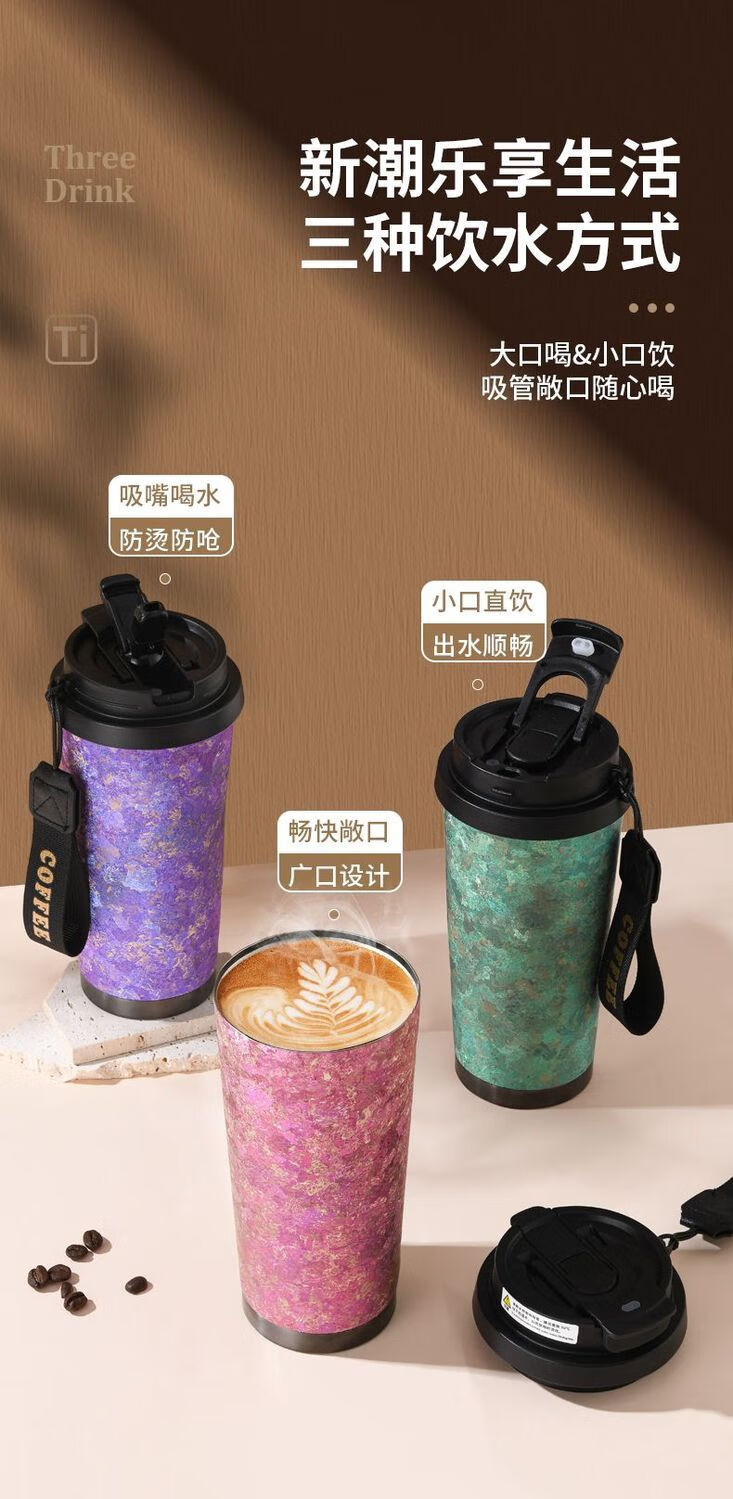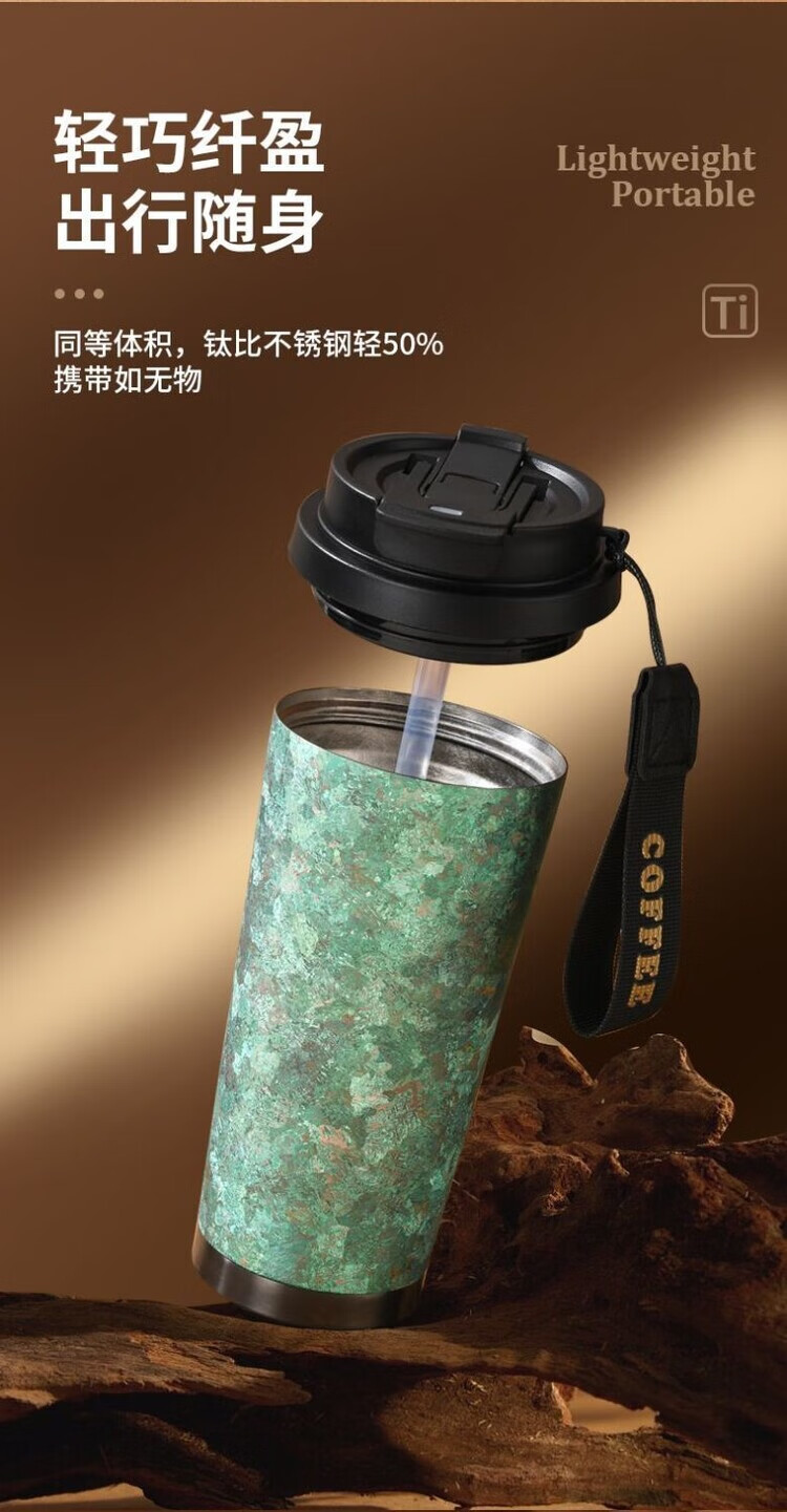 简漾纯钛咖啡杯内外纯钛新款保温水杯车载大容量吸管杯外带随行钛杯子 500ml 黑盖纯色小结晶提绳+吸管