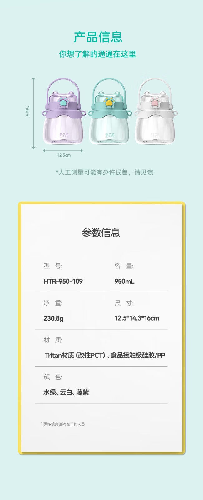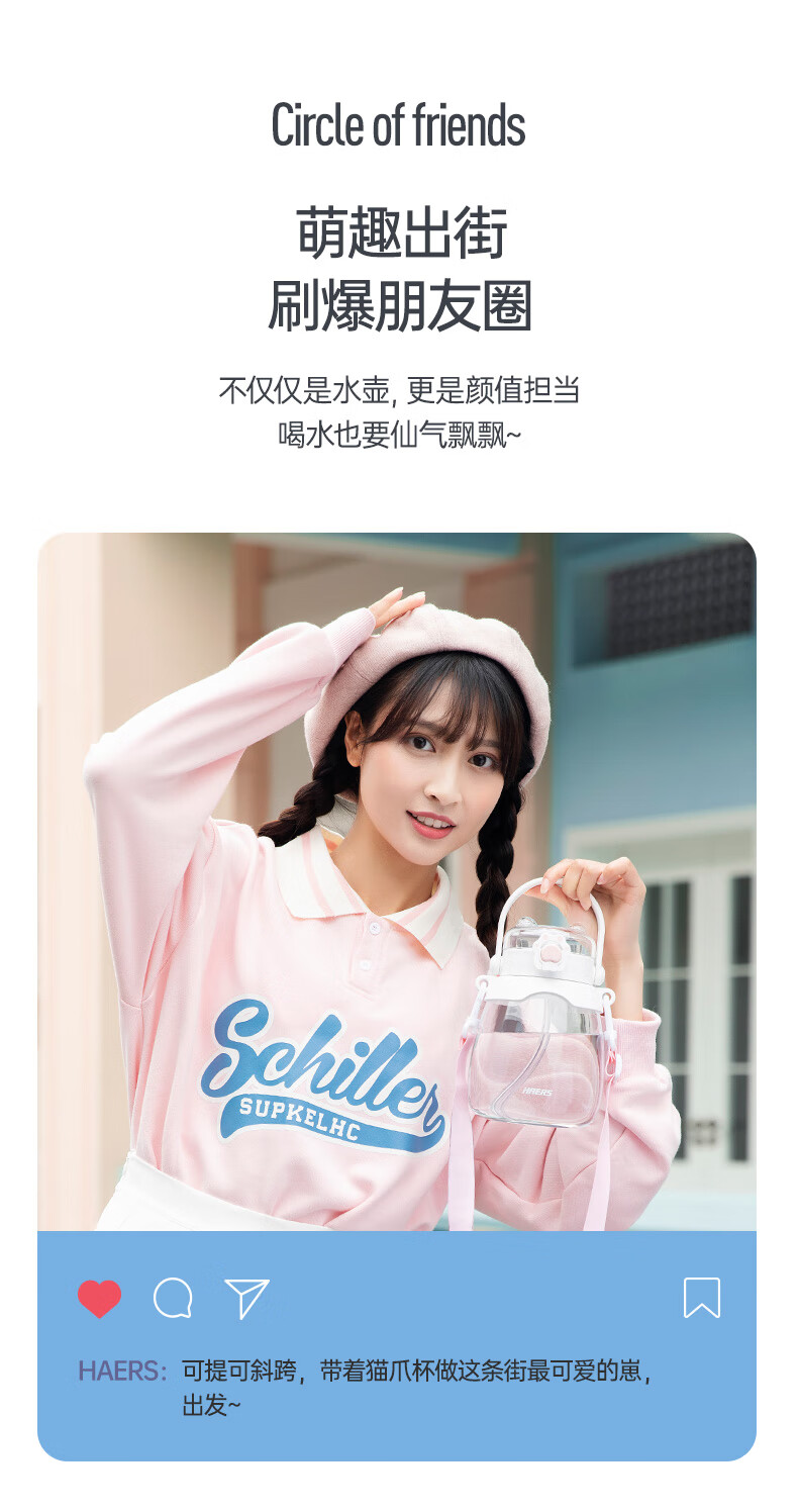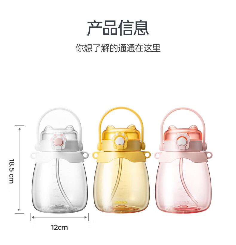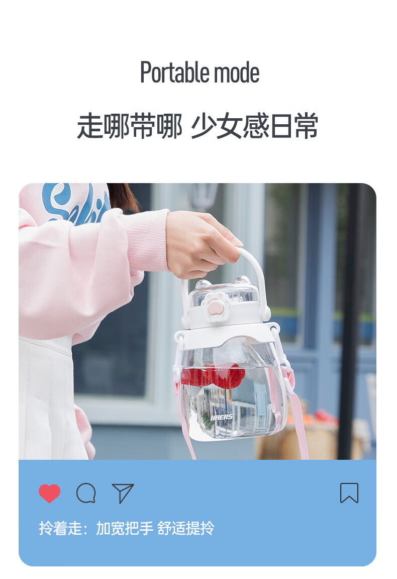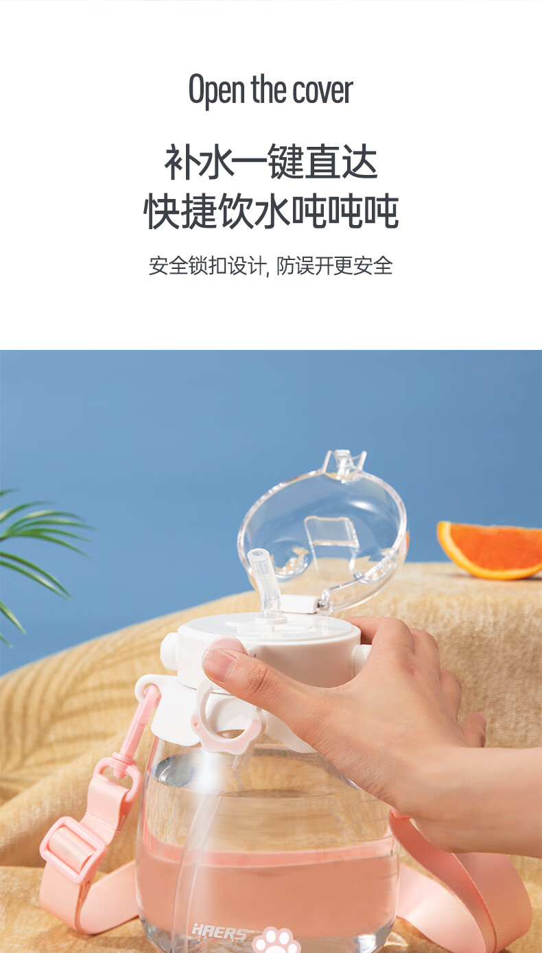 哈尔斯(HAERS)大肚杯塑料杯大容量水杯女吸管杯儿童学生水杯 云白950ML tritan材质