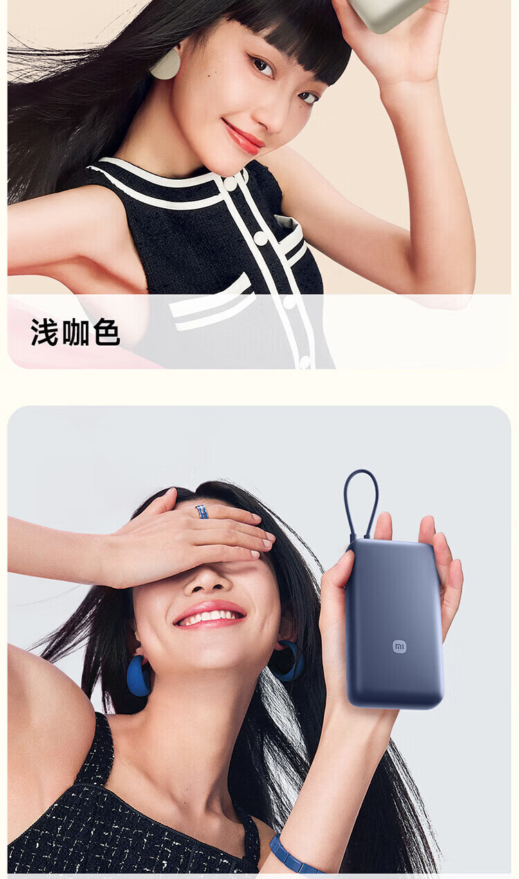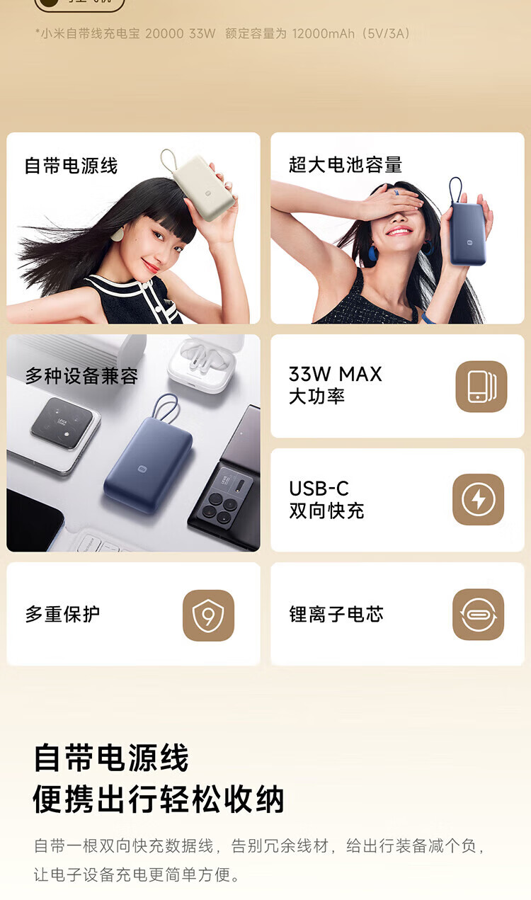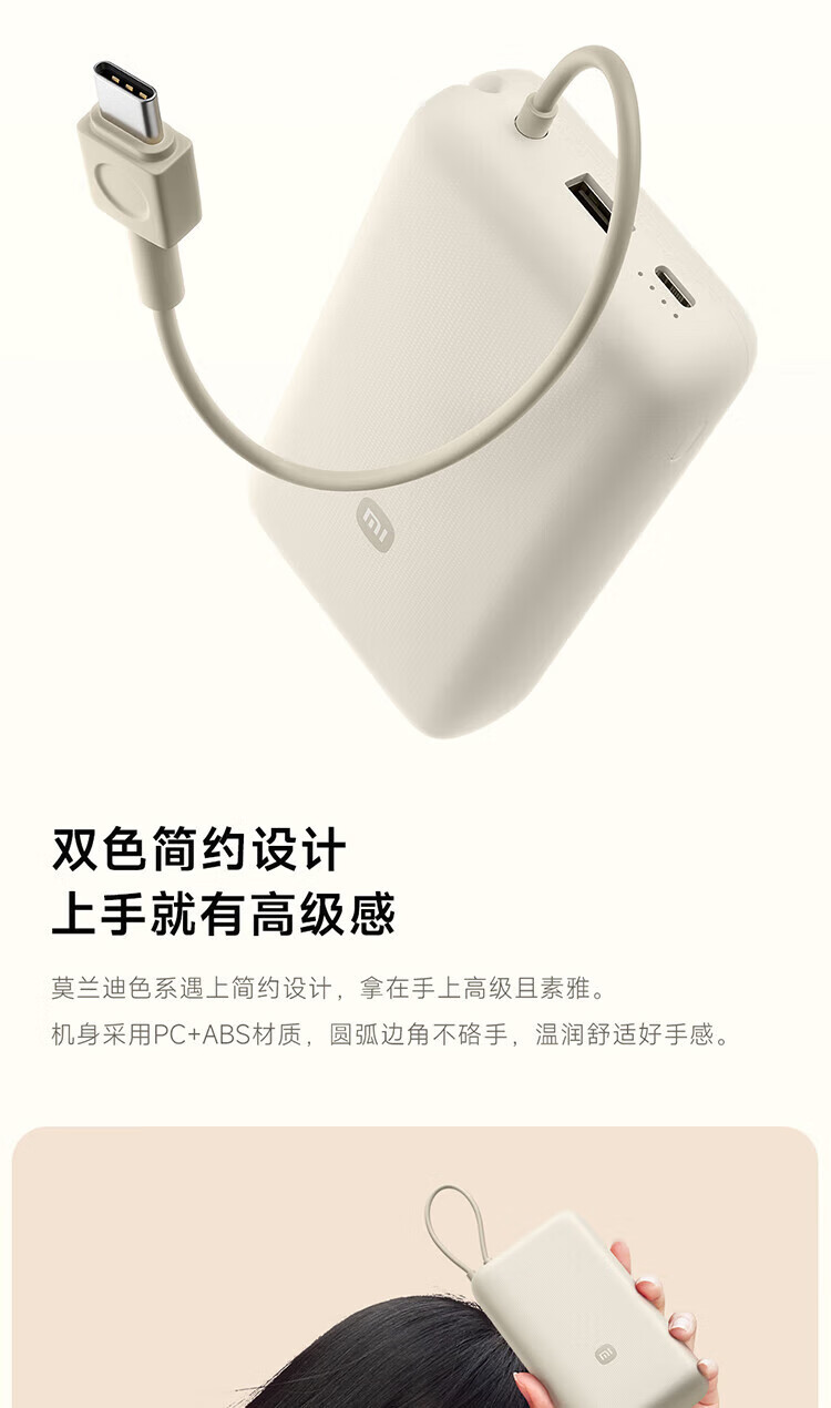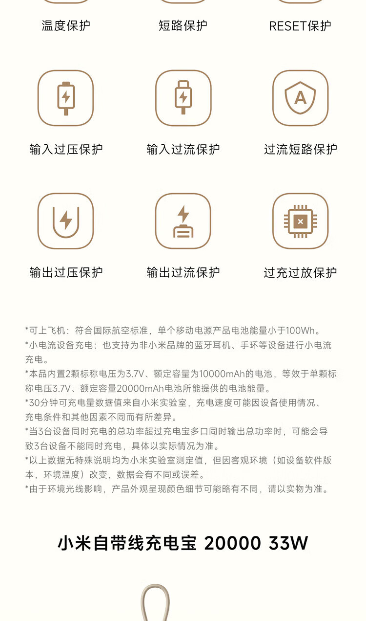 小米【3C认证】自带线充电宝20000毫安口袋便携大容量双快充移动电源 20000 浅咖色33W
