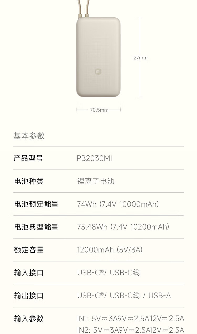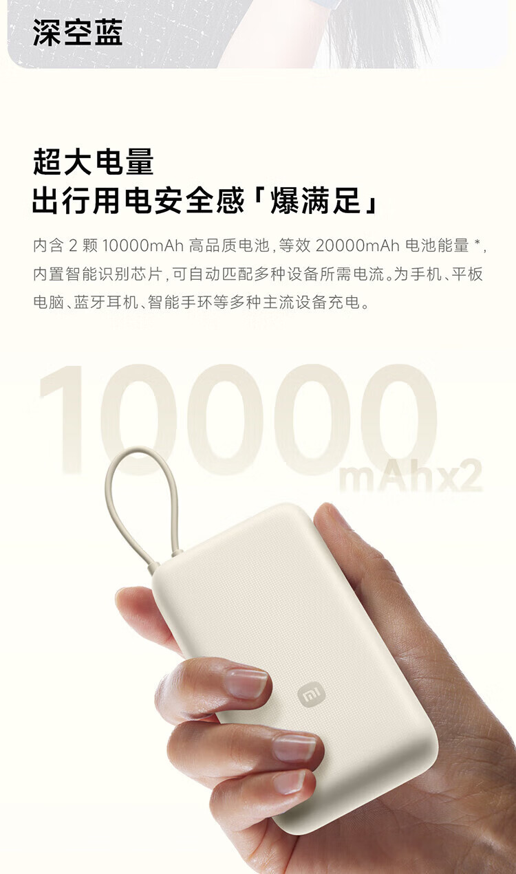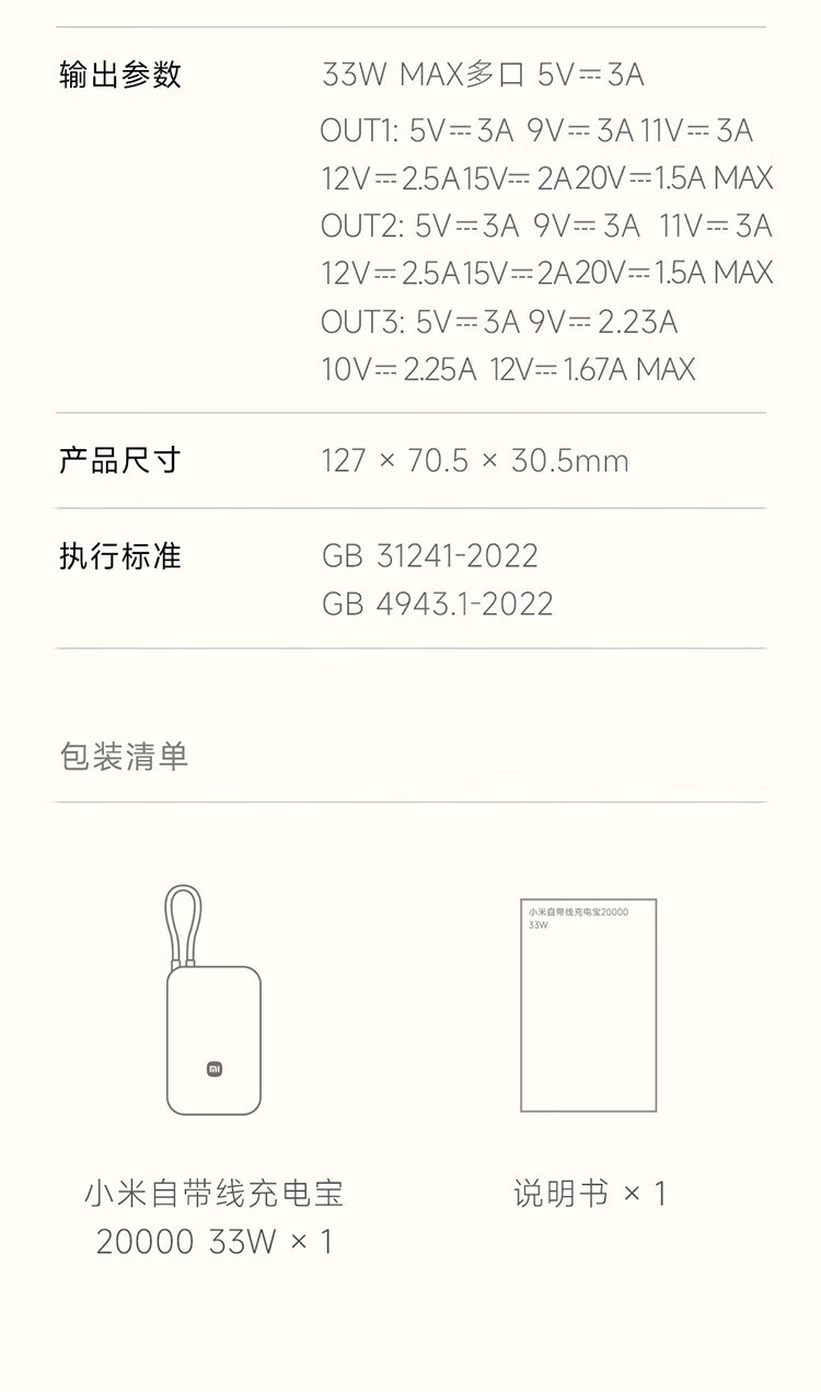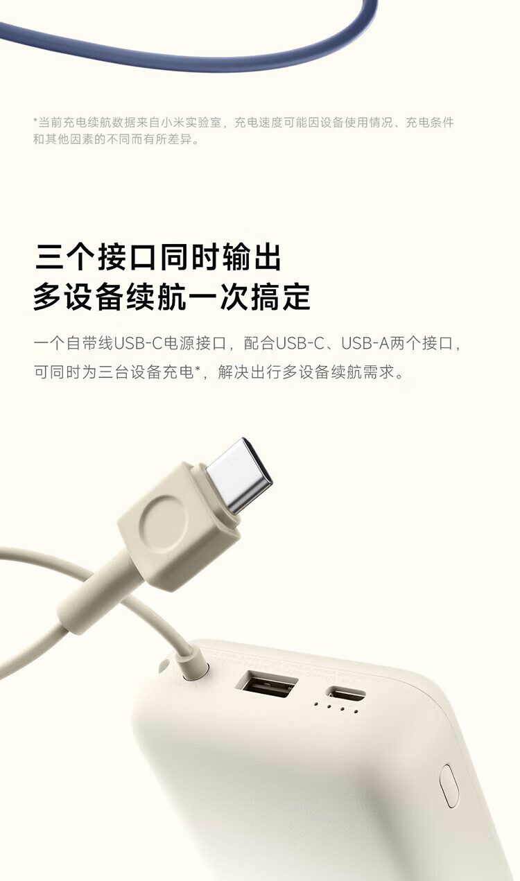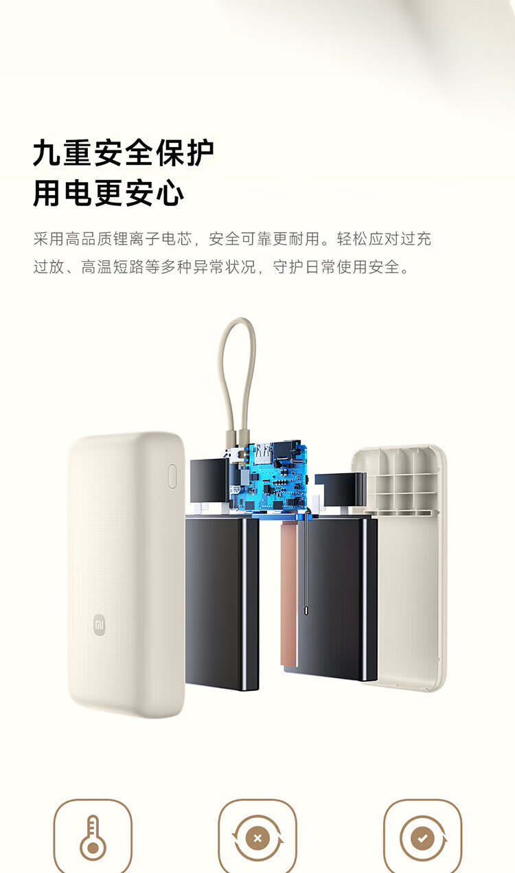 小米【3C认证】自带线充电宝20000毫安口袋便携大容量双快充移动电源 20000 浅咖色33W
