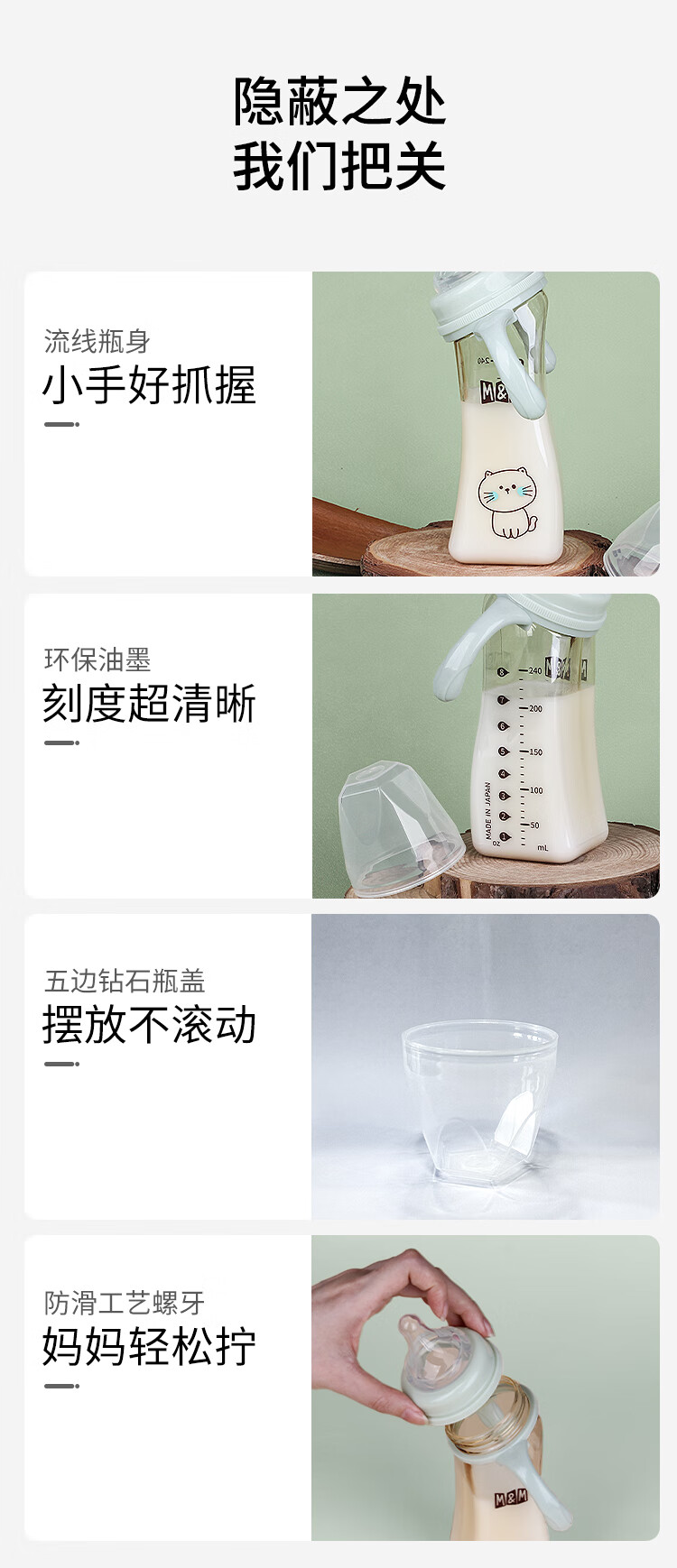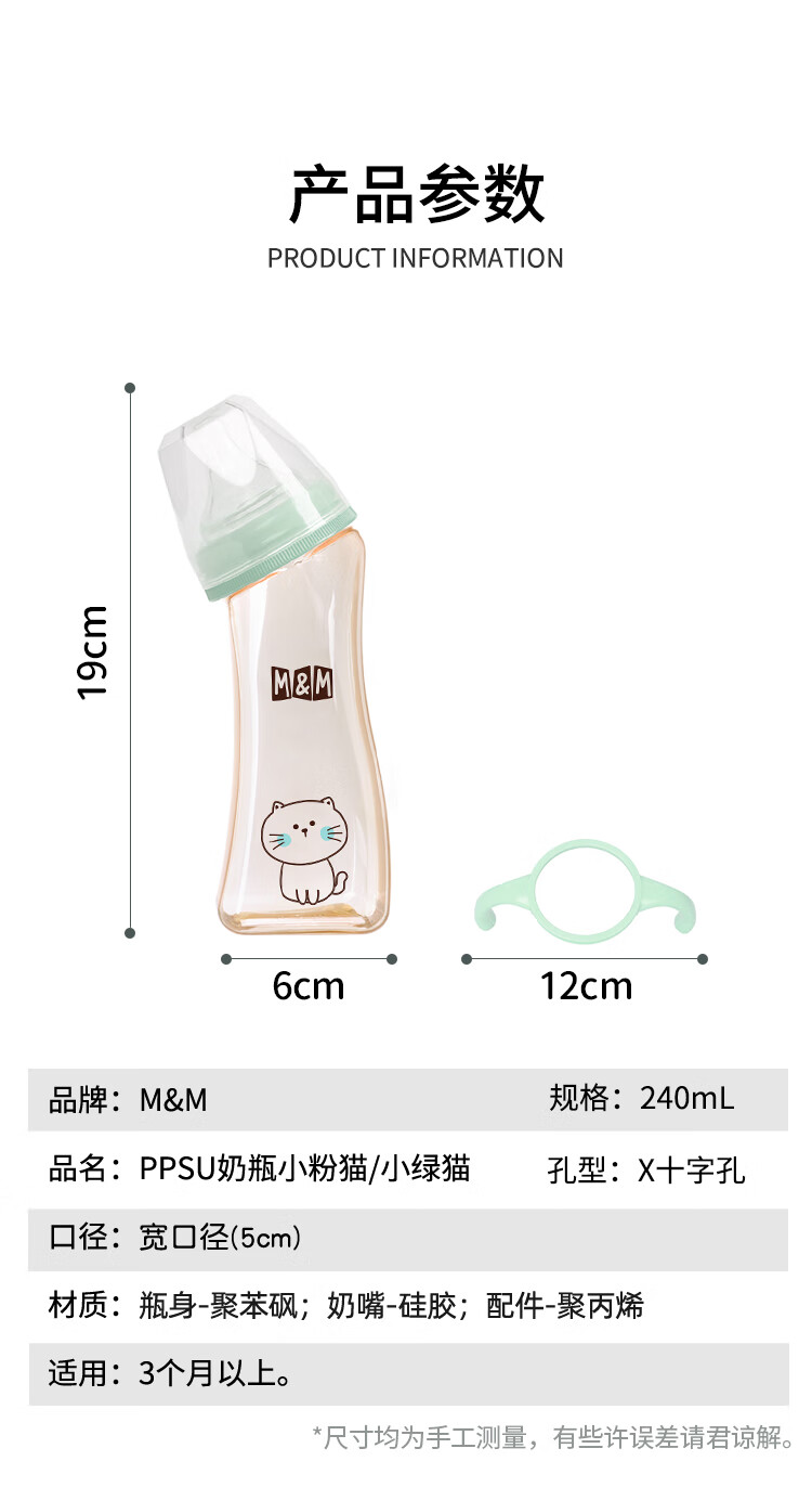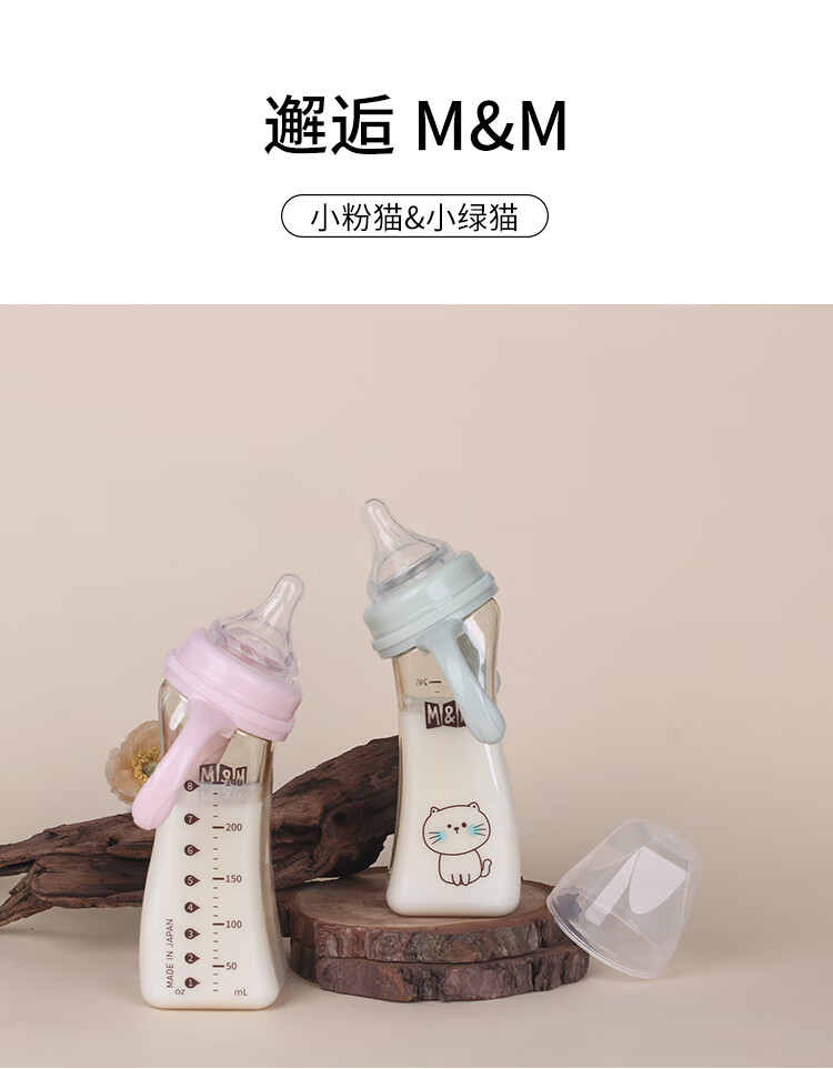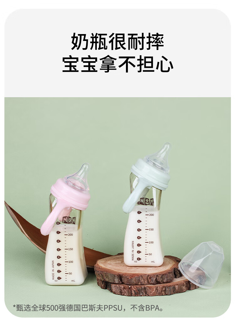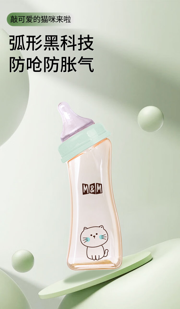 M&M防胀气奶瓶新生儿PPSU宽口径耐摔带手柄婴儿mm弧形奶瓶呛奶用 乖乖兔 240ml 0-6个月(自带S号+M号奶嘴)