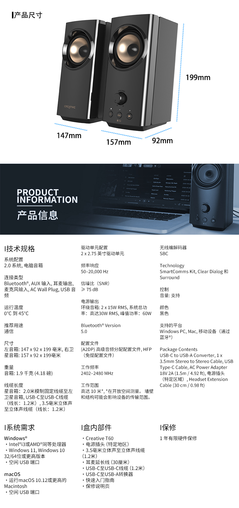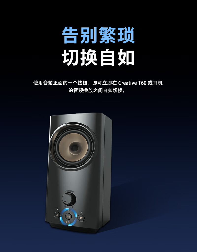 创新(Creative) T60桌面蓝牙音箱2.0HIFI沉浸环绕多声道重低音发烧级电脑家用音响